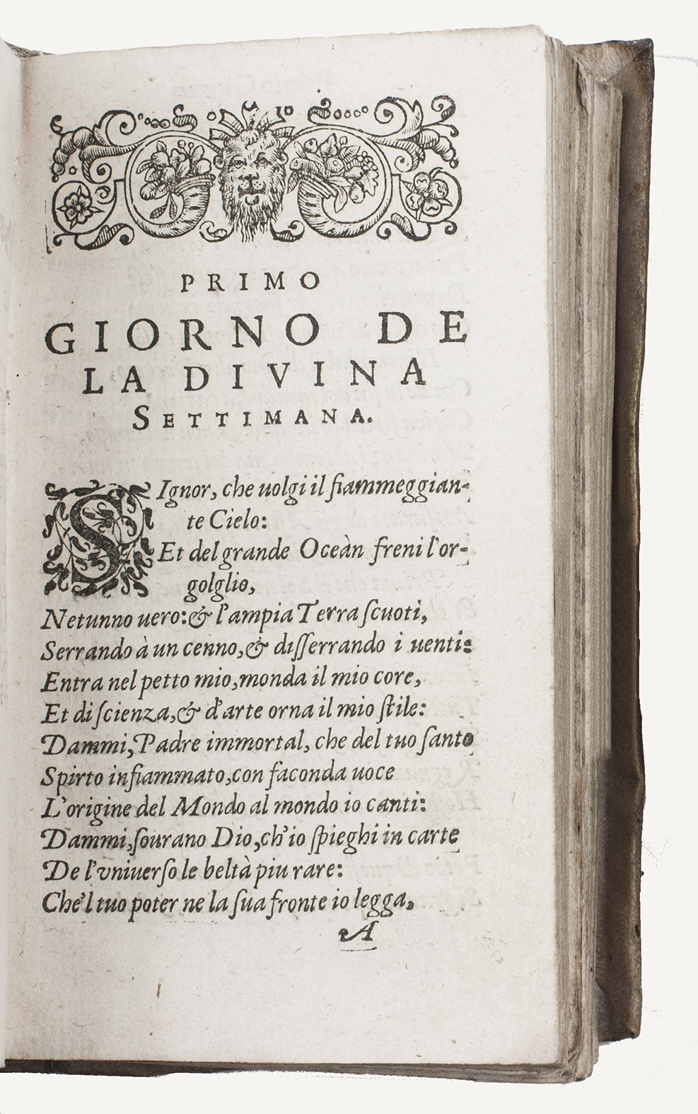 First edition of the Italian translation by Ferrante Guisone of Du Bartas's world-famous La Sepmaine, ou création du monde (1578), an epic poem on the creation of the world, divided into seven parts, for each of the seven days of creation. Guillaume de Salluste du Bartas (1549-1590) was one of the most important French Renaissance poets and a Huguenot soldier under King Henry IV. La Sepmaine is his most celebrated work.