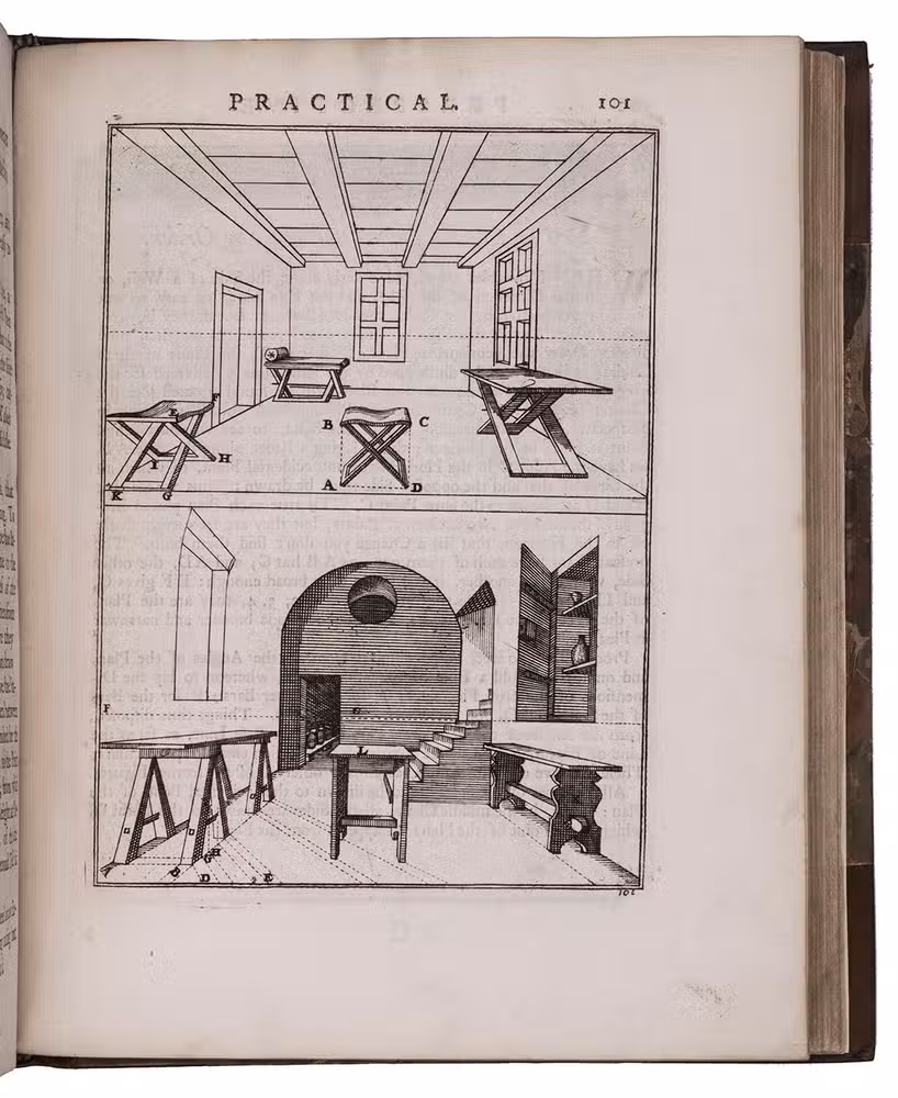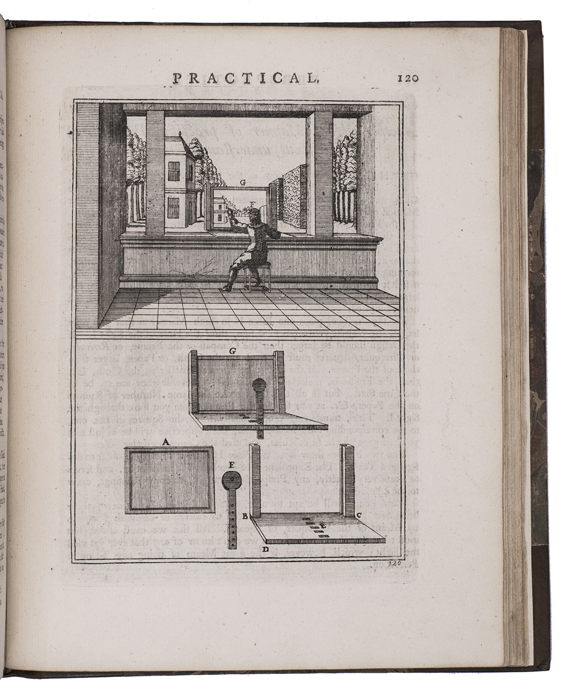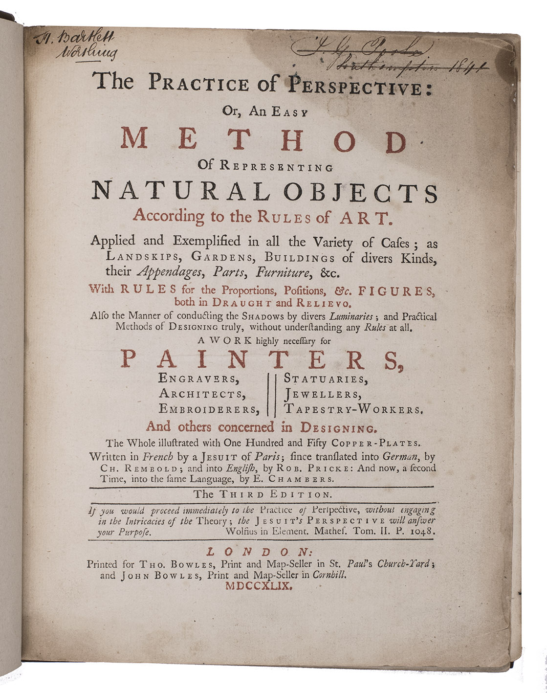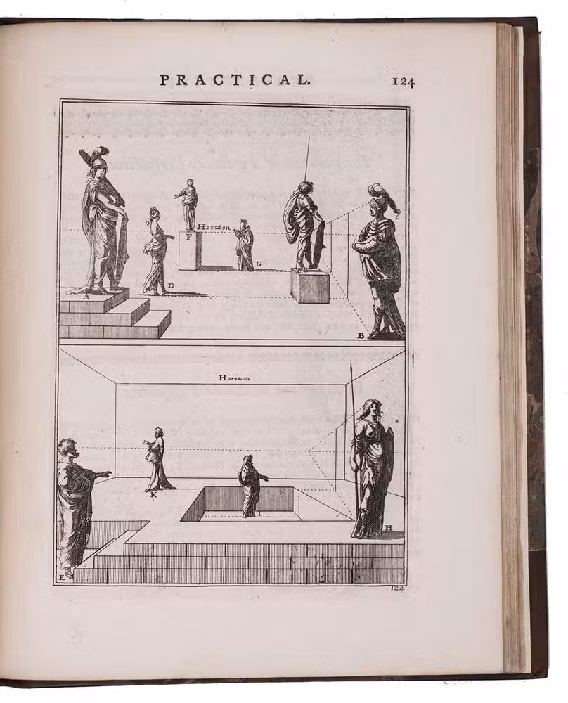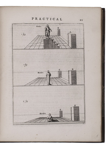 "Third" [recté fourth] edition of the second English translation (by the encyclopaedist Ephraim Chambers) of one of the most influential handbooks of perspective ever published: Le perspective practique (Paris, 1642) by the Jesuit mathematician Jean Dubreuil (1602-1670). "Probably the most influential [work on perspective] ever published expressly for the use of a lay audience" (Millard), it is clearly and thoroughly illustrated with 150 full-page engravings printed from the original plates of the 1672 English edition, which were copied in mirror image from the original 1642 edition, plus 2 folding plates illustrating Hodgson's essay. It was especially important in England, where Robert Pricke published a translation already in 1672 and Chambers published the present improved translation in 1726. The title page describes it as "highly necessary for painters, engravers, architects, embroiderers, statuaries, jewellers, tapestry-workers, and others concerned in designing." The 1739 edition introduced the present 16-page essay on the theory of perspective by James Hodgson, a fellow of the Royal Society and one of England's leading mathematicians, as well as the two folding plates that accompany it.