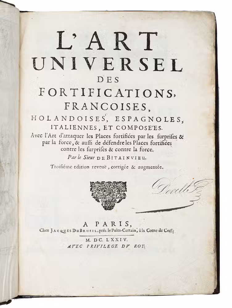 L'art universel des fortifications, Francoises, Holandoises, Espagnoles, Italiennes, et composées. Avec l'art d'attaquer les places fortifiées par les surprises & par la force, & aussi de défendre les places fortifiées contre les surprises & contre la force, par le Sieur de Bitainvieu.
