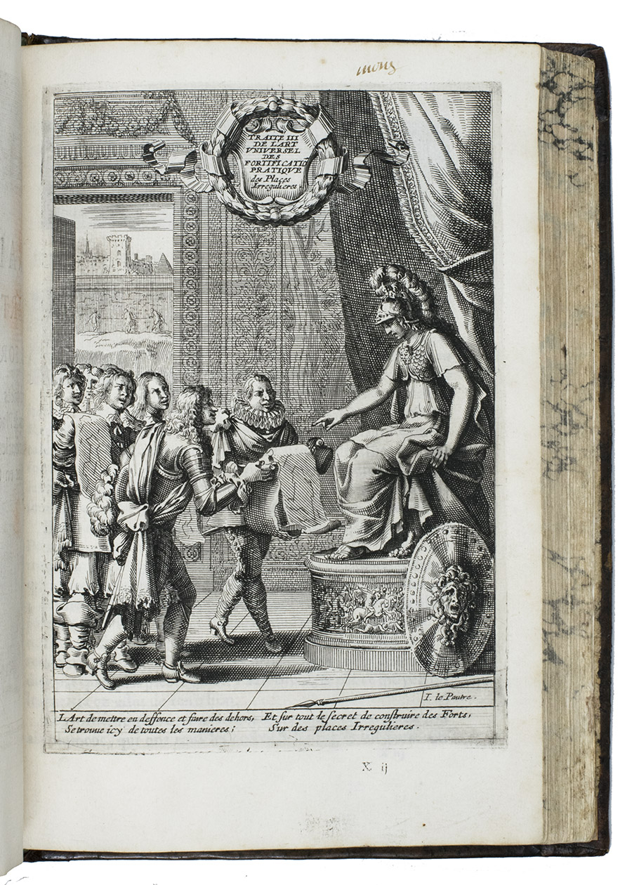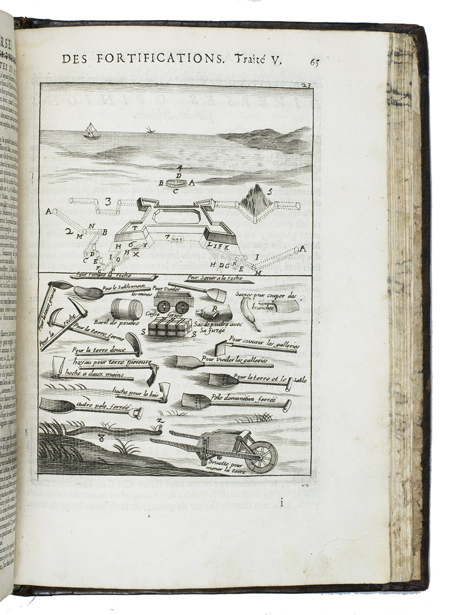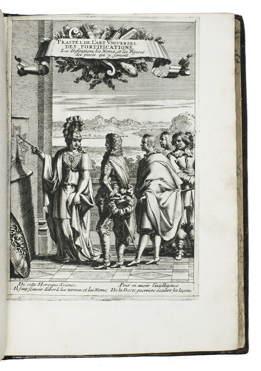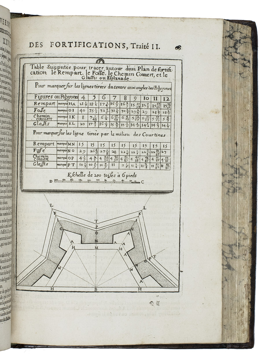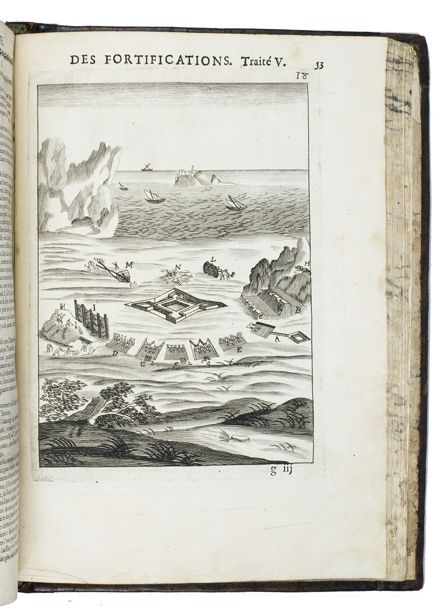 Rare complete pictorial course on military architecture, perspective drawing, fortifications and siege warfare in two main parts, the first with four and the second with two separate "treatises": Traité I: "Les definitions, les noms, les termes, et les figures des pieces & des ouvrages dont on se sert aux fortifications" (the basic elements of fortifications); Traité II: "où sont données diverses methodes pour fortifier toute figure reguliere la françoise, la hollandoise, l'espagnole, & l'italienne" (the geometric principles of designing fortifications, teaching the various methods of designing fortifications used by the French, Dutch, Spanish and Italians); Traité III: "où sont données les methodes de fortifier toutes sortes de places regulieres-irregulieres, comme sont les triangles, & celles qui sont en tout irregulieres" (the practical designing of fortifications for different sorts of sites and situations); Traité IV: "qui donne la methode pour élever les plans des fortifications, & les faire paroistre sur le papier, comme elles sont en effet sur la terre" (perspective for representing fortifications on paper, with perspective views on 9 full-page plates); Traité V: "L'art d'attaquer les places fortifiées et par la force"; Traité VI: "L'art de defendre les [places fortifiées en contre la force" (the attack and defence of fortified sites respectively, including all sorts of military devices and weaponry).