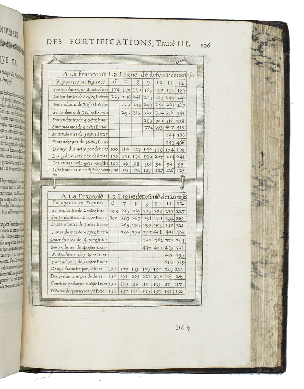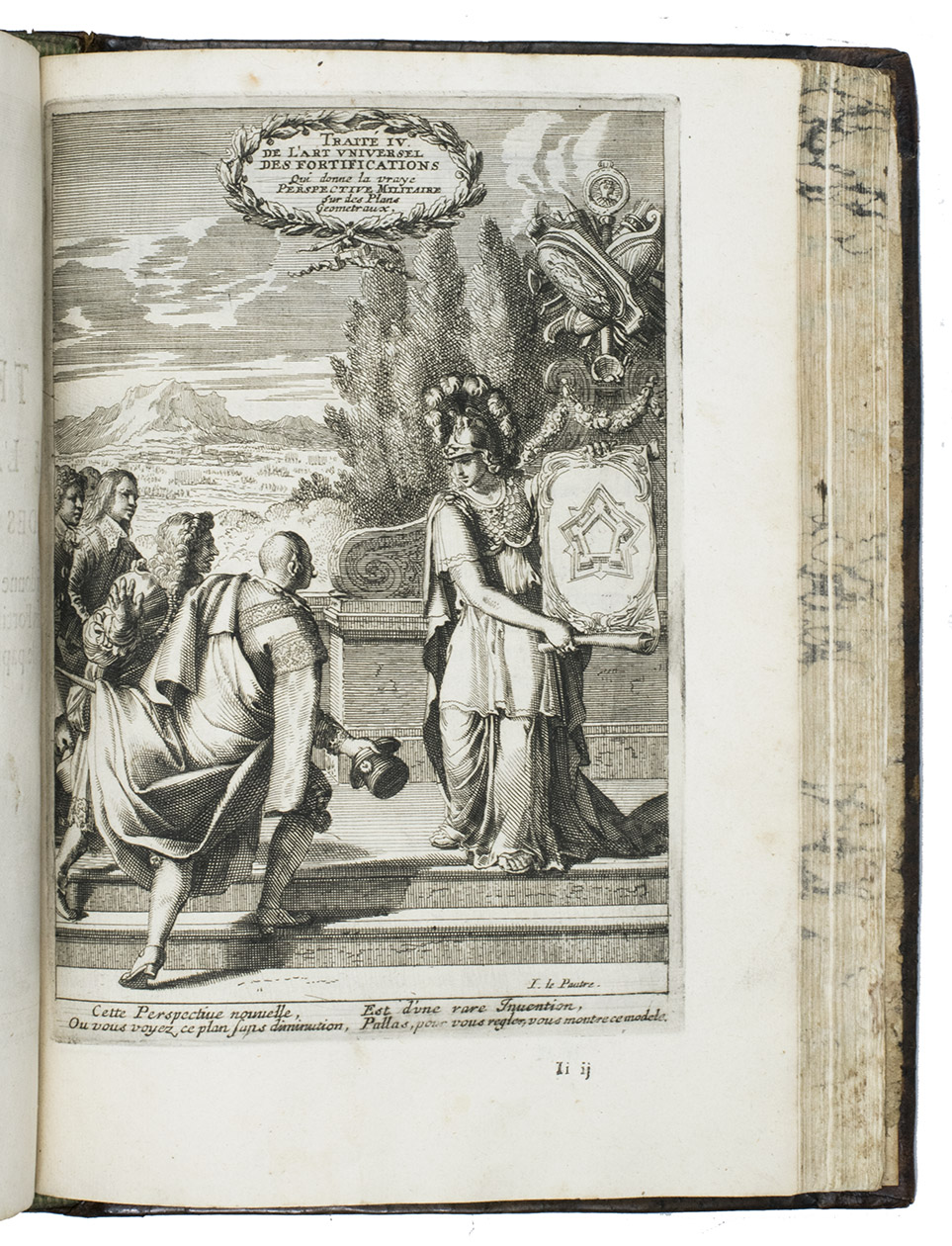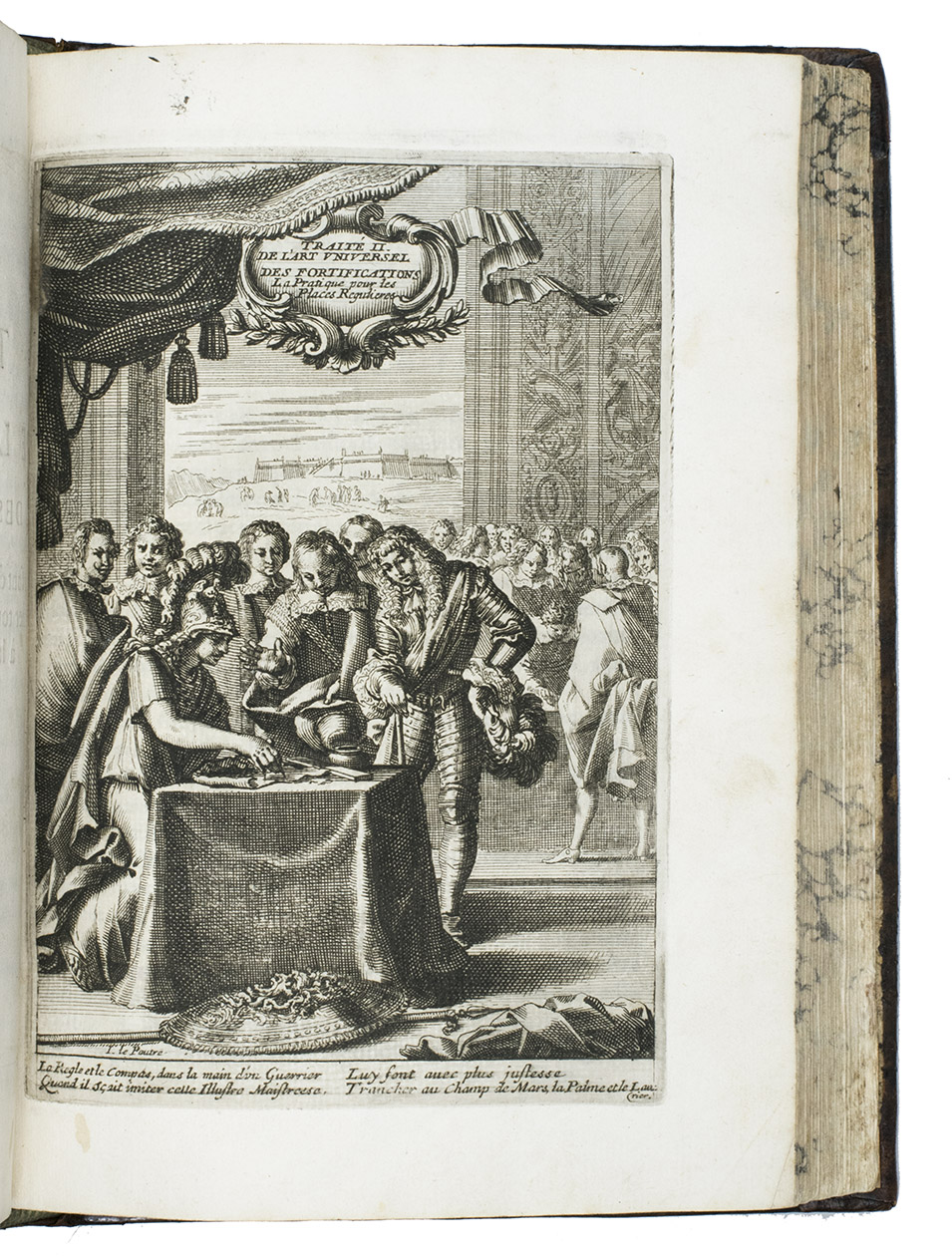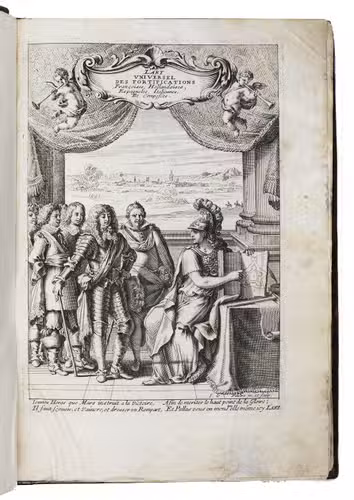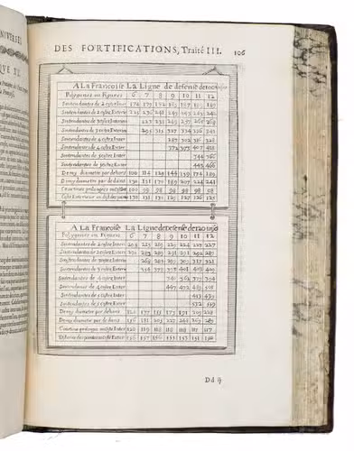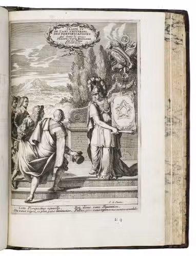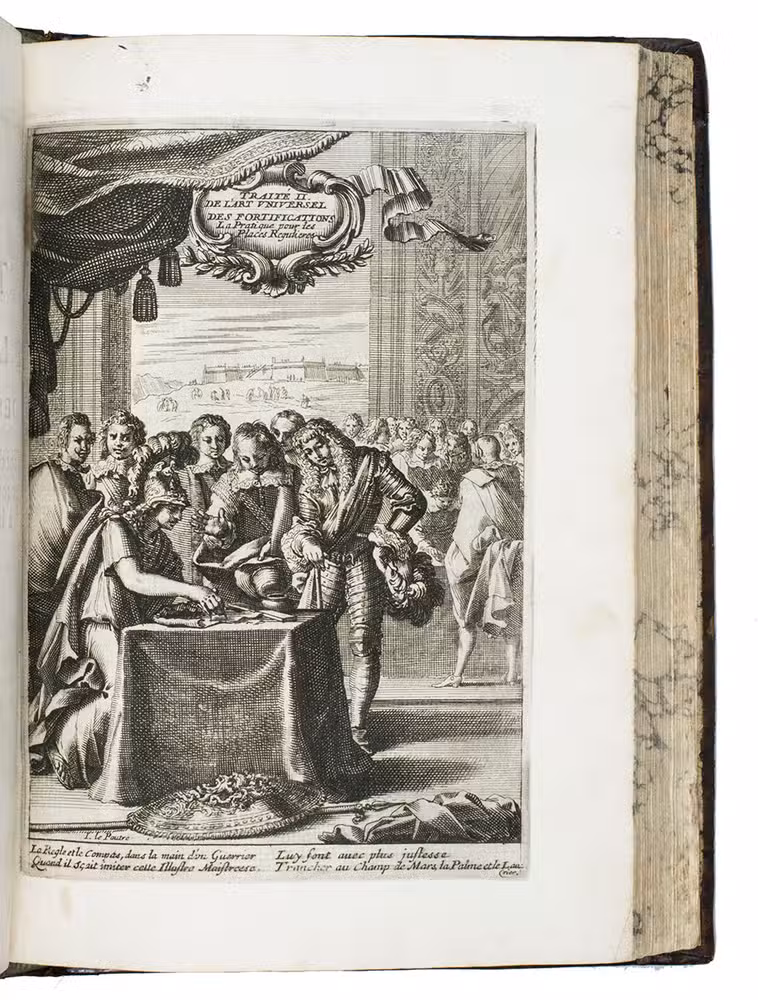 Rare complete pictorial course on military architecture, perspective drawing, fortifications and siege warfare in two main parts, the first with four and the second with two separate "treatises": Traité I: "Les definitions, les noms, les termes, et les figures des pieces & des ouvrages dont on se sert aux fortifications" (the basic elements of fortifications); Traité II: "où sont données diverses methodes pour fortifier toute figure reguliere la françoise, la hollandoise, l'espagnole, & l'italienne" (the geometric principles of designing fortifications, teaching the various methods of designing fortifications used by the French, Dutch, Spanish and Italians); Traité III: "où sont données les methodes de fortifier toutes sortes de places regulieres-irregulieres, comme sont les triangles, & celles qui sont en tout irregulieres" (the practical designing of fortifications for different sorts of sites and situations); Traité IV: "qui donne la methode pour élever les plans des fortifications, & les faire paroistre sur le papier, comme elles sont en effet sur la terre" (perspective for representing fortifications on paper, with perspective views on 9 full-page plates); Traité V: "L'art d'attaquer les places fortifiées et par la force"; Traité VI: "L'art de defendre les [places fortifiées en contre la force" (the attack and defence of fortified sites respectively, including all sorts of military devices and weaponry).
