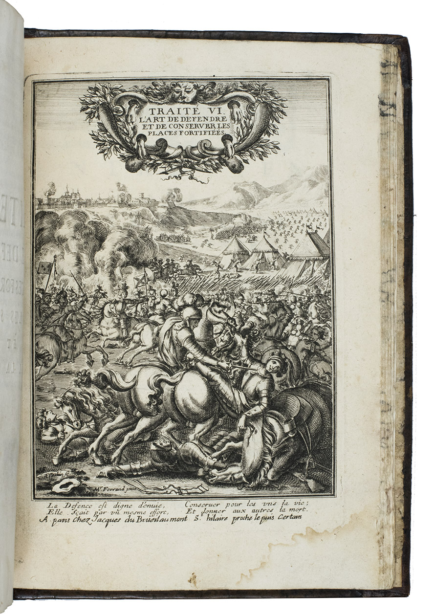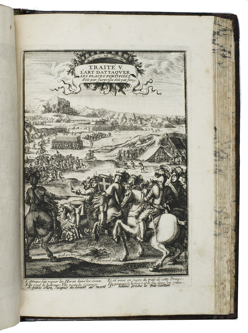 Paris, Jacques Dubrueil, 1674 [=1667]. 6 parts in 1 volume. 4to. With engraved general frontispiece by Jean Le Pautre (1618-1682), 6 engraved frontispieces for the 6 parts, the first 4 by Jean Le Paultre and the last 2 by Noel Cochin (1622-1695) after Ferrand, and many illustrations of military perspective, plans of fortifications, instruments of attack and defence of fortifications, etc. on 125 full-page engraved plates in the text, several plates in part V signed by R. Coquin. Contemporary mottled calf, gold-tooled spine, with title in gold in second compartment, marbled edges. [36], 2; 133 (with the text and the corresponding plate numbered the same); 117, [3] pp.