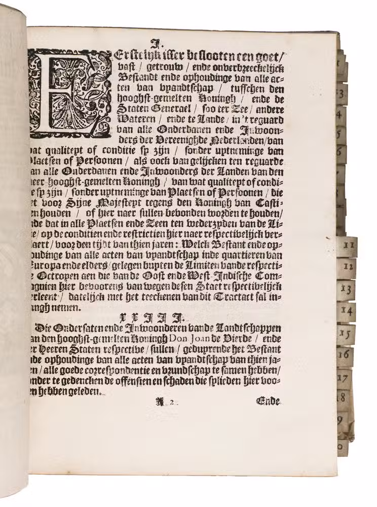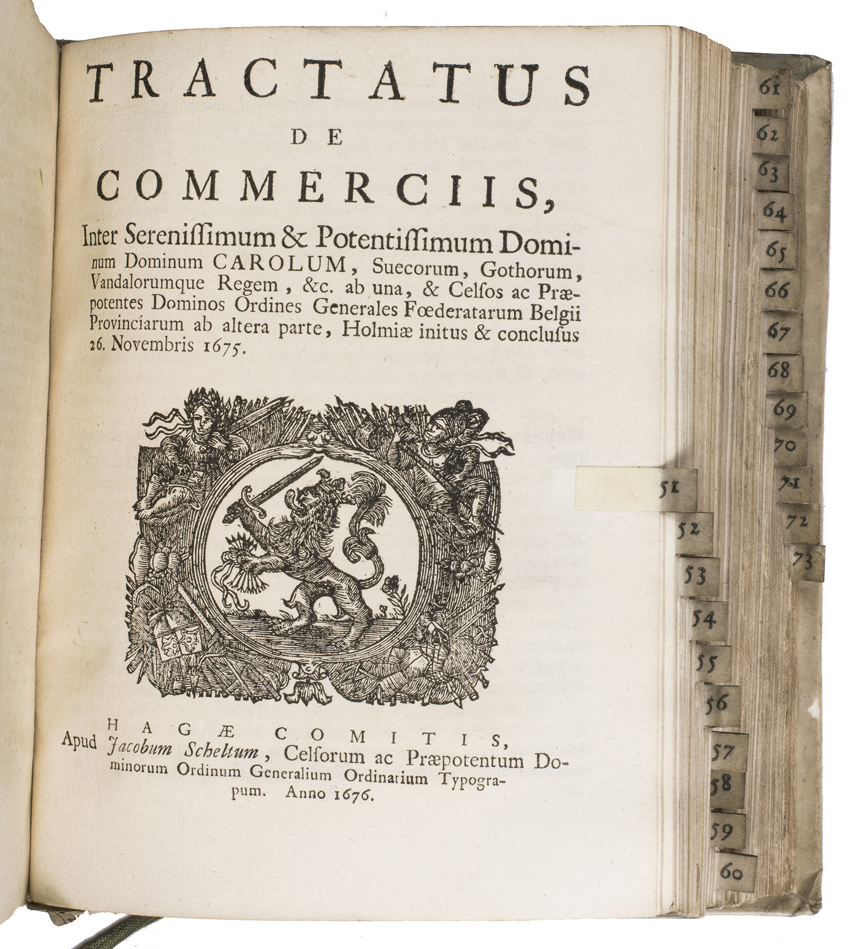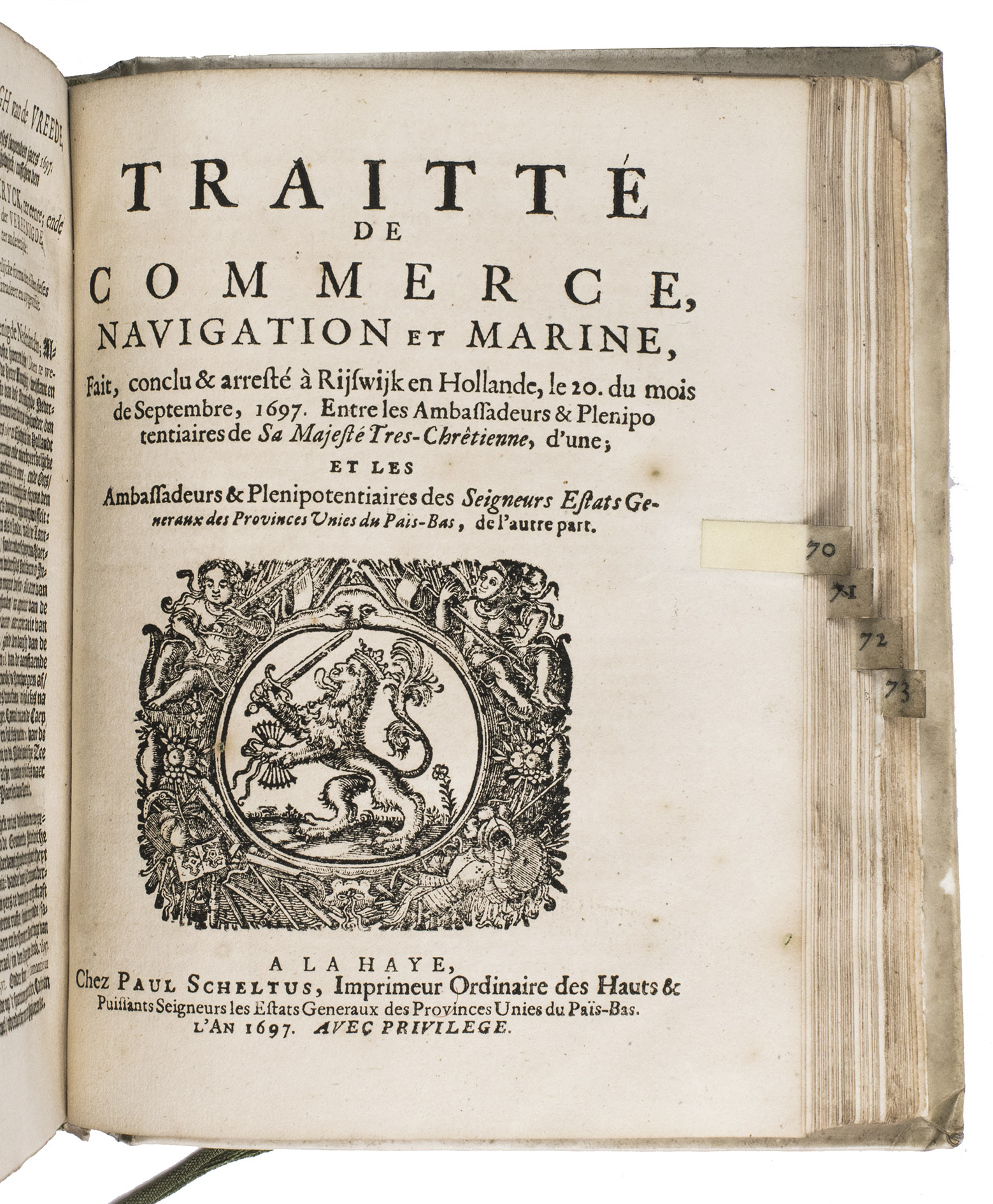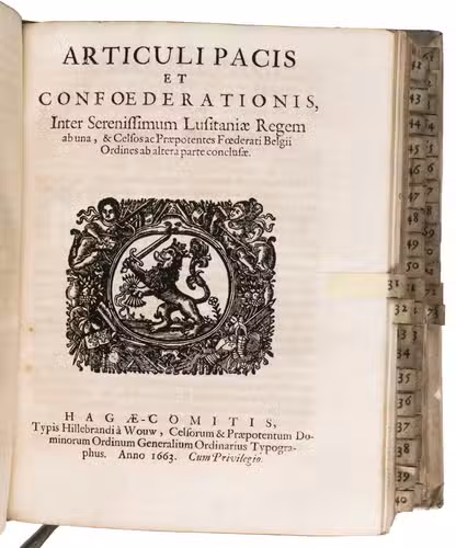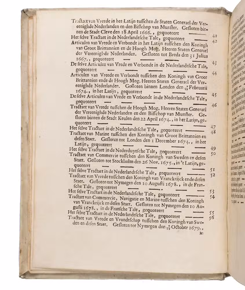 The Hague, Jacobus Scheltus, [not before 1701]. 73 pamphlets in 1 volume. 4to. With a general title page with the woodcut printer's device of the official printer for the Dutch States General. 70 of the 73 treaties have a separate title page, the other 3 were published without thus the work is complete. 67 of these 70 treaties with a title page contain the woodcut printer's device of the official printer for the Dutch States General, 2 of the earlier treaties bear Van Wouw's woodcut printer's device on their title pages, 1 title page shows a simple woodcut floral vignette, 1 title page does not contain any (woodcut) decoration, and 1 treaty without a title page does contain the woodcut printer's device of the official printer for the Dutch States General at the start of the text. Further with woodcut decorated initials throughout the treaties. The text is set in both roman and gothic type. Later vellum.