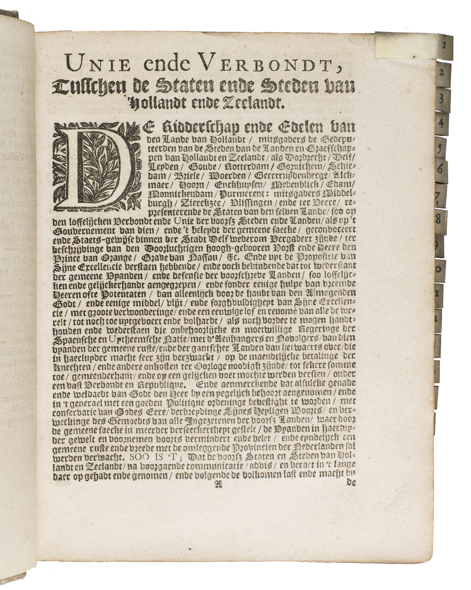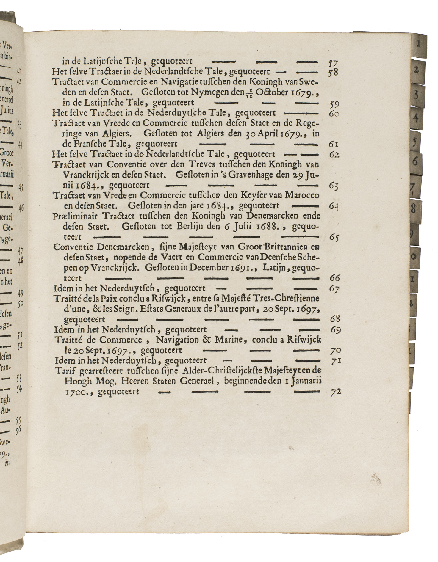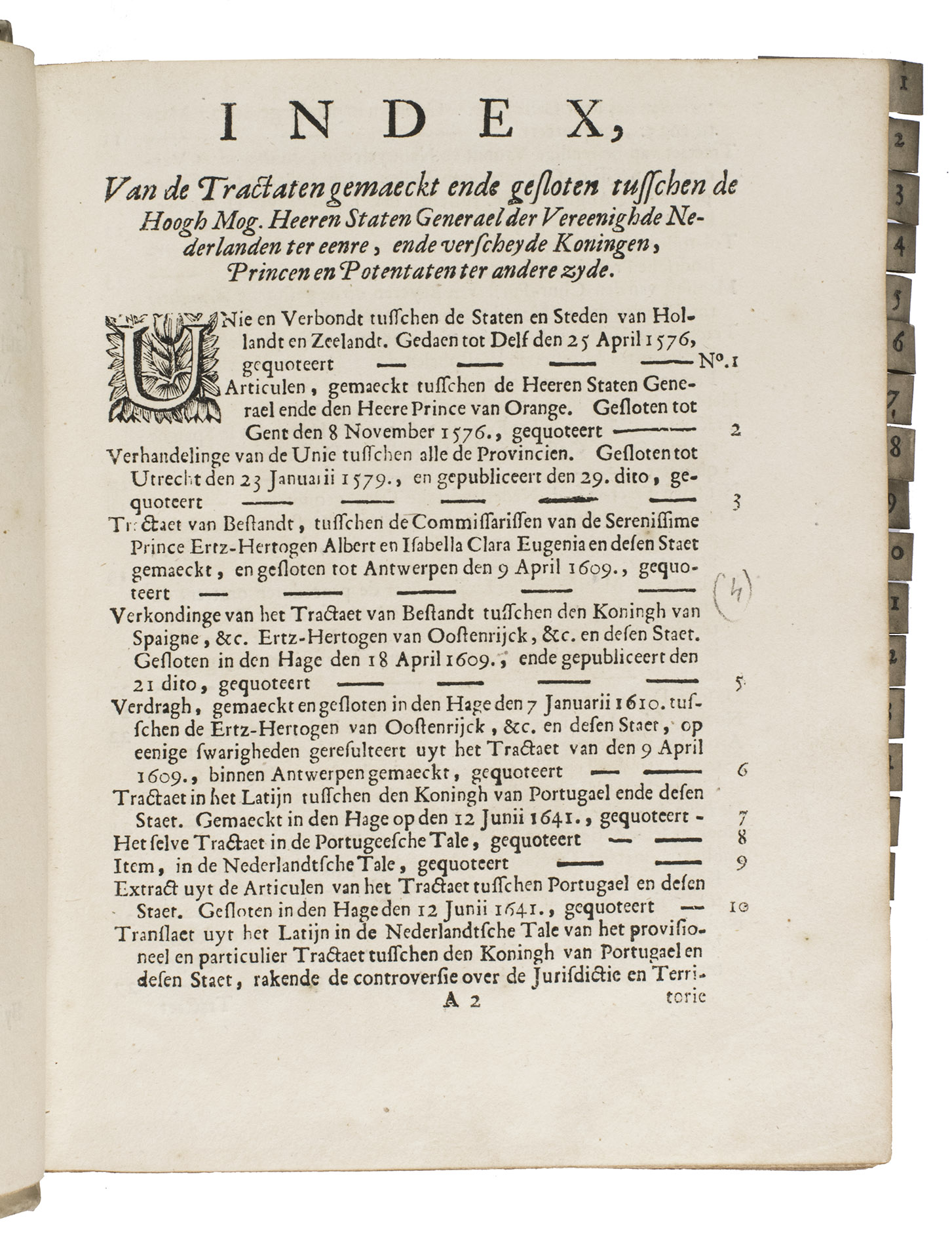 The Hague, Jacobus Scheltus, [not before 1701]. 73 pamphlets in 1 volume. 4to. With a general title page with the woodcut printer's device of the official printer for the Dutch States General. 70 of the 73 treaties have a separate title page, the other 3 were published without thus the work is complete. 67 of these 70 treaties with a title page contain the woodcut printer's device of the official printer for the Dutch States General, 2 of the earlier treaties bear Van Wouw's woodcut printer's device on their title pages, 1 title page shows a simple woodcut floral vignette, 1 title page does not contain any (woodcut) decoration, and 1 treaty without a title page does contain the woodcut printer's device of the official printer for the Dutch States General at the start of the text. Further with woodcut decorated initials throughout the treaties. The text is set in both roman and gothic type. Later vellum.