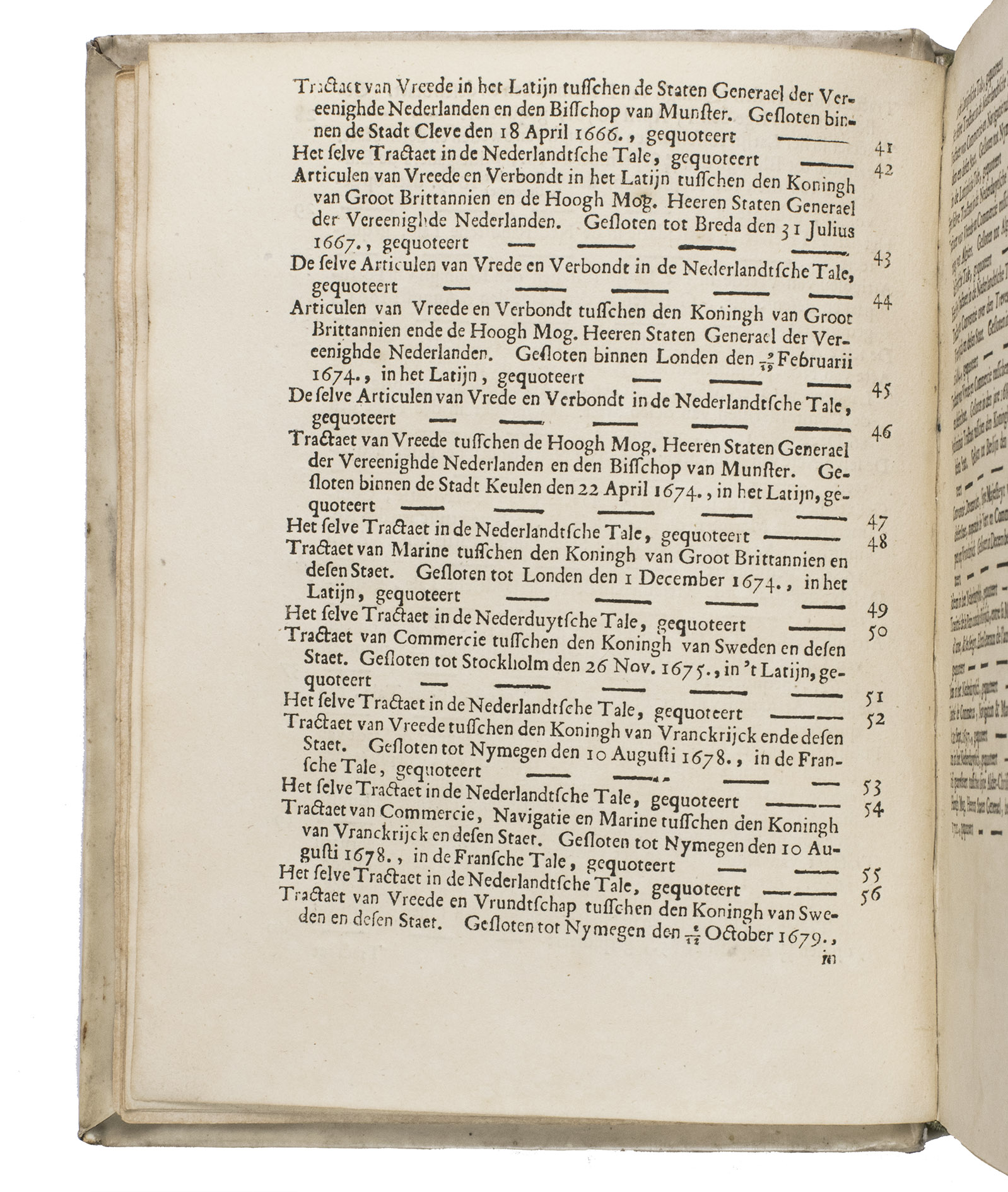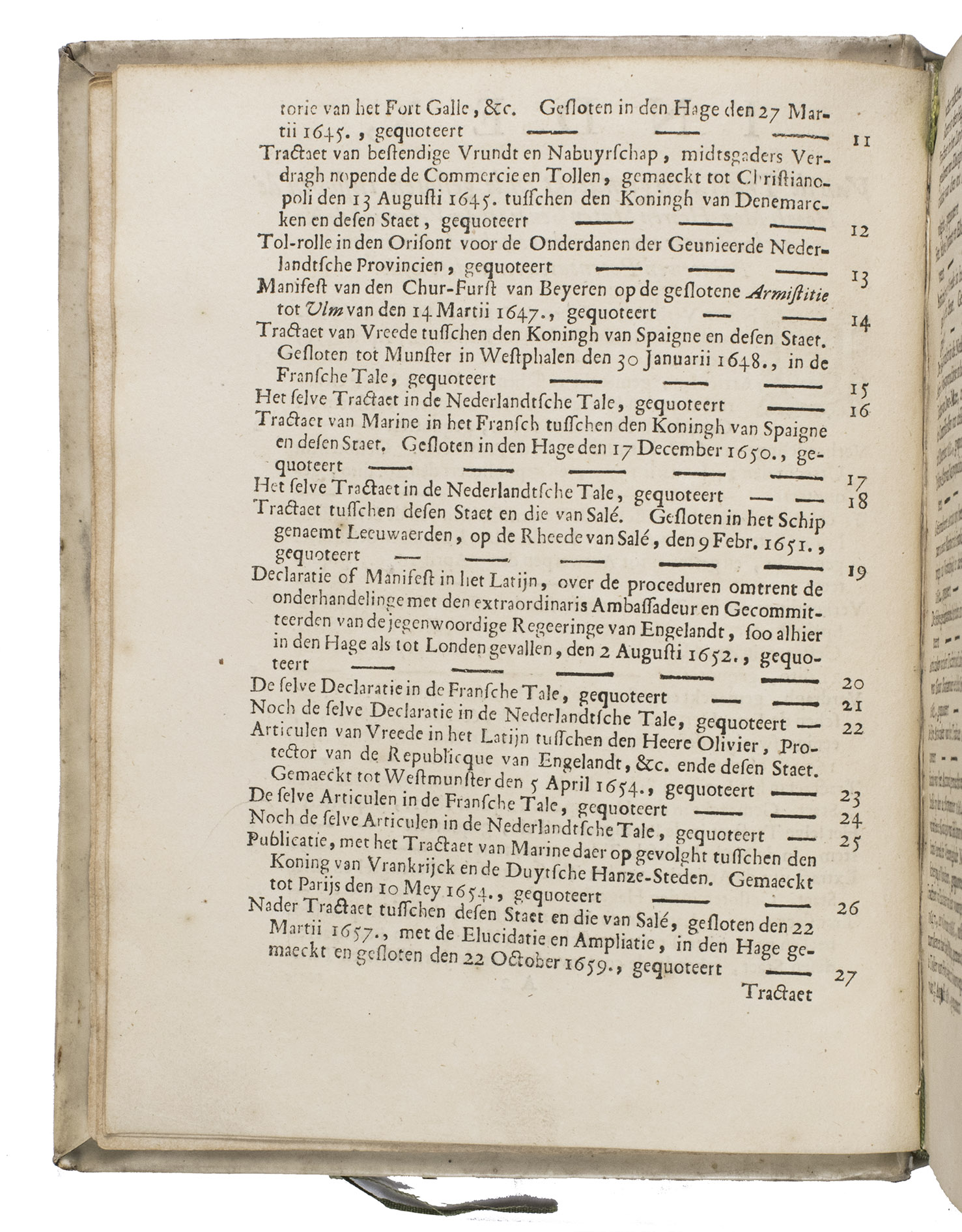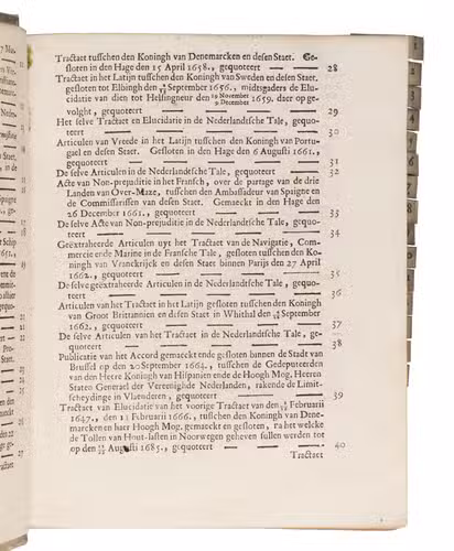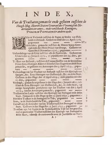 Unsurprisingly, several treaties concern the very strained relationship between the Dutch Republic and Spain during and following the Eighty Years' War (1566/68-1648), including the Twelve Years' Truce (1609-1621, see treaties 4-6) and border conflicts in Flanders after the end of the war, since that was a major event in Dutch diplomatic and military history during the 16th- and 17th centuries. The other treaties, the majority in this binding, concern - also unsurprisingly - trade, commerce, and the establishment and maintenance of international trade routes by land and sea. The majority of the treaties are in Dutch and many are included multiple times in different languages (Latin, French, and even one in Portuguese).