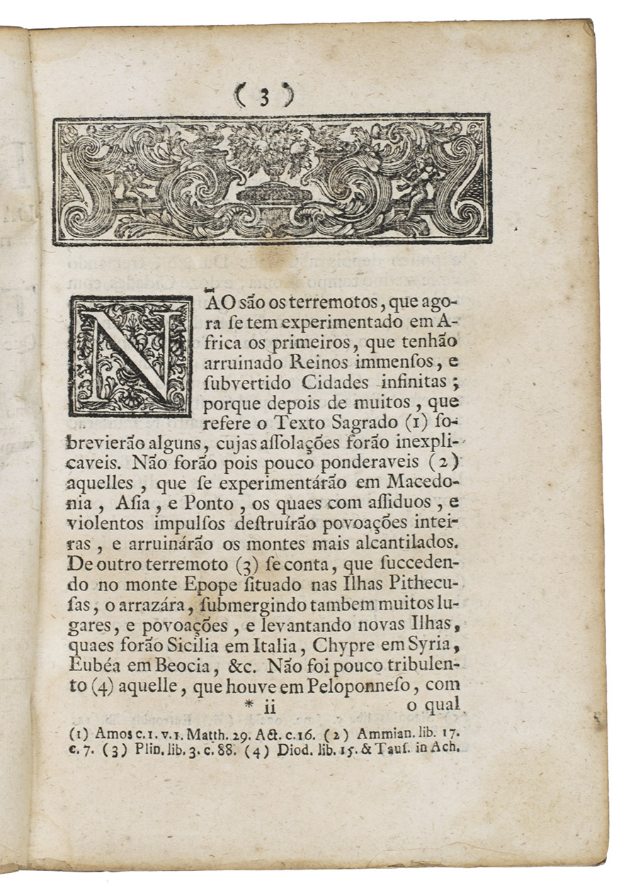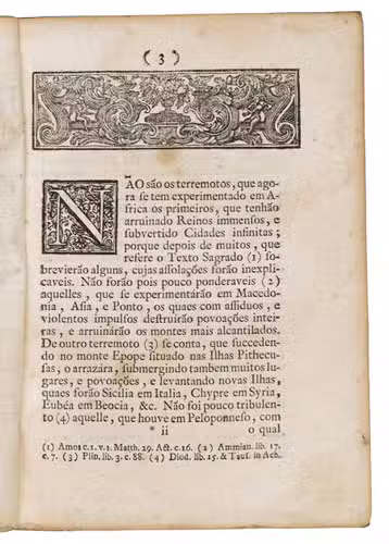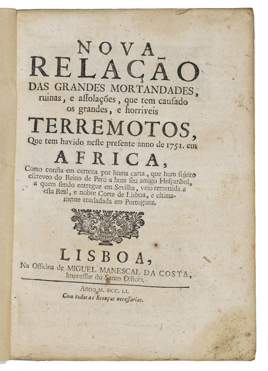 Very rare account of the various earthquakes that occurred in the world, and in particular in Lisbon in the years 1356 and 1531, followed by a translation of a letter sent from Peru by a Spaniard to his friend in Sevilla describing the many seismic phenomena and earthquakes that had taken place in Africa in 1751, the letter here in Portuguese translation.