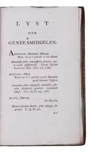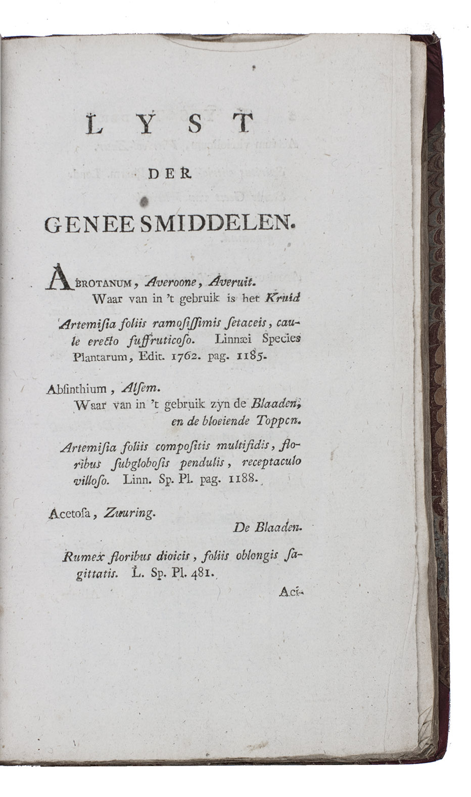 Rare first edition of the Dutch translation of the standard pharmacopoeia of Edinburgh, first published in 1699 as Pharmacopoea Collegii Regii Medicorum Edinburgensis. The present translation was based on the sixth edition of 1774. Its"materia medica" starts with the "simples": the non-compounded medicines and ingredients from vegetable, animal and mineral sources. The compound medicines follow, including oils, syrups, wines, waters, powders, ointments, plasters and more. The work closes with an index, an appendix, and a short list with the translations of some Latin words and terms.