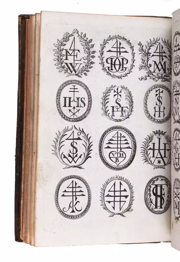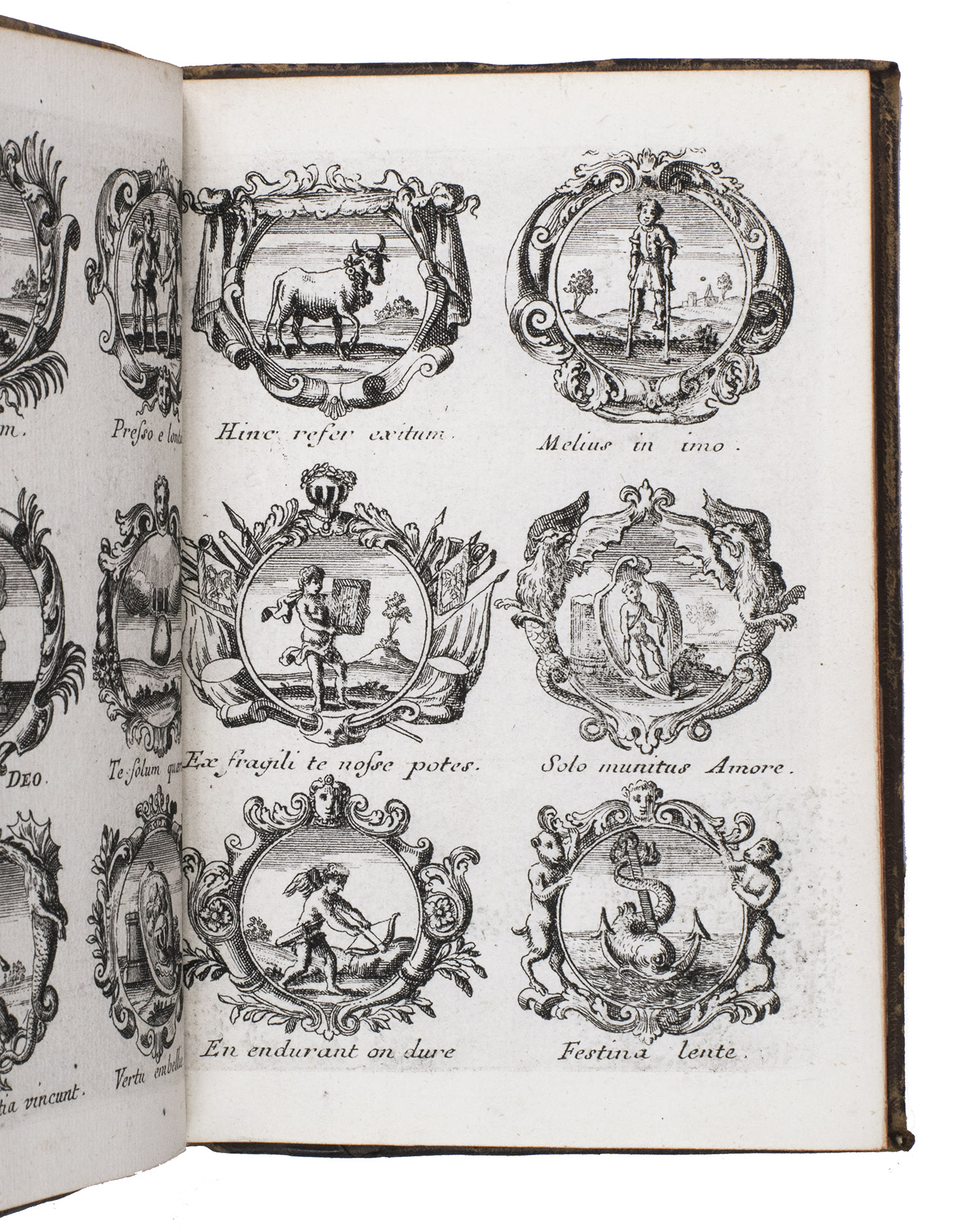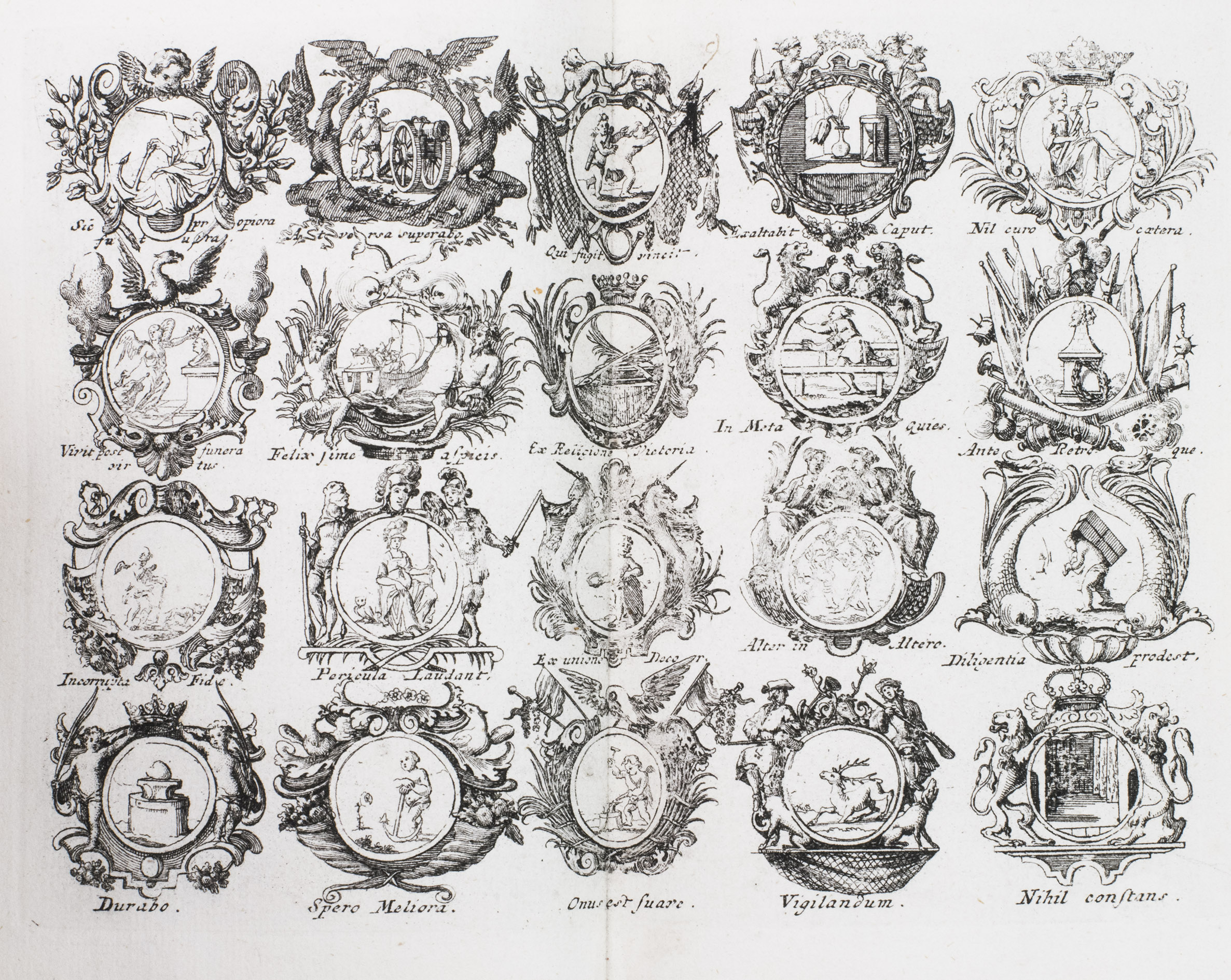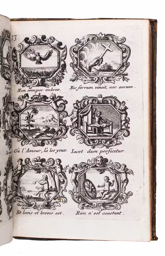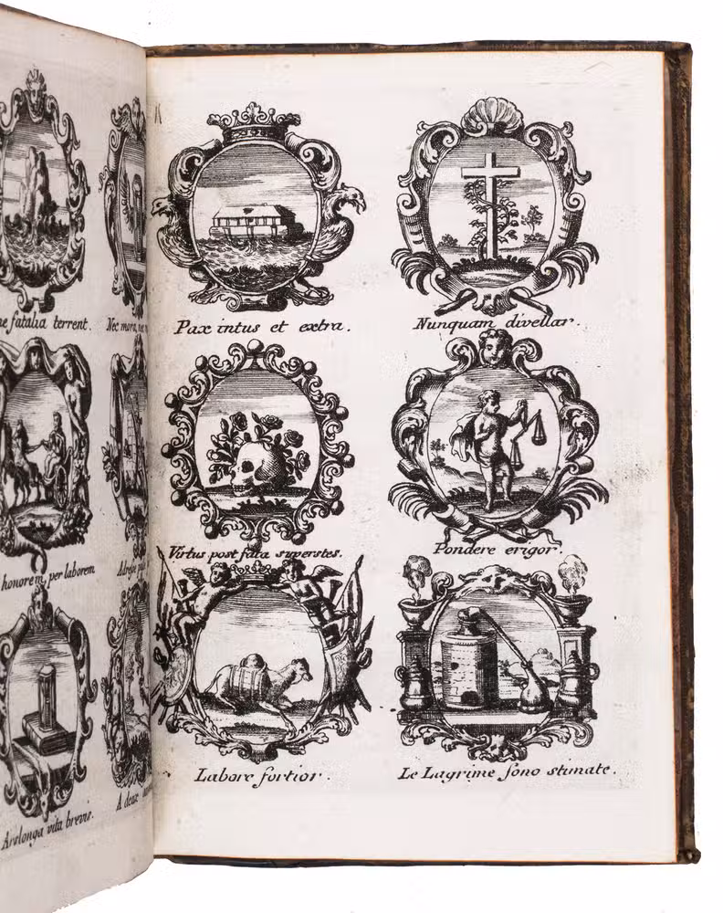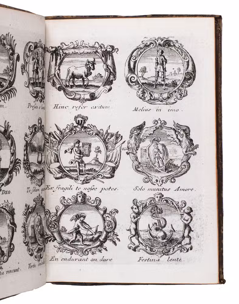 Item 4 appears to have been printed from slightly worn copper plates. With an occasional spot, slightly affecting 2 monograms in item 1, but still with all plates in good or very good condition. The binding is somewhat worn but still good. A lovely collection of 184 emblems and monograms from the early 18th century. Ad 1: Bonacini, 2031; Hollstein XXXI, p. 92; ad 2-3: Praz, p. 533; ad 4: cf. Landwehr, German emblem books 641; Praz, pp. 533-534.