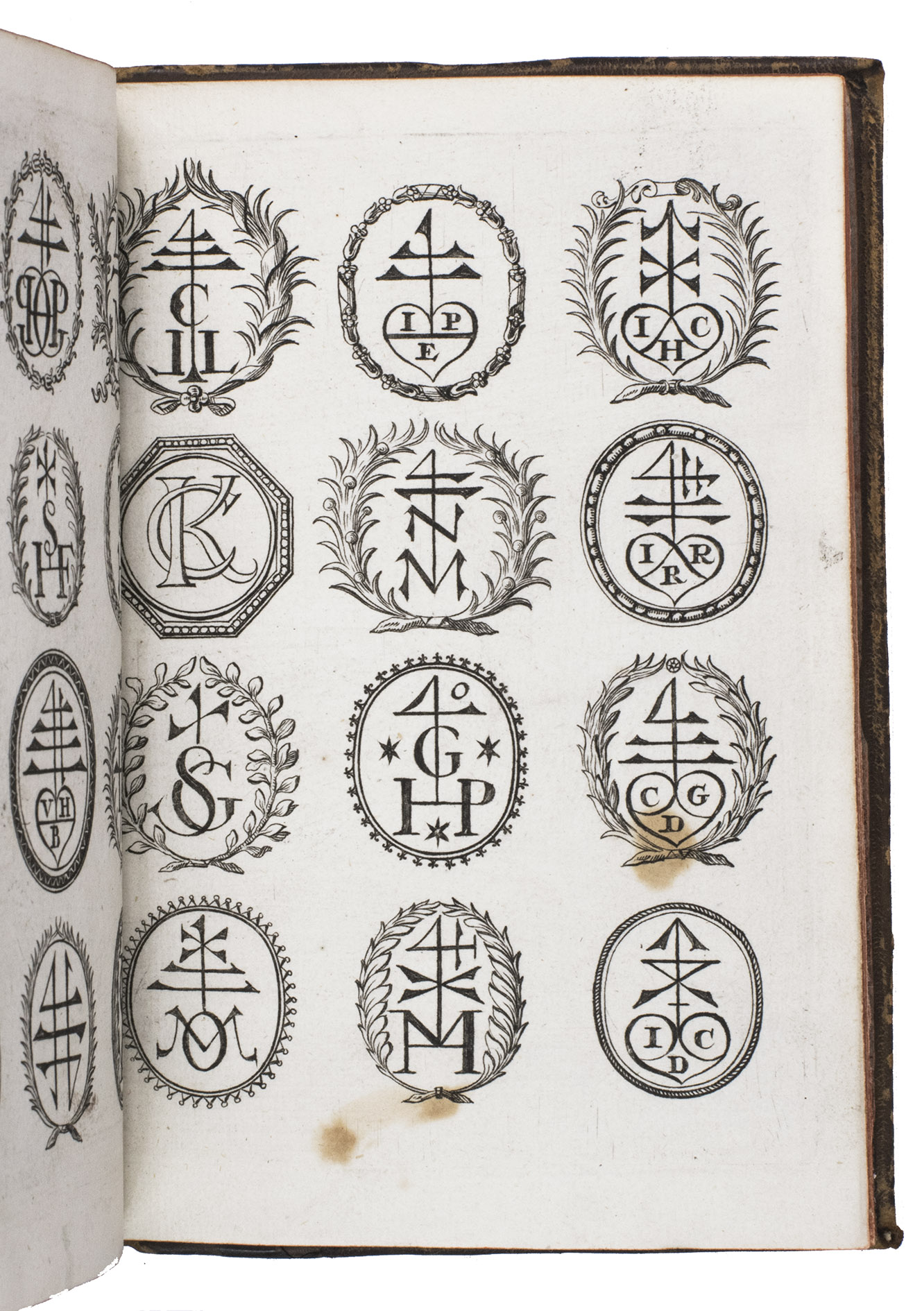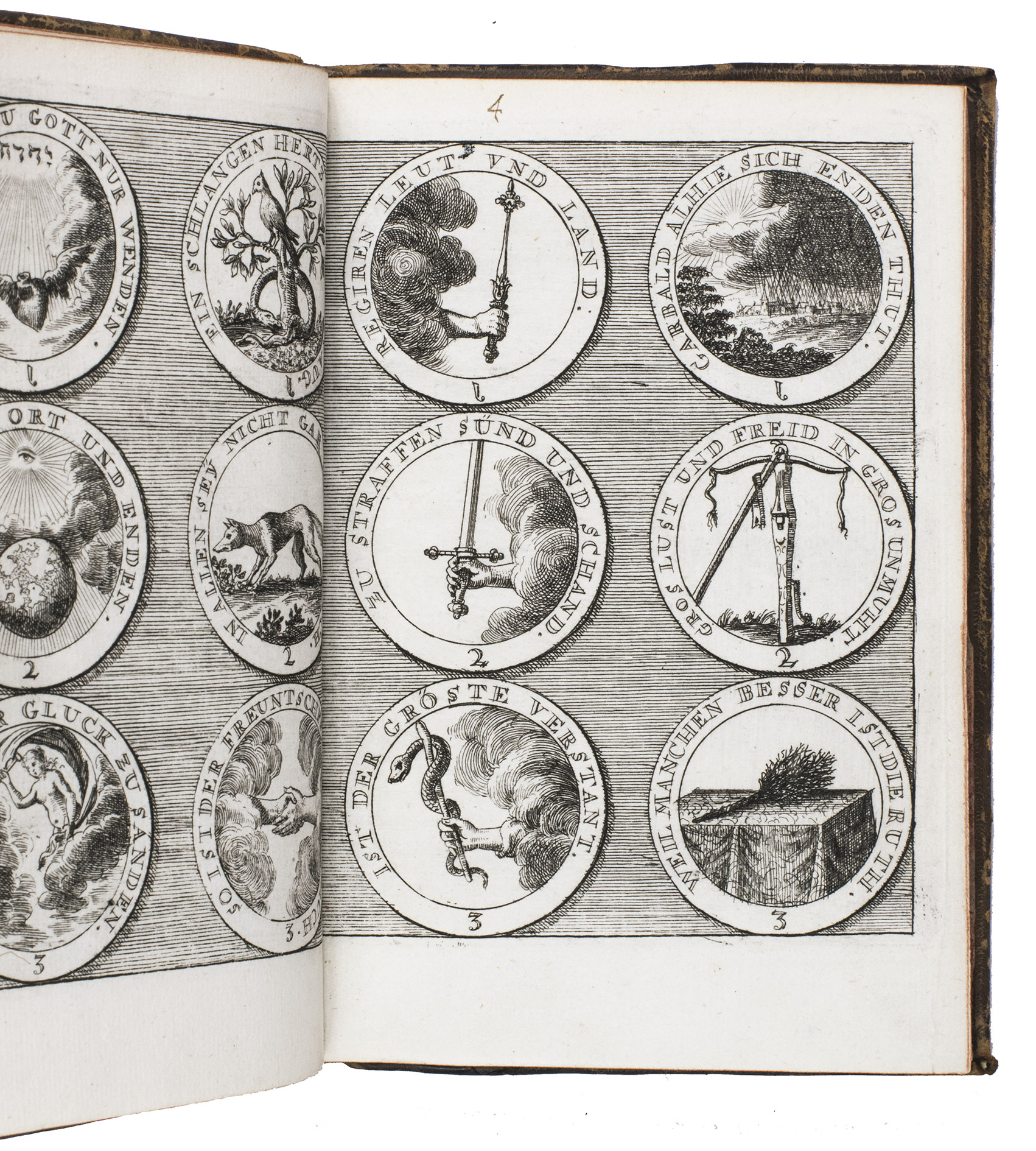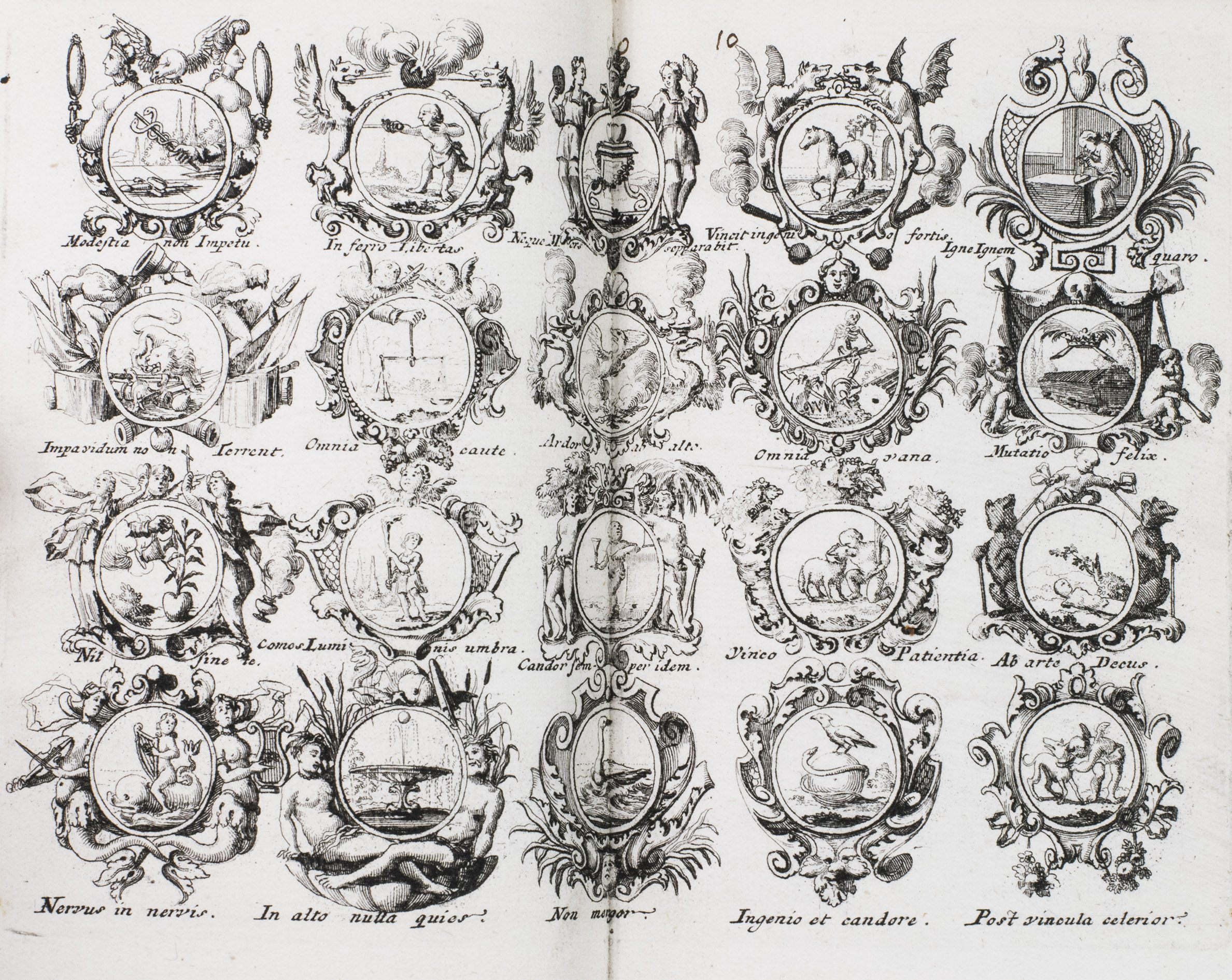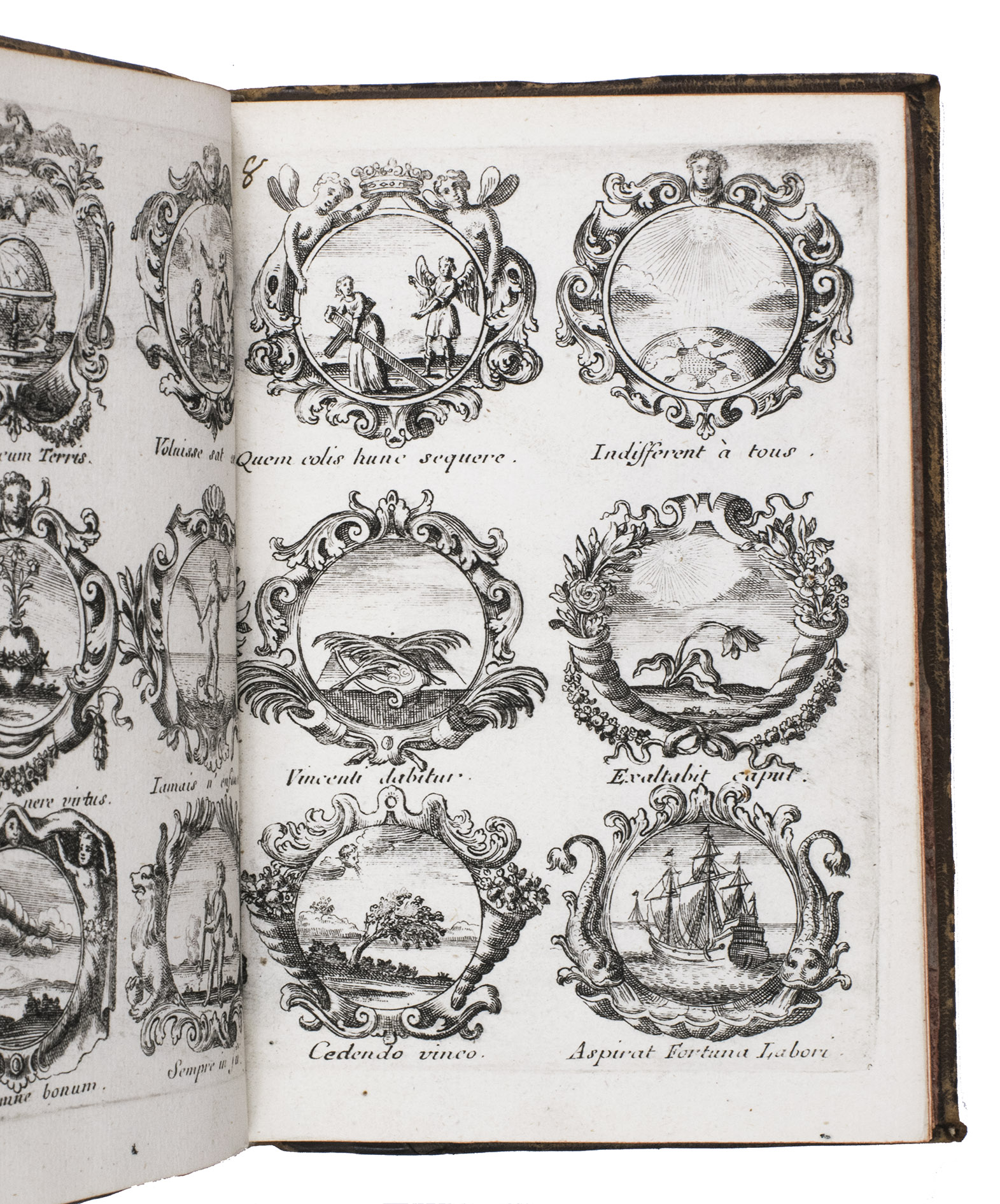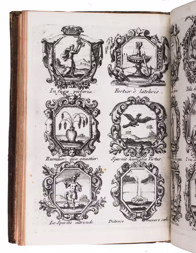 Item 4 appears to have been printed from slightly worn copper plates. With an occasional spot, slightly affecting 2 monograms in item 1, but still with all plates in good or very good condition. The binding is somewhat worn but still good. A lovely collection of 184 emblems and monograms from the early 18th century. Ad 1: Bonacini, 2031; Hollstein XXXI, p. 92; ad 2-3: Praz, p. 533; ad 4: cf. Landwehr, German emblem books 641; Praz, pp. 533-534.