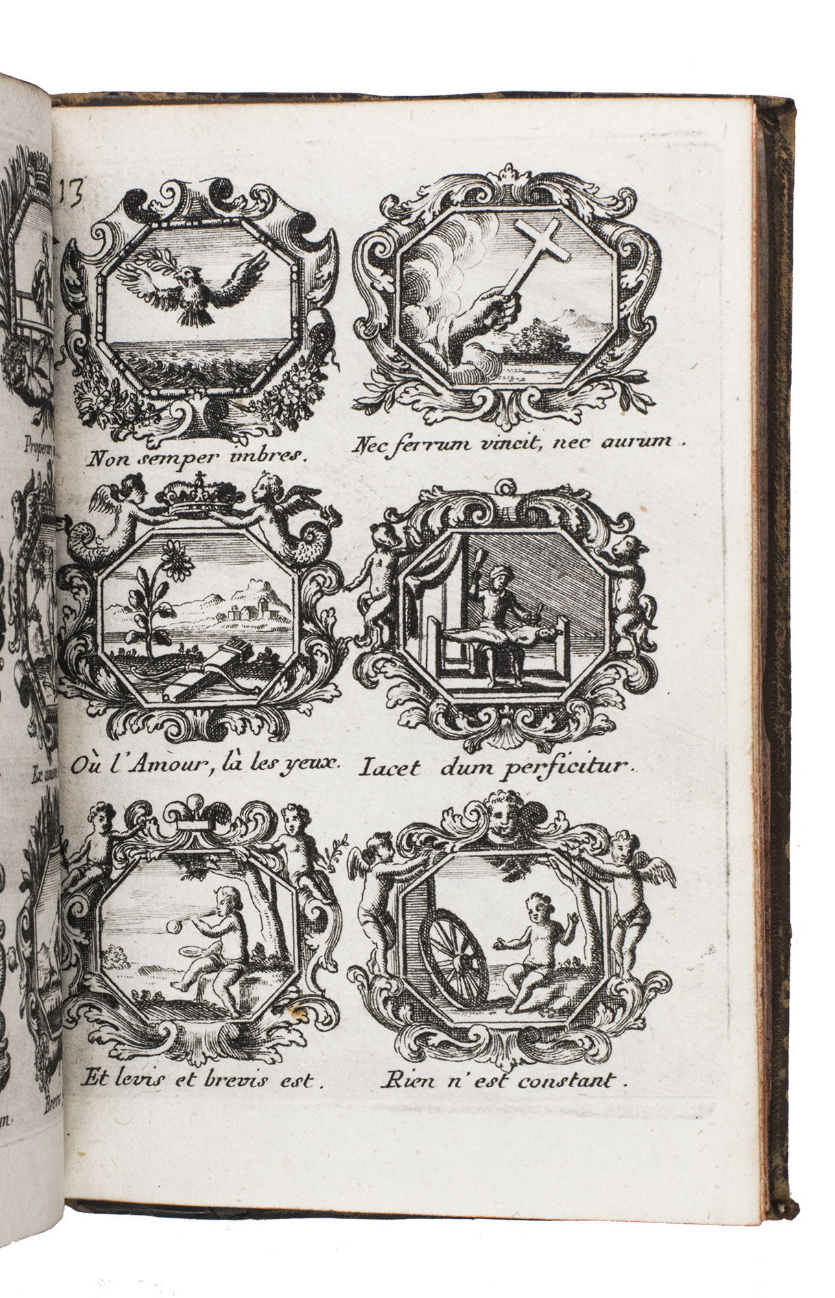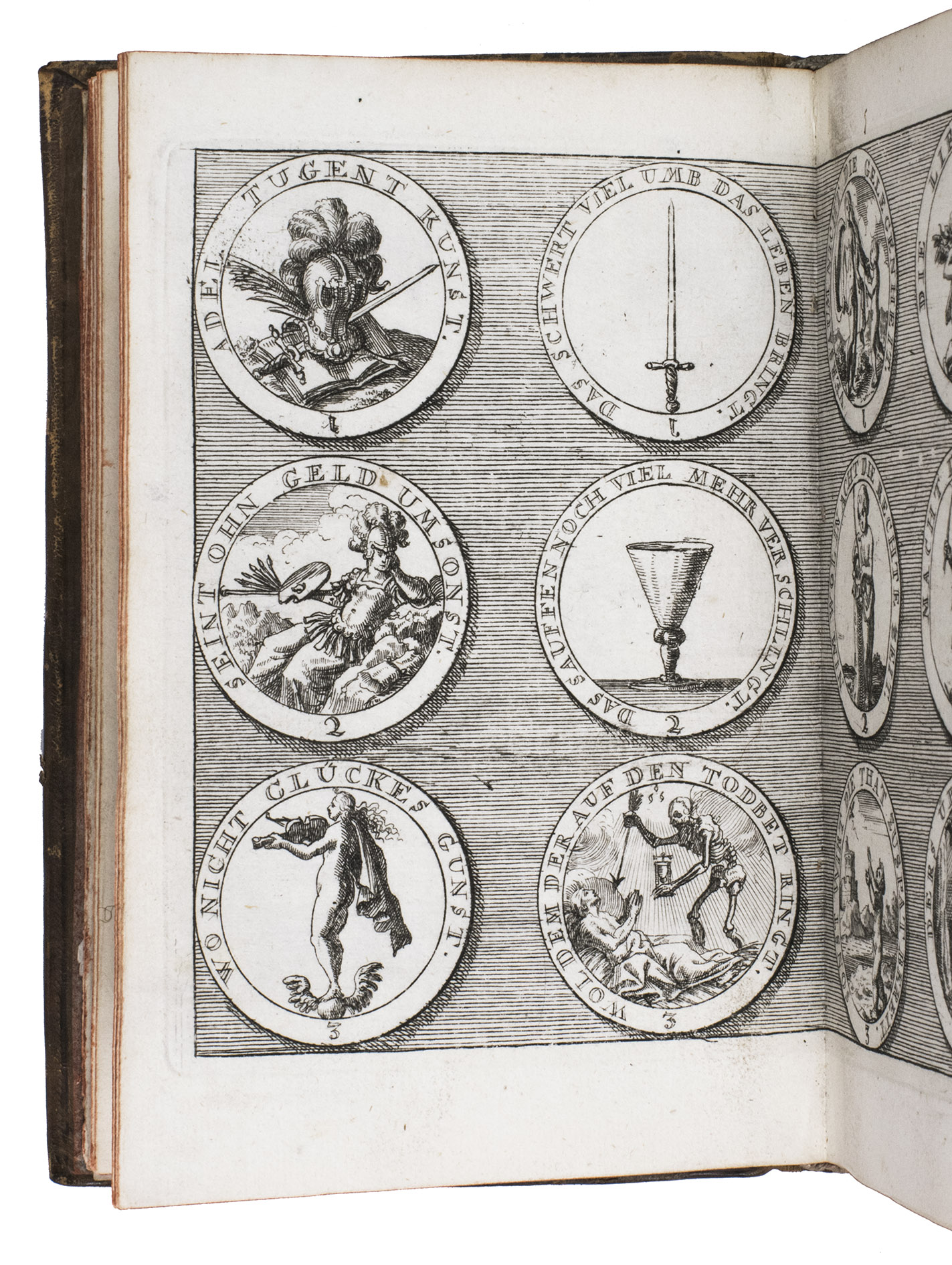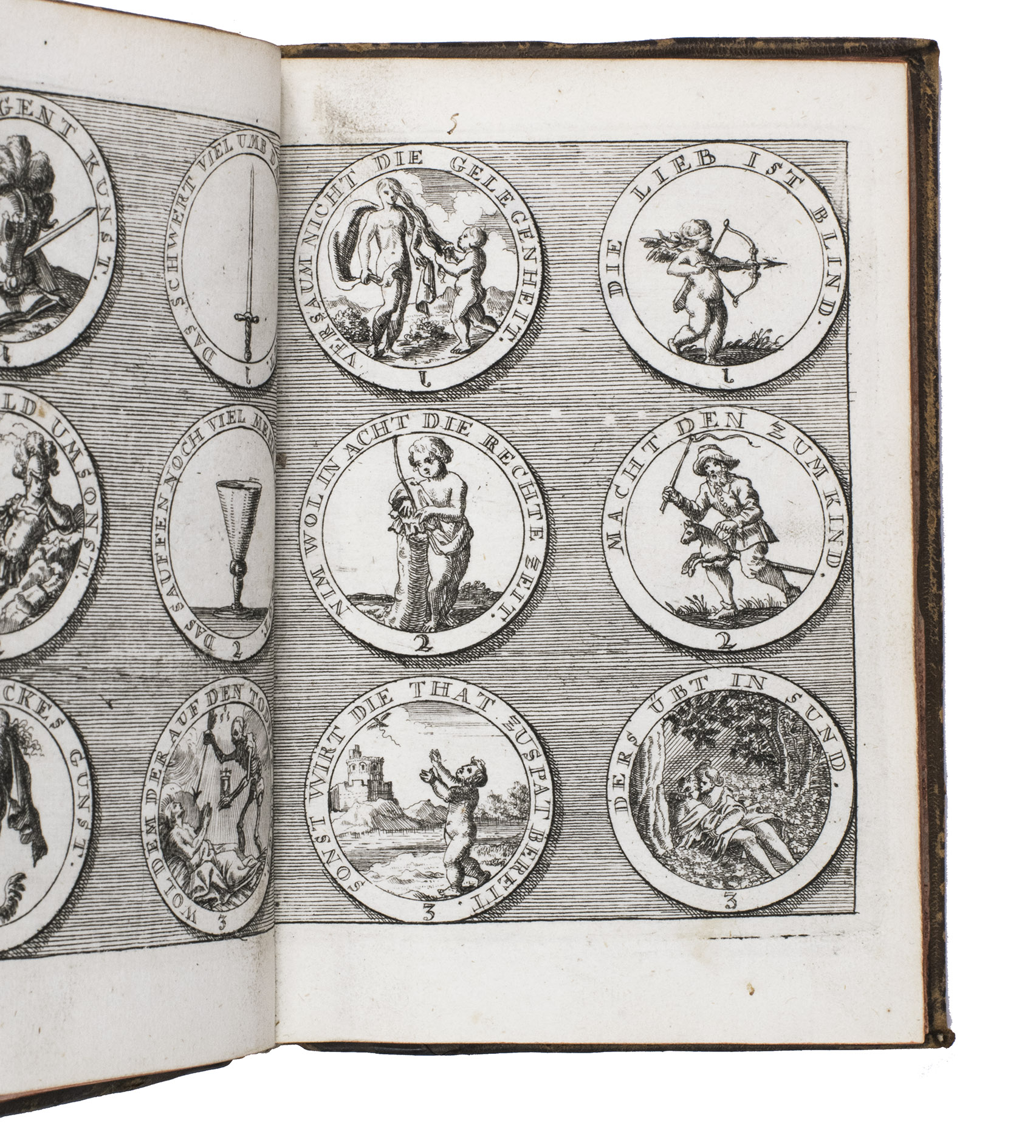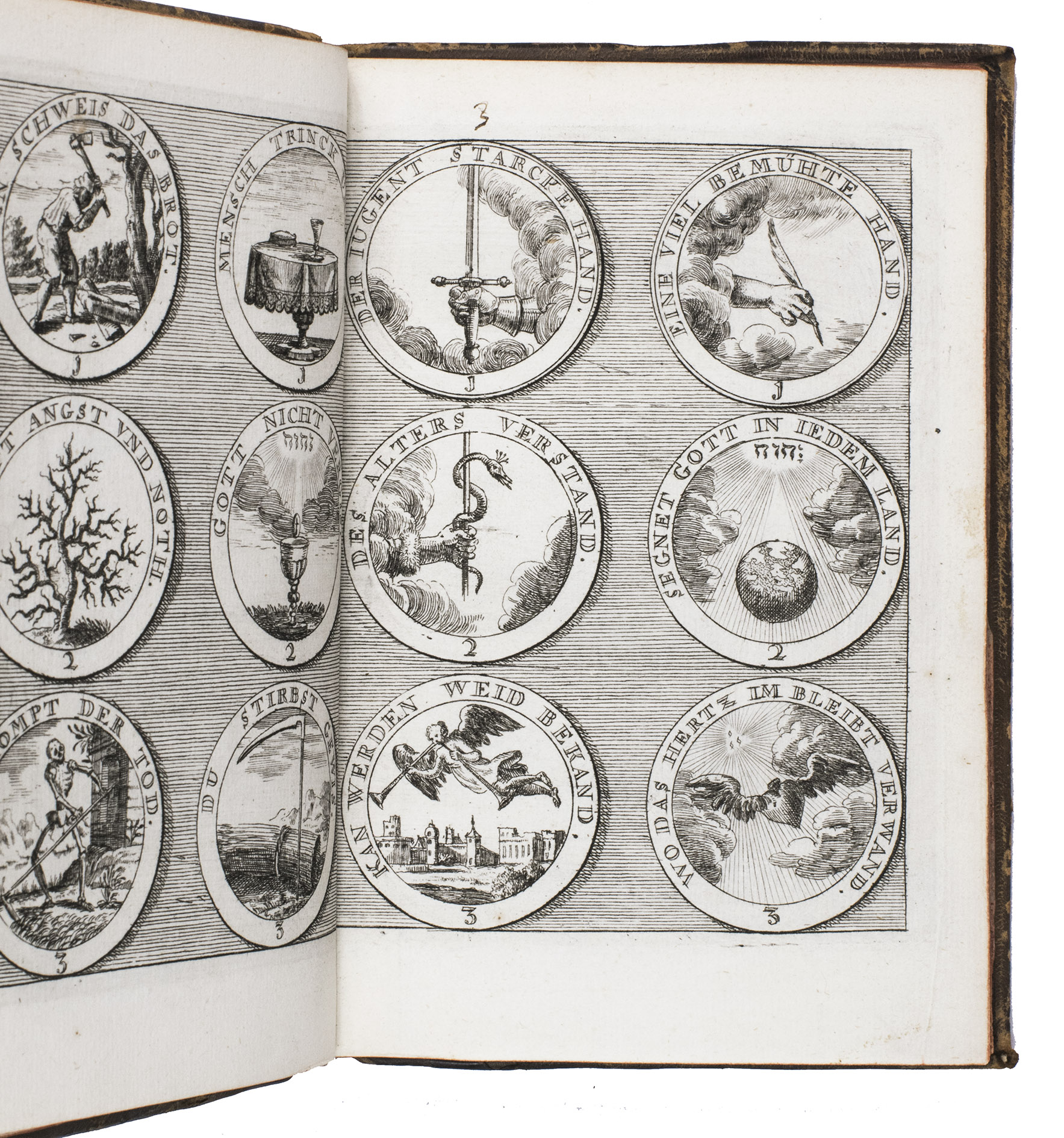 Item 4 appears to have been printed from slightly worn copper plates. With an occasional spot, slightly affecting 2 monograms in item 1, but still with all plates in good or very good condition. The binding is somewhat worn but still good. A lovely collection of 184 emblems and monograms from the early 18th century. Ad 1: Bonacini, 2031; Hollstein XXXI, p. 92; ad 2-3: Praz, p. 533; ad 4: cf. Landwehr, German emblem books 641; Praz, pp. 533-534.