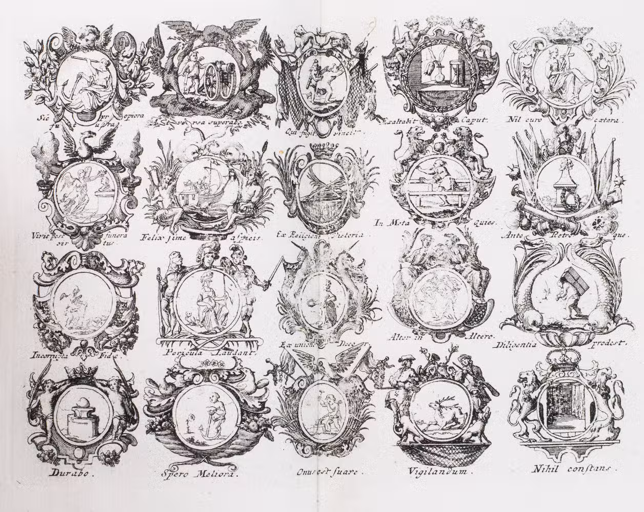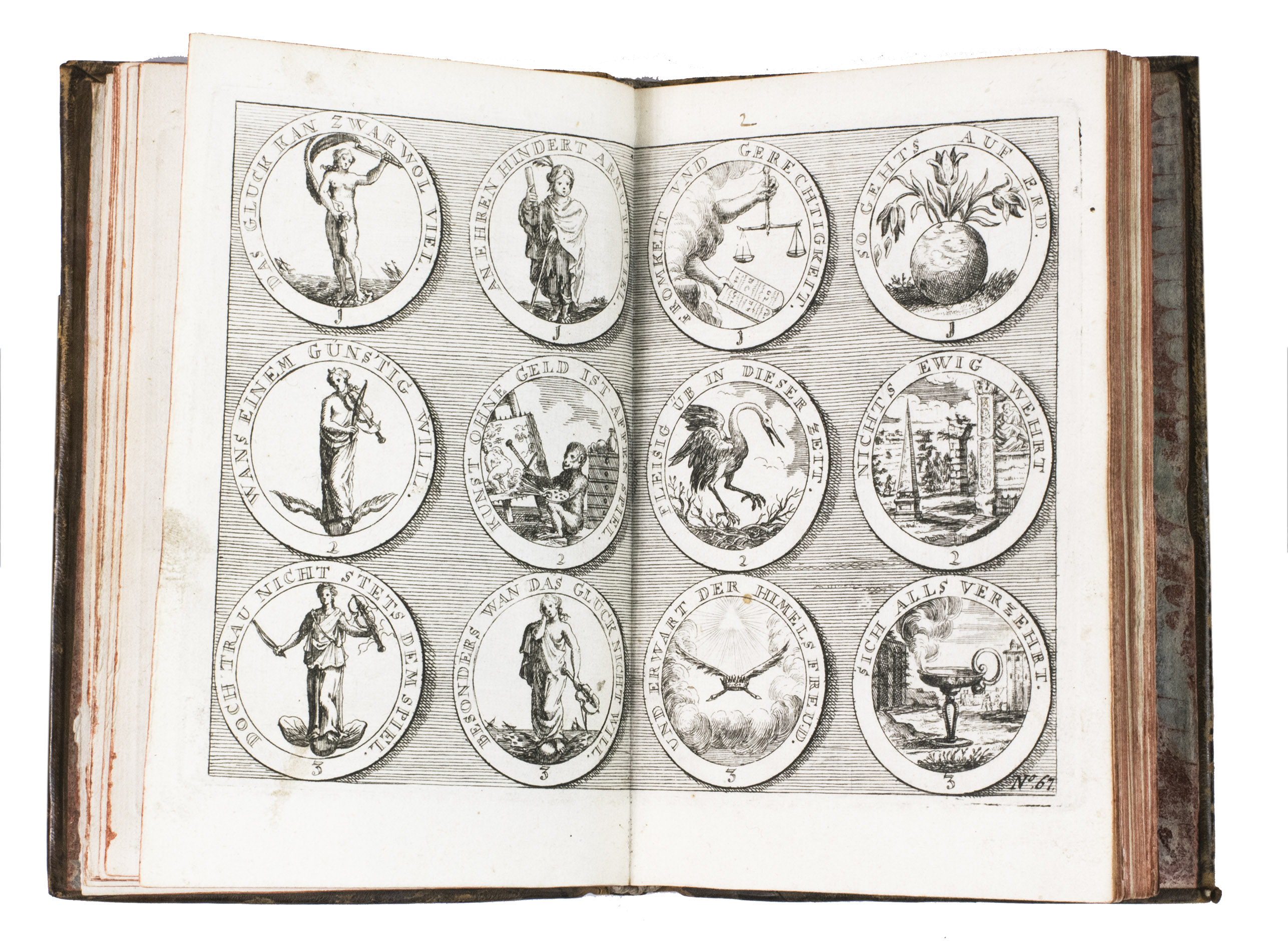 A collection of 14 engraved plates from 3 different emblematic works and a work on monograms, all published by Johann Christoph Weigel (1661-1726) in Nürnberg. Praz and others attribute items 2-4 to his father, the great Nürnberg engraver Christoph Weigel (1654-1725), who may have engraved their plates, though item 4 may have appeared shortly after his death.