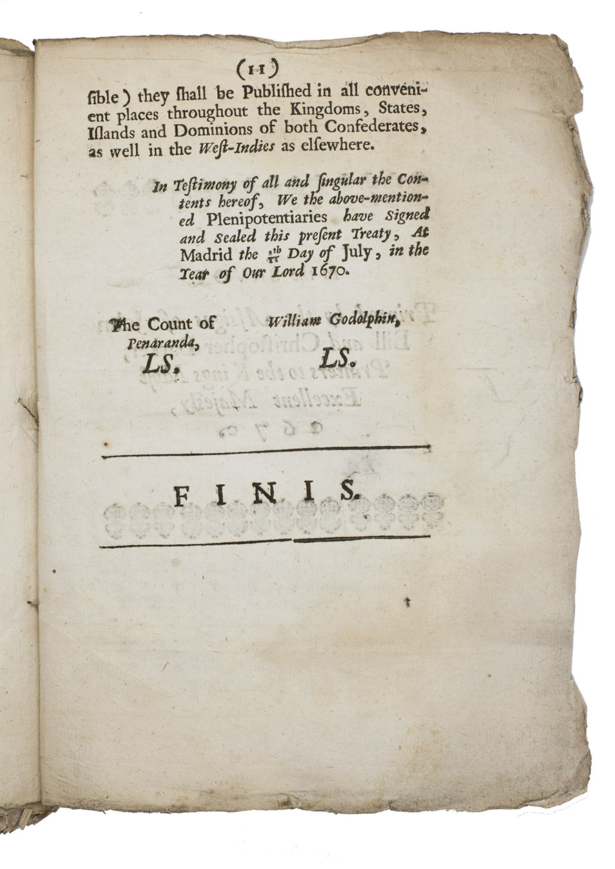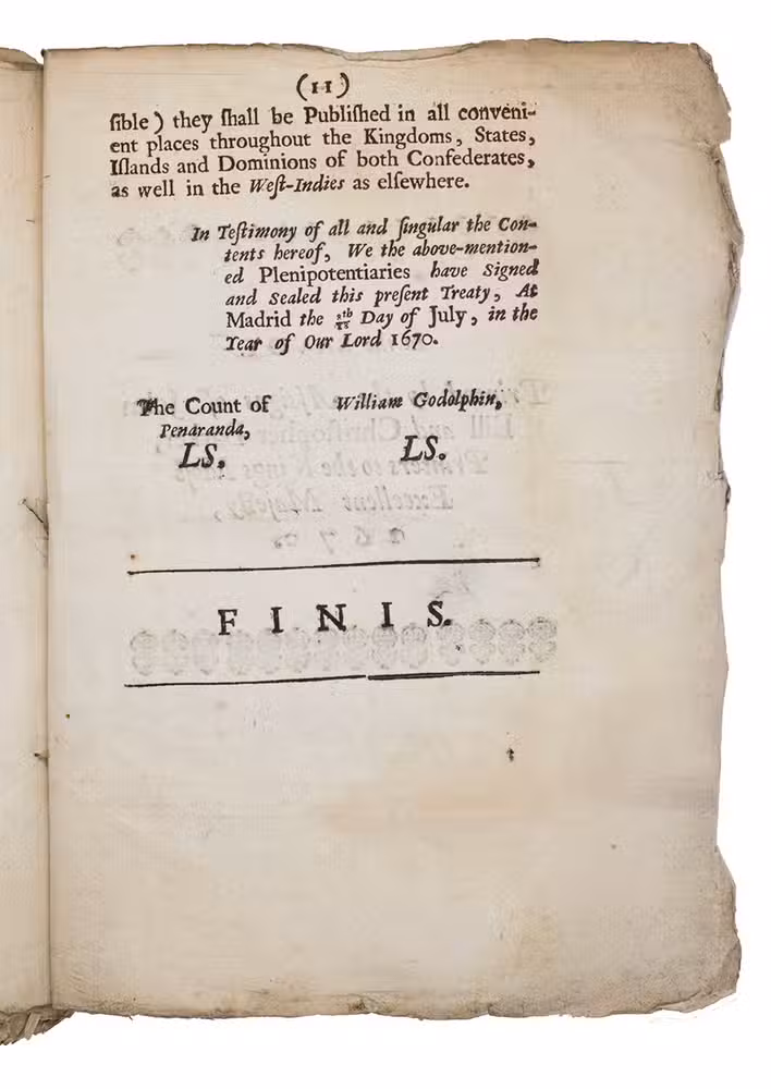 English translation of the Treaty of Madrid, dated 1670, also called the Godolphin Treaty, between England and Spain. Adopted in July 1670 and ratified on 28 September, it officially ended the so-called Anglo-Spanish War (1654-1660) in the Caribbean. The open warfare between England and Spain, caused by commercial rivalry, had already ended in 1660, after six years of attacking each others commercial and colonial interests, but the tension in the Caribbean caused conflict for ten more years. The war officially ended with two peace treaties signed at Madrid: the first dated 1667, and the present second dated 1670.