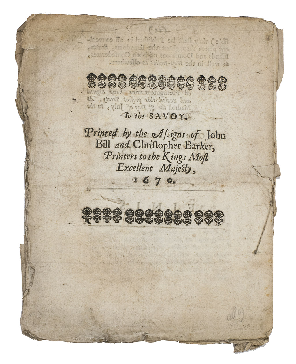 Lacking A1 (the title-page, verso blank) and the final blank leaf, but otherwise complete, so with no loss in the text of the treaty. Paper a little frayed around the edges, first and last page a little dust-soiled, but otherwise in good condition. The rare first edition of an important treaty for American history. Chalmers, A collection of treaties between Great Britain and other powers II (1790), pp. 34-40 (naming an 1686 imprint?); ESTC R35944; Sabin 96528 (cf. 96527 for a Spanish edition); Wing C3616A; for Newcombe and the Kings printing office: C. William Miller, " In the Savoy: a study in post-Reformation imprints", in: Papers of the Bibliogr. Soc., 1 (1948/49), pp. 39-46, at pp. 42-43.