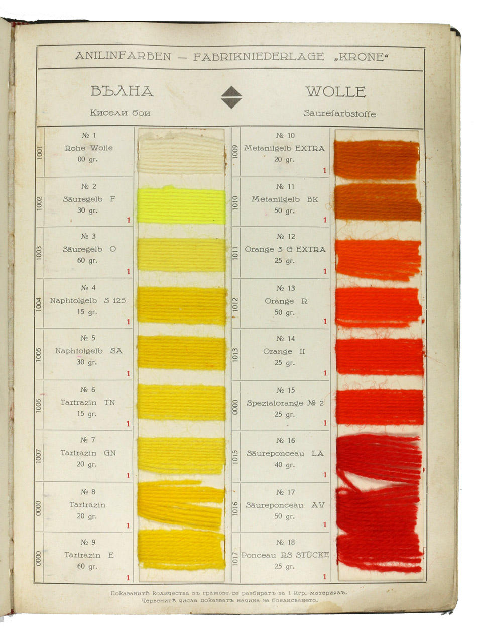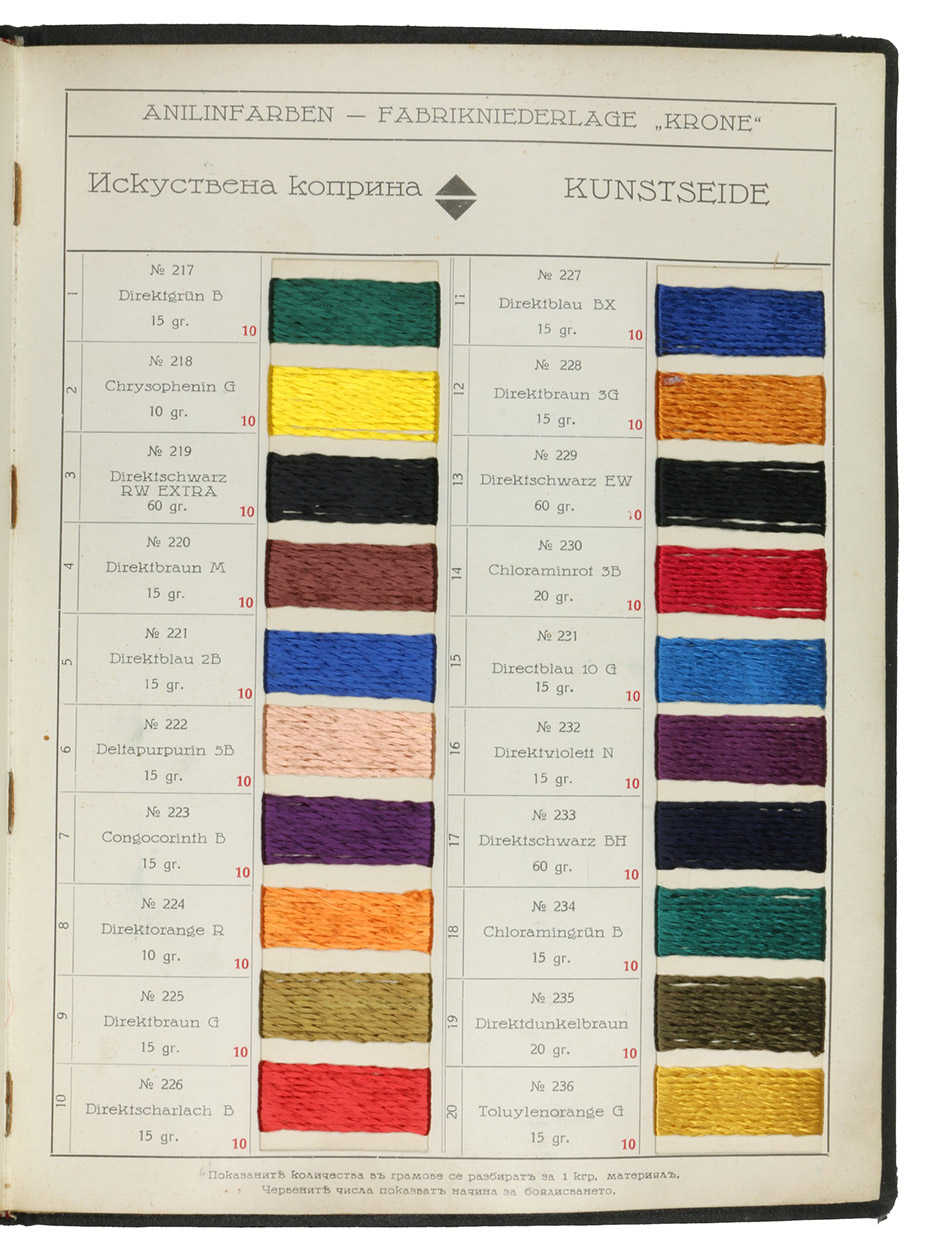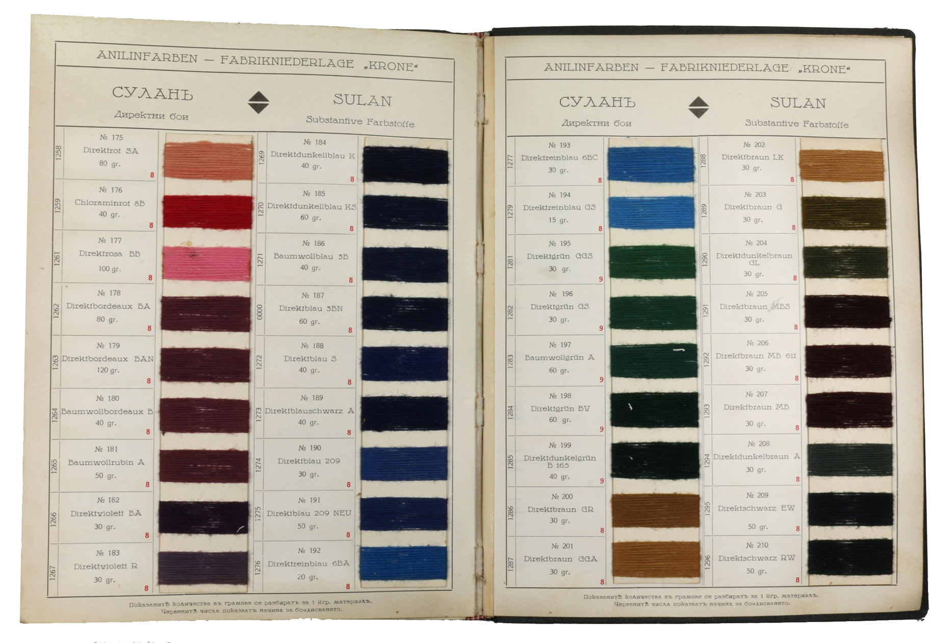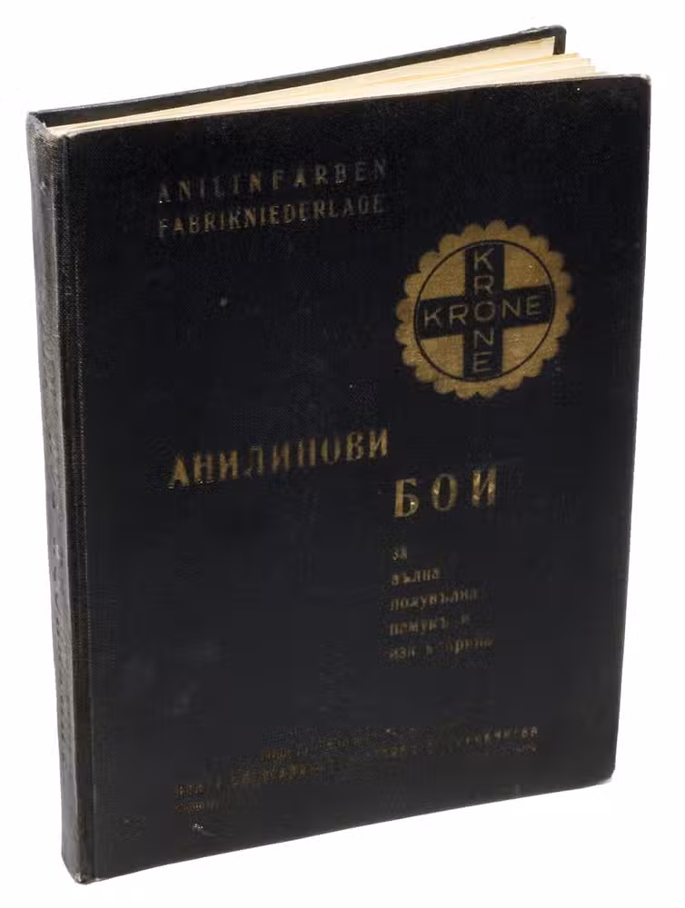 A well-preserved [1938?] collection of fabric swatches and yarn samples dyed in various colours and several varieties: wool, shajak (a fine Bulgarian wool fabric), blended wool, sulan (a heavier Bulgarian fabric) and "kunstseide" (probably rayon), published by the Bulgarian subsidiary of the German manufacturer of "Krone" aniline dyes. A Bulgarian 1 lev postage stamp (violet) stuck on the title-page (in a space apparently provided for that purpose, perhaps as a tax stamp) is dated 1938. Although the title is in Bulgarian, the title-page is headed "Anilinfarben Fabrikniederlage" with the large "Krone" logo.