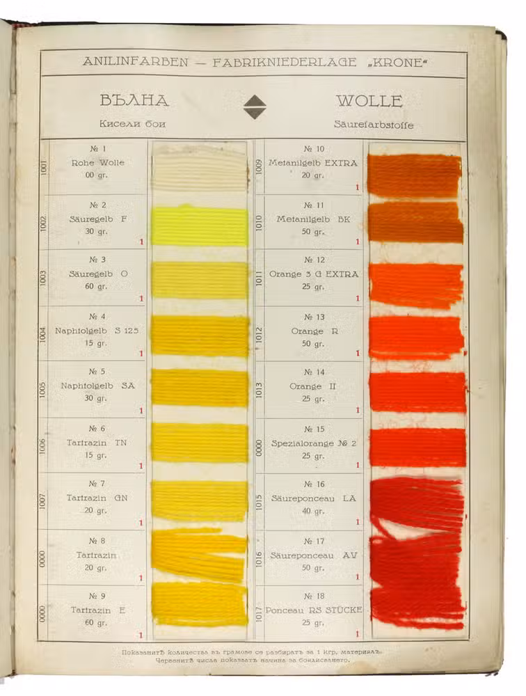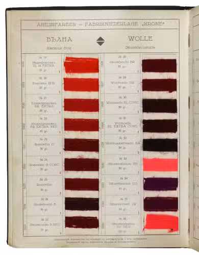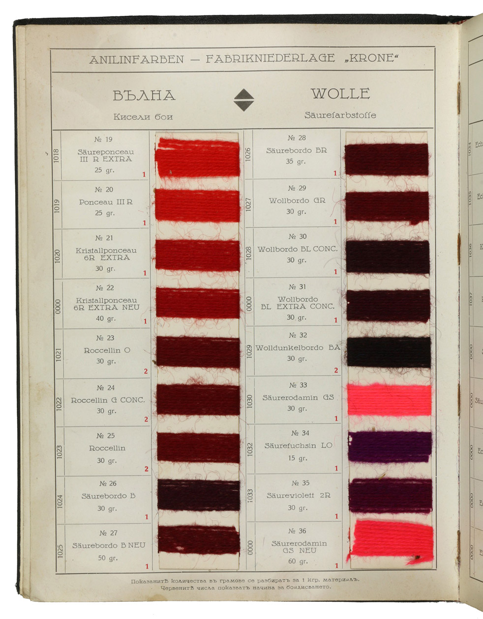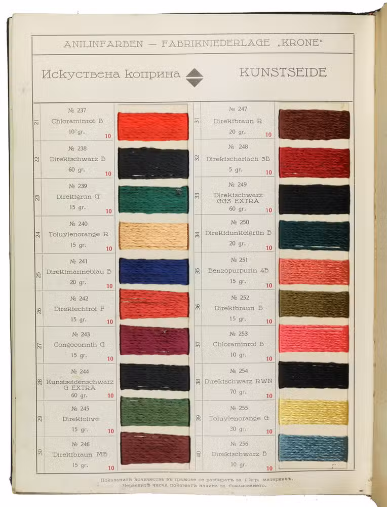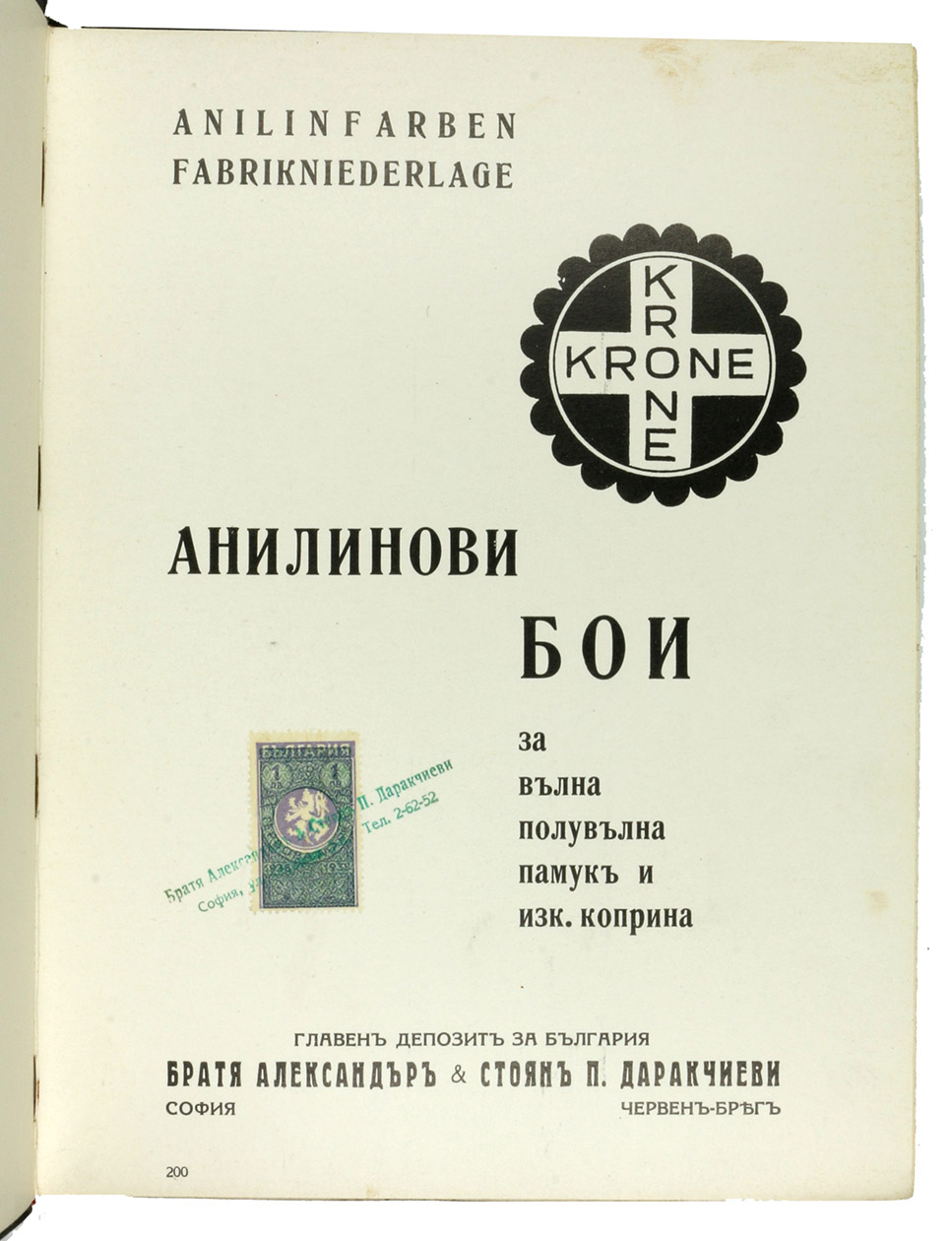 A well-preserved [1938?] collection of fabric swatches and yarn samples dyed in various colours and several varieties: wool, shajak (a fine Bulgarian wool fabric), blended wool, sulan (a heavier Bulgarian fabric) and "kunstseide" (probably rayon), published by the Bulgarian subsidiary of the German manufacturer of "Krone" aniline dyes. A Bulgarian 1 lev postage stamp (violet) stuck on the title-page (in a space apparently provided for that purpose, perhaps as a tax stamp) is dated 1938. Although the title is in Bulgarian, the title-page is headed "Anilinfarben Fabrikniederlage" with the large "Krone" logo.