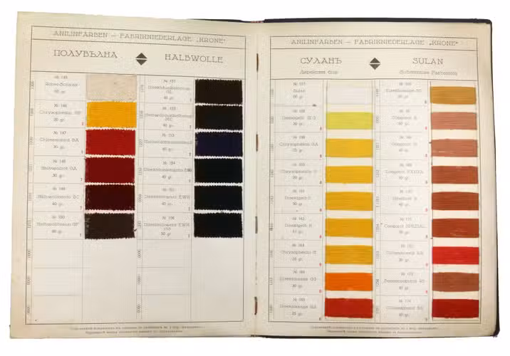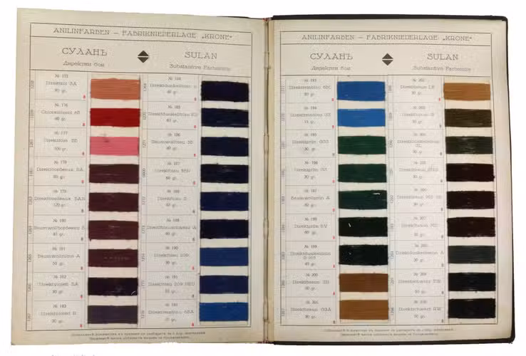 Bulgaria and other allies of Nazi Germany played a major role in supporting the German economic expansion during the 1930s and 1940s. The catchword "Großraumplanung" stood for the German industries aim to expand throughout the Balkans and Turkey as far as Iran. A major sector of National Socialist business interests, the chemical industry in particular grew rapidly. Its leading players such as I.G. Farben promoted their aniline dyes by establishing local subsidiaries in the East who would then distribute bilingual swatch-books such as the present specimen.