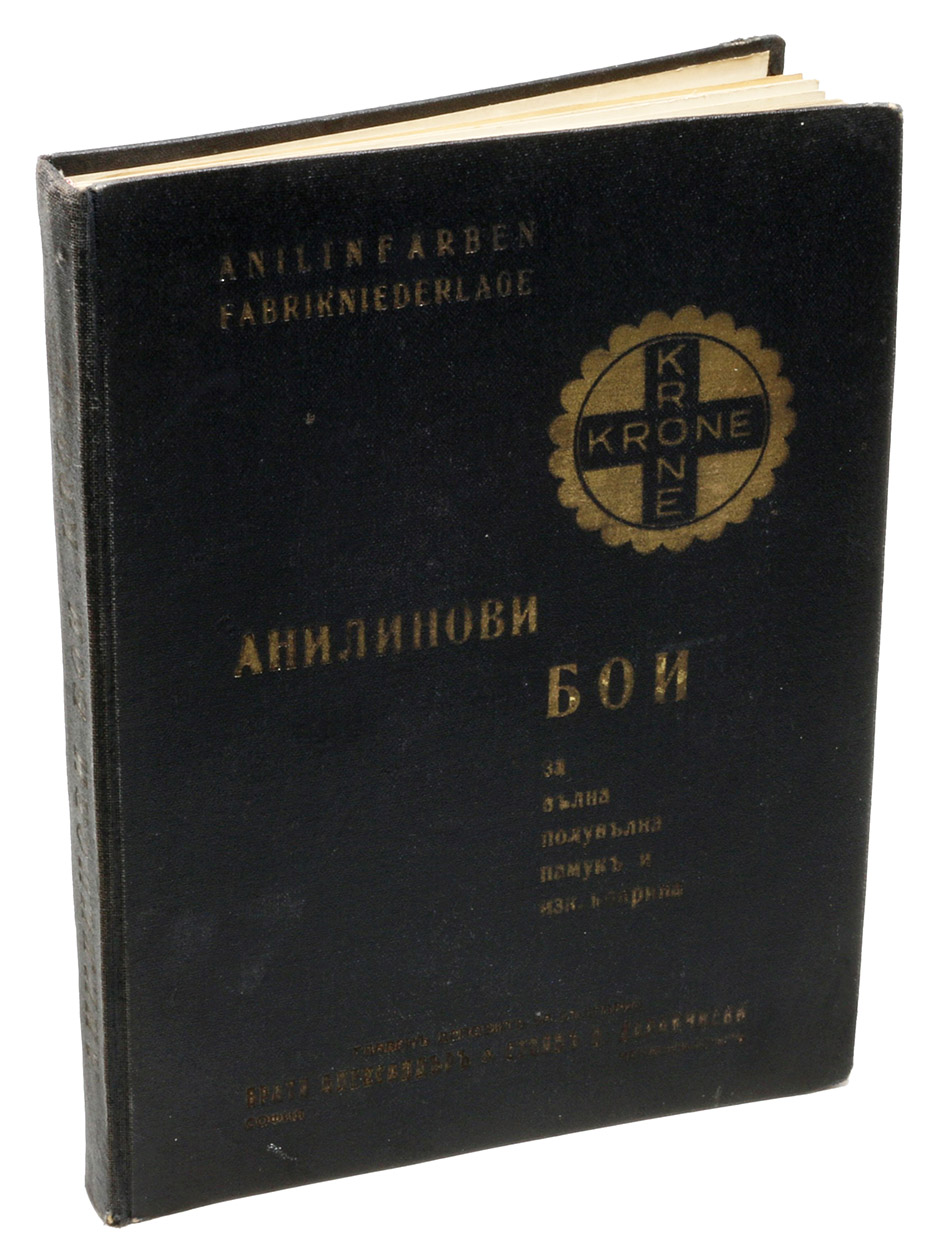 Sofia & Cherven Bryag, Alexander & Stoyan P. Darakchiev, [1938?]. With 256 well-preserved wool yarn and fabric samples showing a wide range of colours of aniline dyes, solidly mounted on thick cardboard. Original publishers gold-stamped black cloth with the "Krone" logo on the front board and title and publisher on the front board and spine. 26 pp.