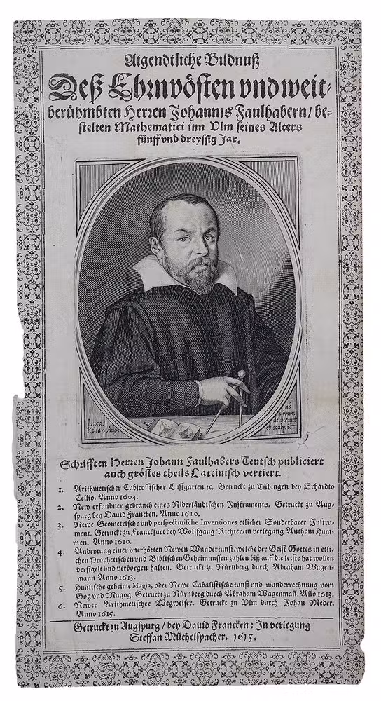 Rare portrait of the mathematician and Rosicrucian Johann Faulhaber (1580-1635), engraved by Lucas Kilian (1579-1637) in Augsburg. With a numbered list of six published works, with the names of their printers and publishers and the years of publication, 1604-1615. Faulhaber, the official surveyor of the city of Ulm, collaborated with Kepler and was the first to publish the Briggs logarithms in German. His "lasting accomplishment was the dissemination and explanation of the logarithmic method of calculation" (DSB).