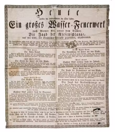 Heute werden die Unterzeichneten die Ehre haben, ein großes Wasser-Feuerwerk nach Wiener Art, unter dem Namen: Die Jagd der Riesenschlange, auf der Elbe, der Brühlschen Terrasse gegenüber, abzubrennen.