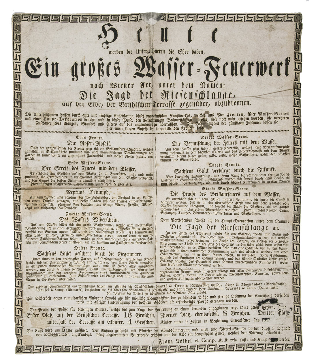 A rare (unique?) broadside announcing a fireworks display at the river Elbe (Dresden), organized by Franz Kölbel, a famed pyrotechnician from Graz (Austria). The show was held on 5 September 1829, and reviewed in the Wiener Zeitschrift für Kunst, Literatur, Theater und Mode. The paper praised the spectacular rockets, "deren ausgeworfenen Sterne so lange fortschimmerten und so hoch in den Lüften hin schwebten, dass sie sich unter die wirklichen Sterne zu verlieren schienen". Franz Köbel also sold fireworks at his shop in Graz.
