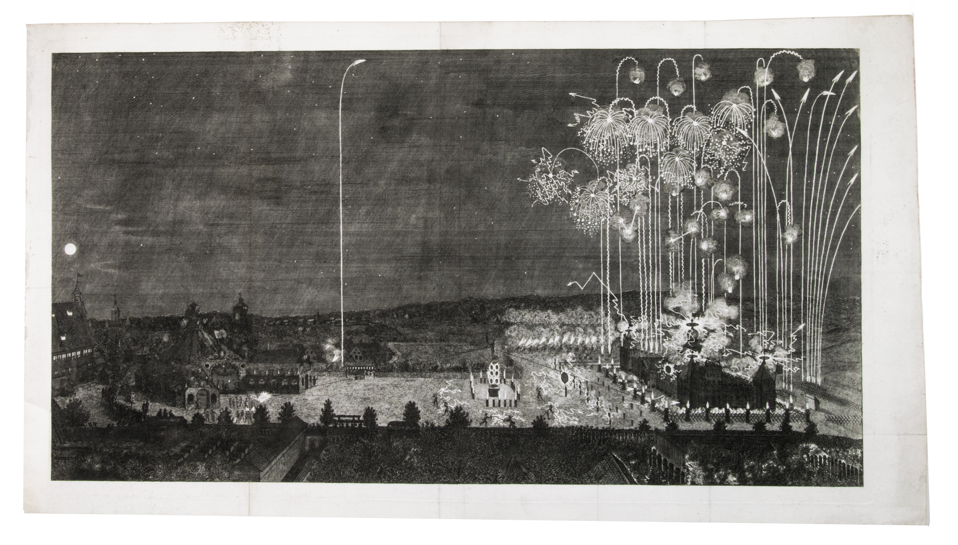 [Fireworks display celebrating the end of the Thirty Years' War in Nuremberg in 1650].