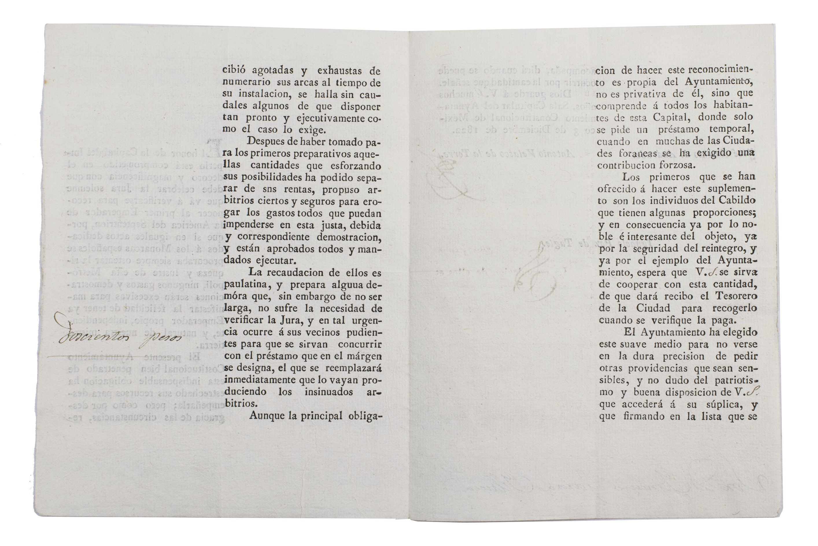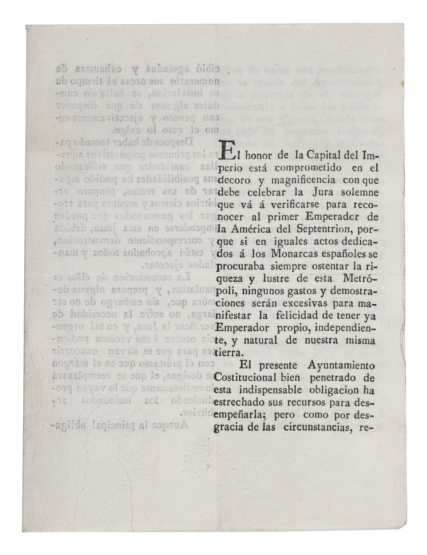 A formal appeal to the citizens of Mexico City for financial support in organizing the solemn oath of allegiance to Agustín de Iturbide (1783-1824), the first emperor of independent Mexico. The document is issued by the Constitutional city council of Mexico, which wanted the event to rival similar ceremonies held in the past, but did not have the funds to do so. It therefore turned to the city's wealthiest citizens to ask for a temporary loan, which would be reimbursed as soon as possible. With the present pamphlet, the council attempted to appeal to the citizens sense of pride, patriotism, and community, framing the request as a civic duty. Anyone willing to participate was asked to sign the attached list. The members of the city council themselves had already contributed. The present work is signed by three of them in the hope to encourage others to follow their example.