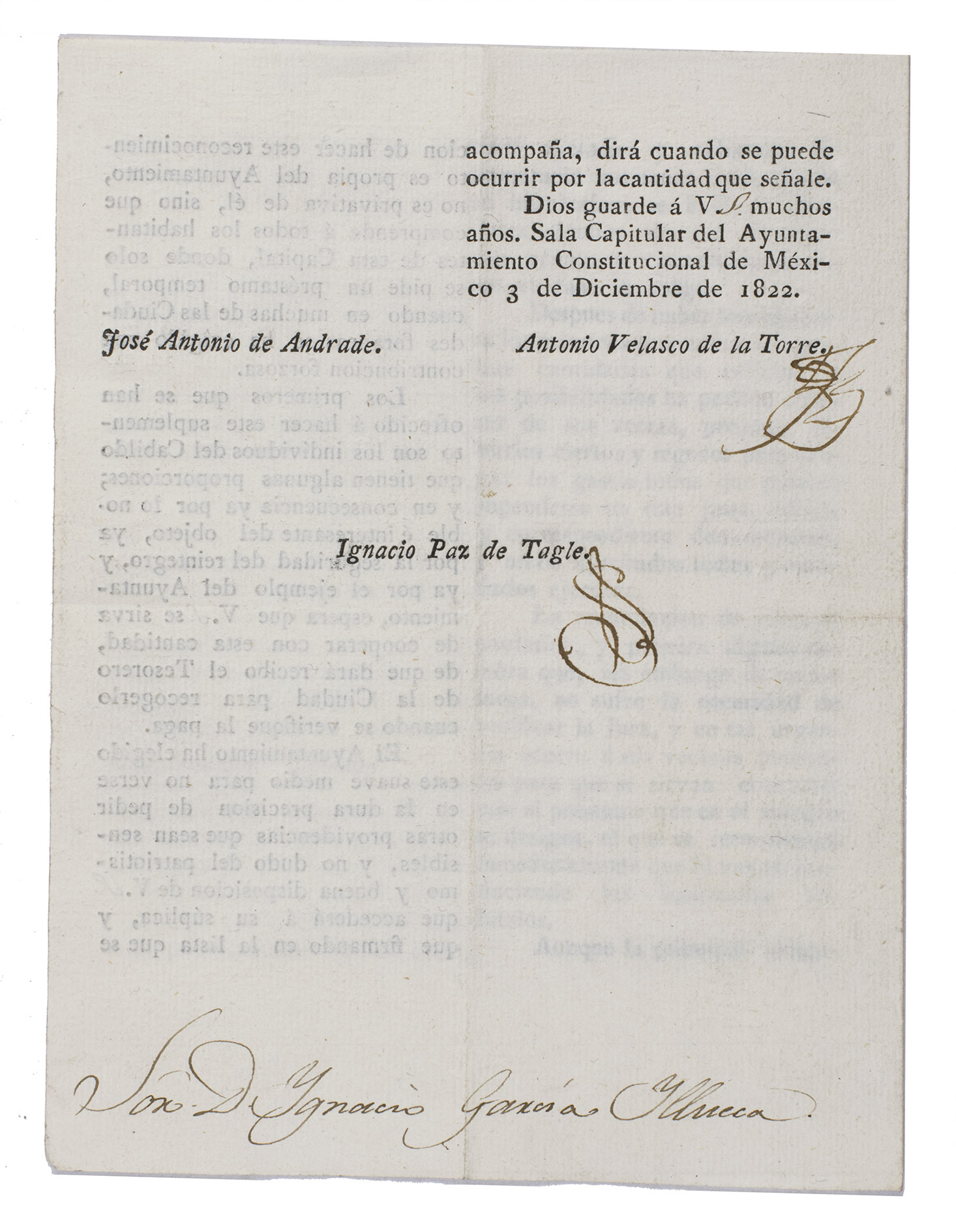 Sala Capitular del Ayuntamiento Constitucional de México [= City hall, Mexico City], 3 December 1822. Ca 20 x 15.5 cm. [4] pp.
