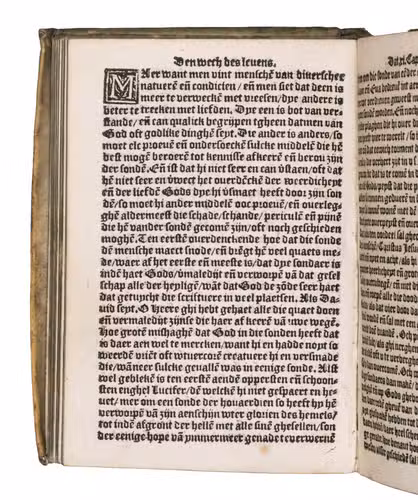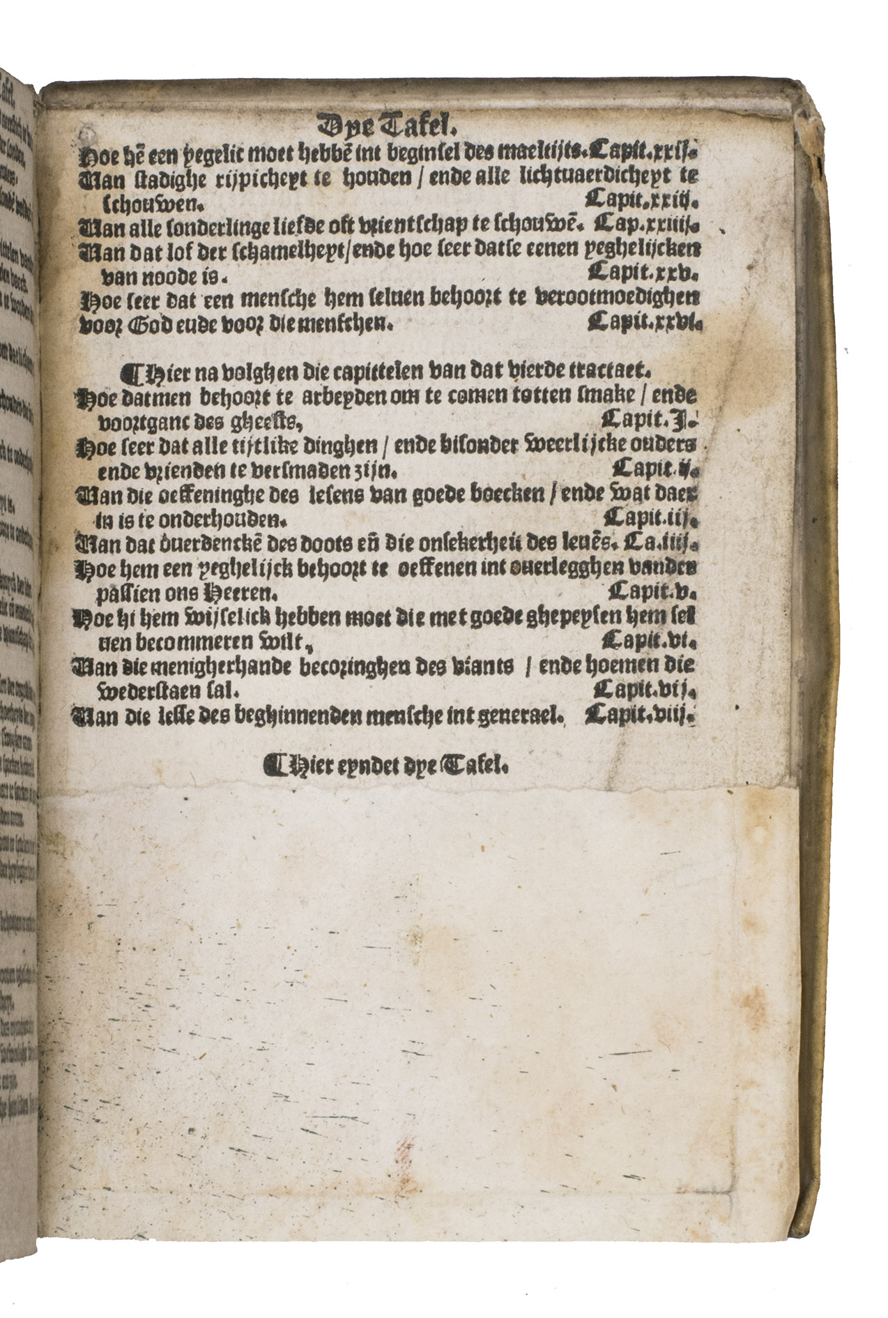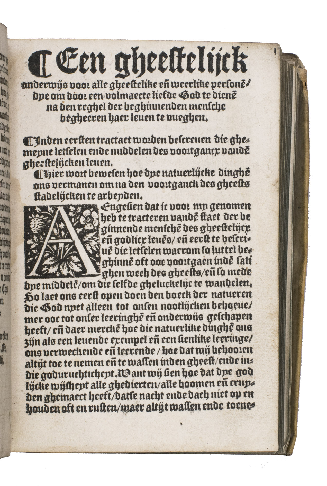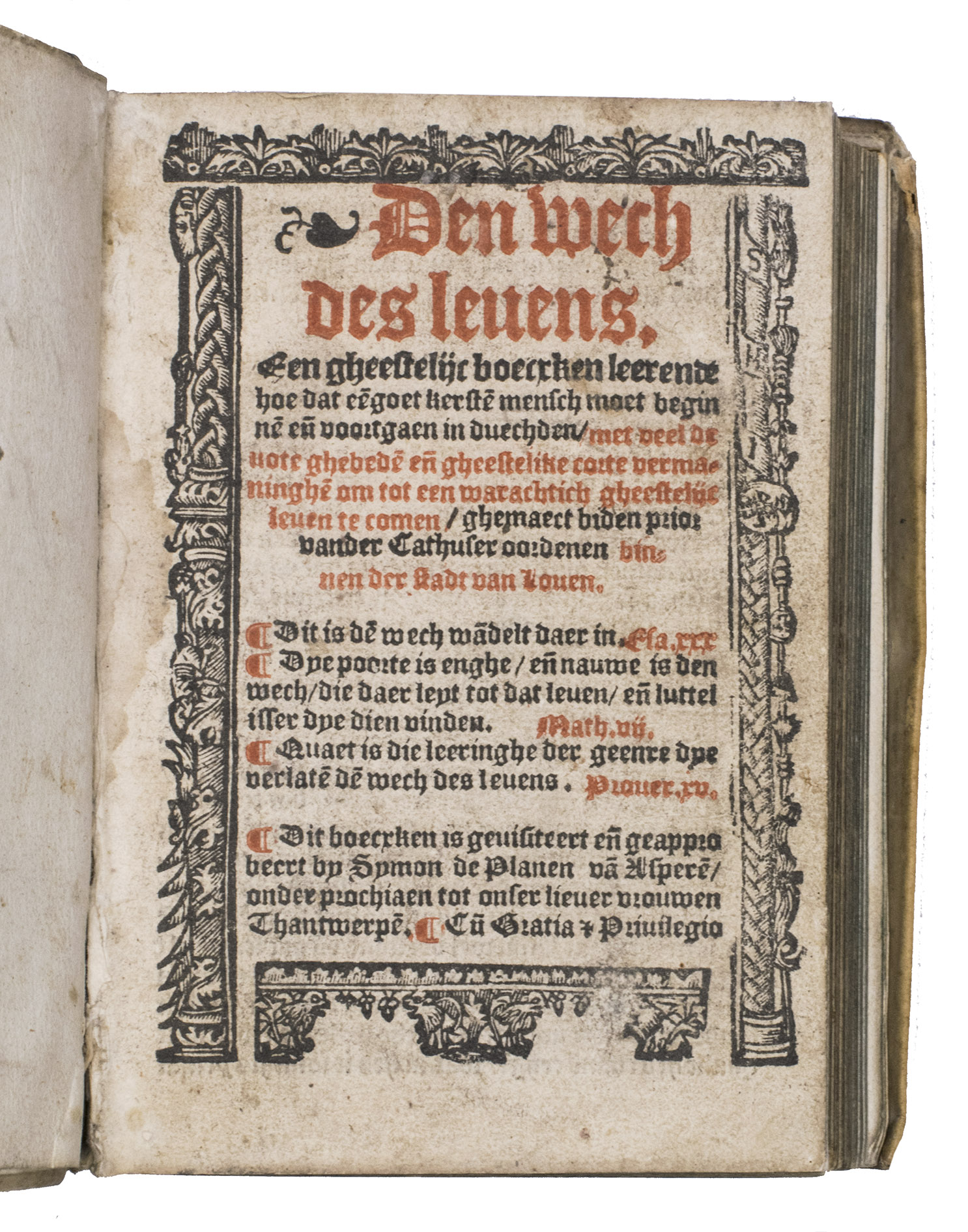 Third(?) edition of a rare 16th-century Dutch devotional work written by Floris van Haarlem, Carthusian prior at Louvain and edited by the Antwerp priest Simon van Planen. With a dedicatory letter to Gheraert Heerman, rector and confessor of the Roman Catholic monasteries at Leiden, dated Louvain, 2 April 1542. The work itself is divided into four treatises, with an extensive index.