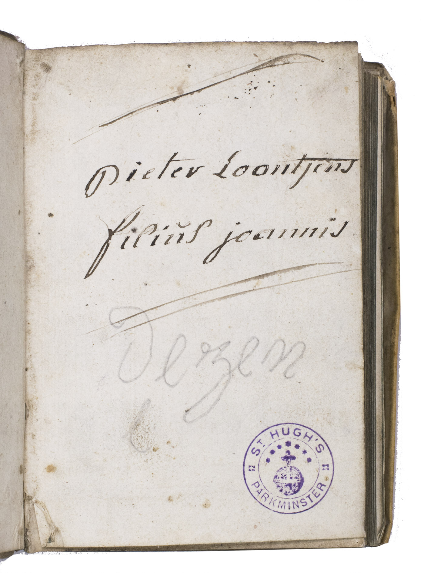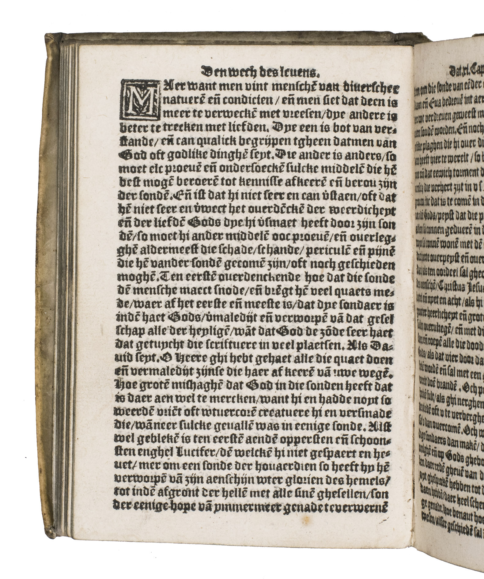 With library stamp of "St. Hugh's, Parkminster" and manuscript owner's inscription entry of "Pieter Loontjens, filius Johannis" on flyleaf. First and last leave somewhat soiled, four leaves loose in the last quire, some occasional thumbing and colophon on last leave cut off and restored. Binding slightly soiled and spine chipped. Still a good copy. Cf. BCNI 01998, 02056, 02135, 02329, 02870, 02871; Belg. Typ. 5805, 1159-1162; BMC STC Dutch, p. 76; Jaspers 289-292; Machiels F-155-158.