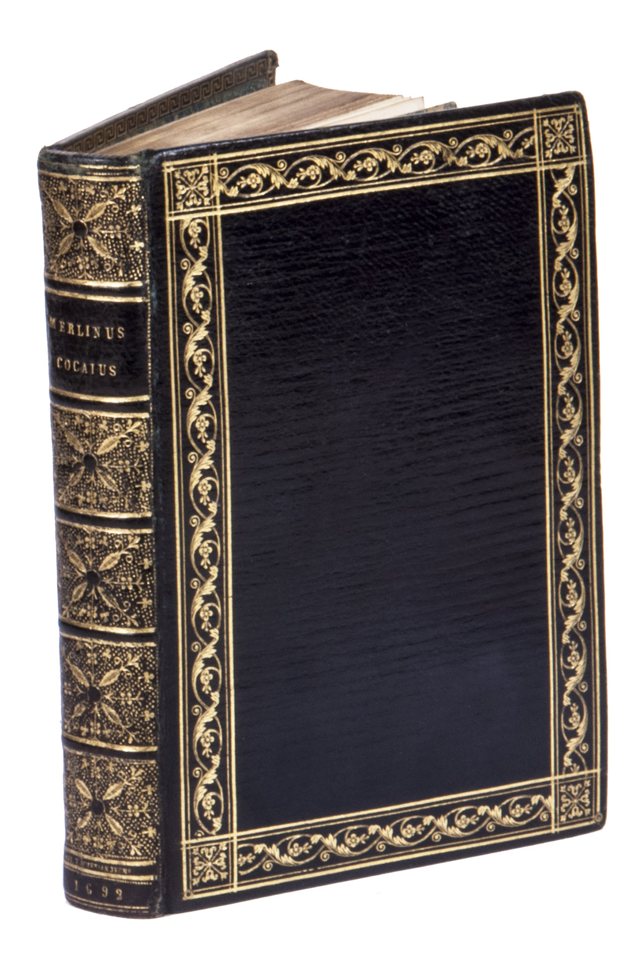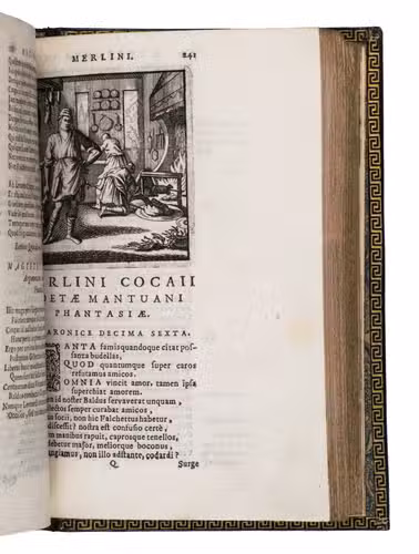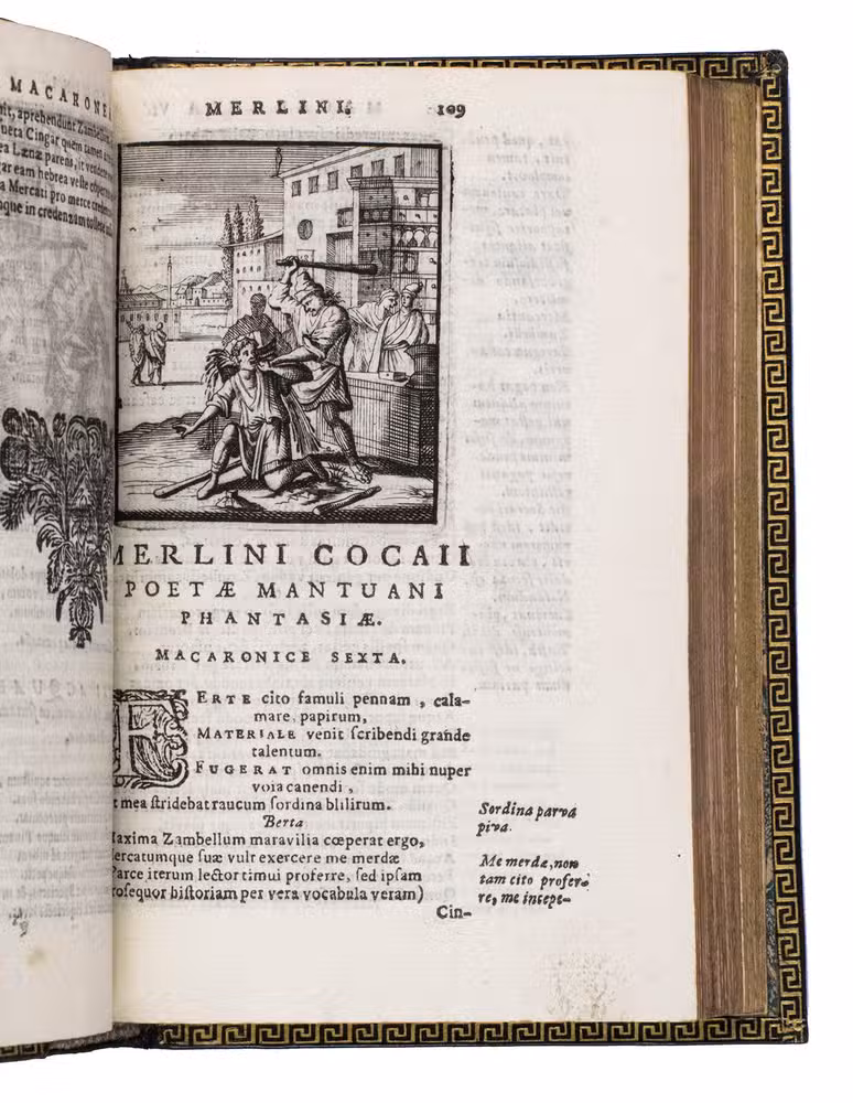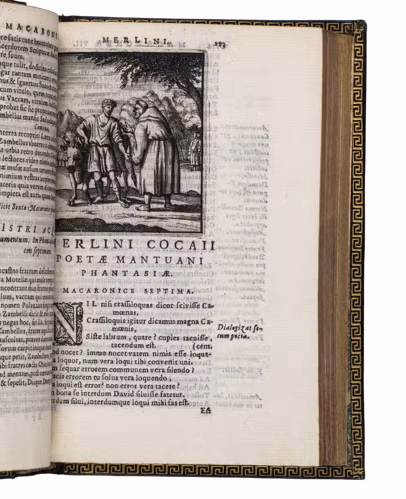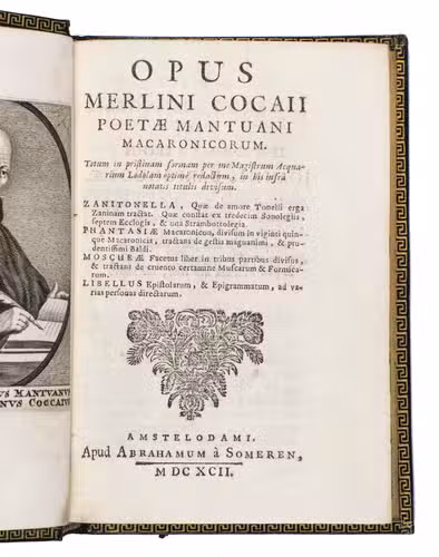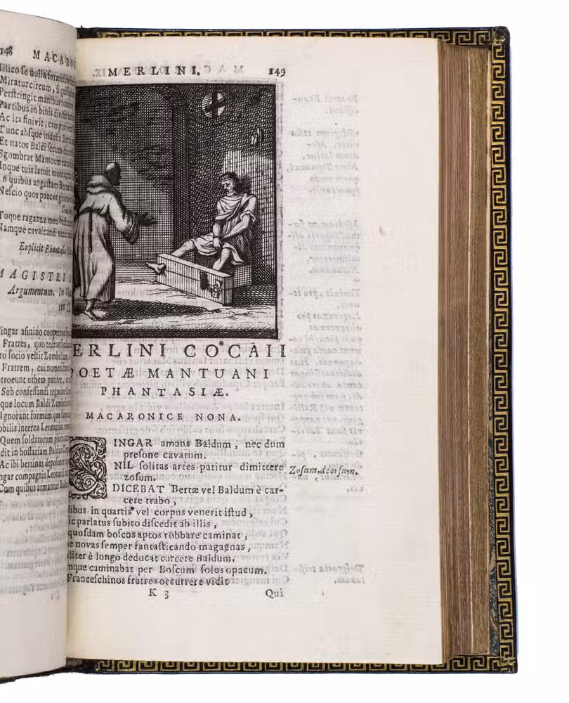 Remarkable work by one of the principal practitioners of Italian Macaronic verse, sumptuously bound by a renowned French binder. It relates the adventures of Baldo, a fictitious hero, in 25 macaroni or cantos. Together they tell of Baldo's encounters with witches, pirates, and demons, his imprisonment, battles with the authorities, and journey to the underworld. Each macarone is adorned by a beautiful engraving with a scene from that part of the poem. These engravings were likely made for the present edition as it is the only one in which they appear. The work itself became very popular after it was written and was even cited by authors as François Rabelais (1483/94-1553).