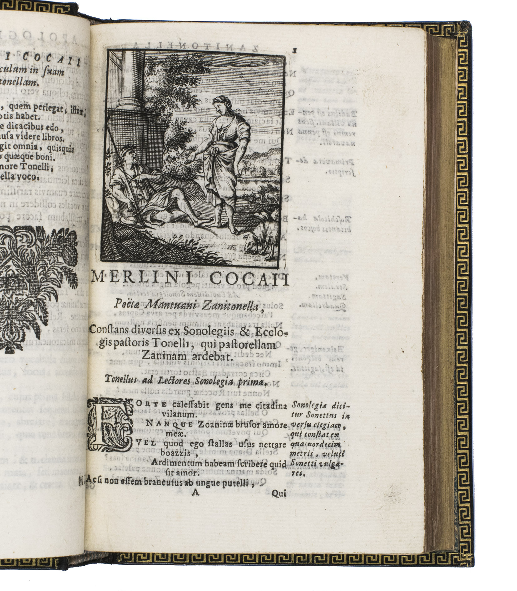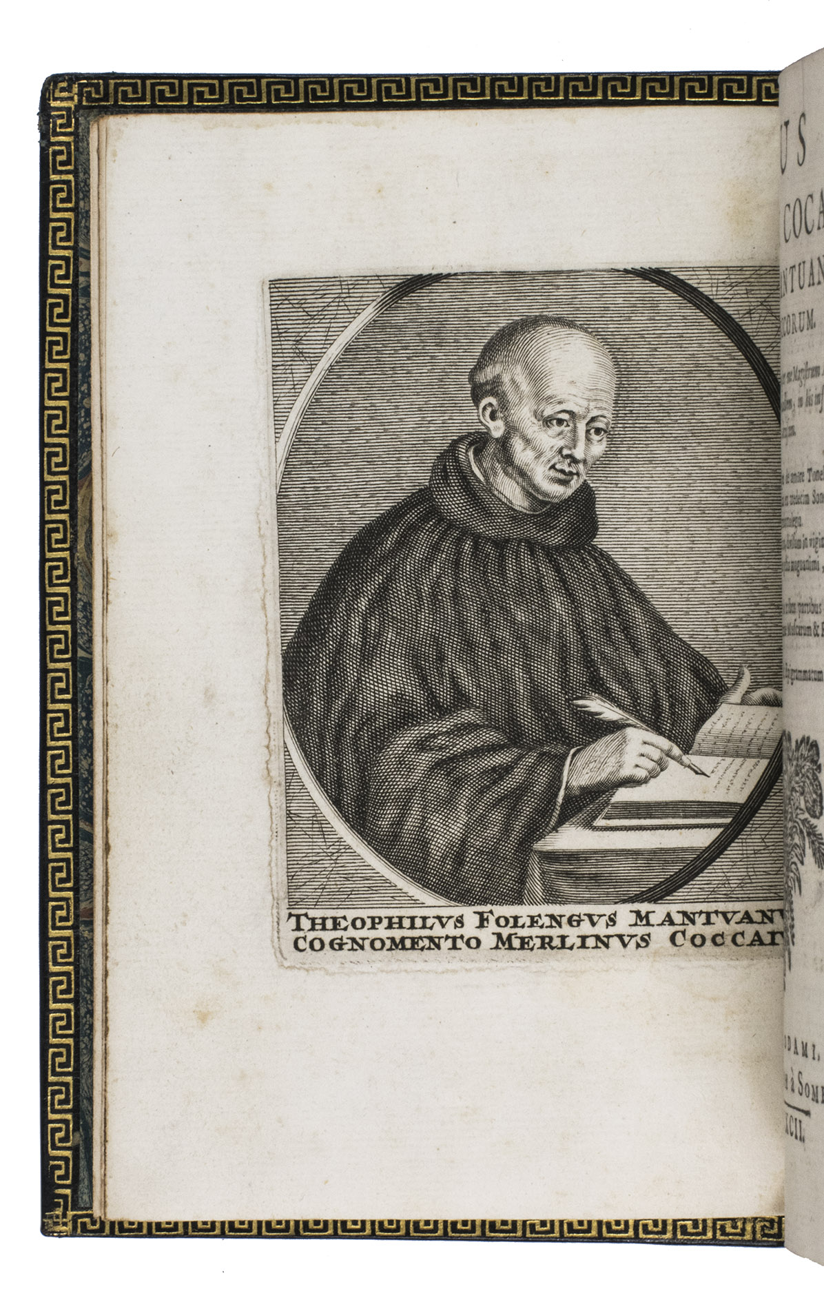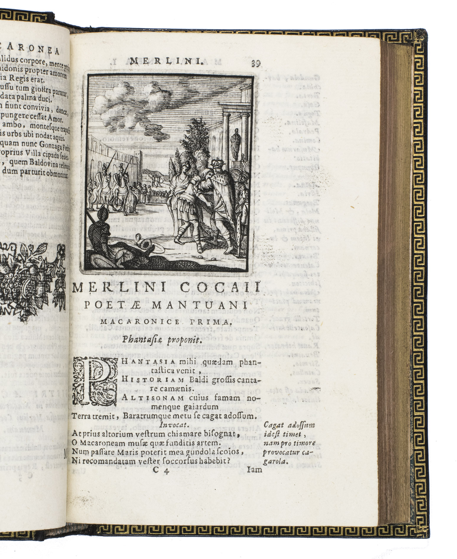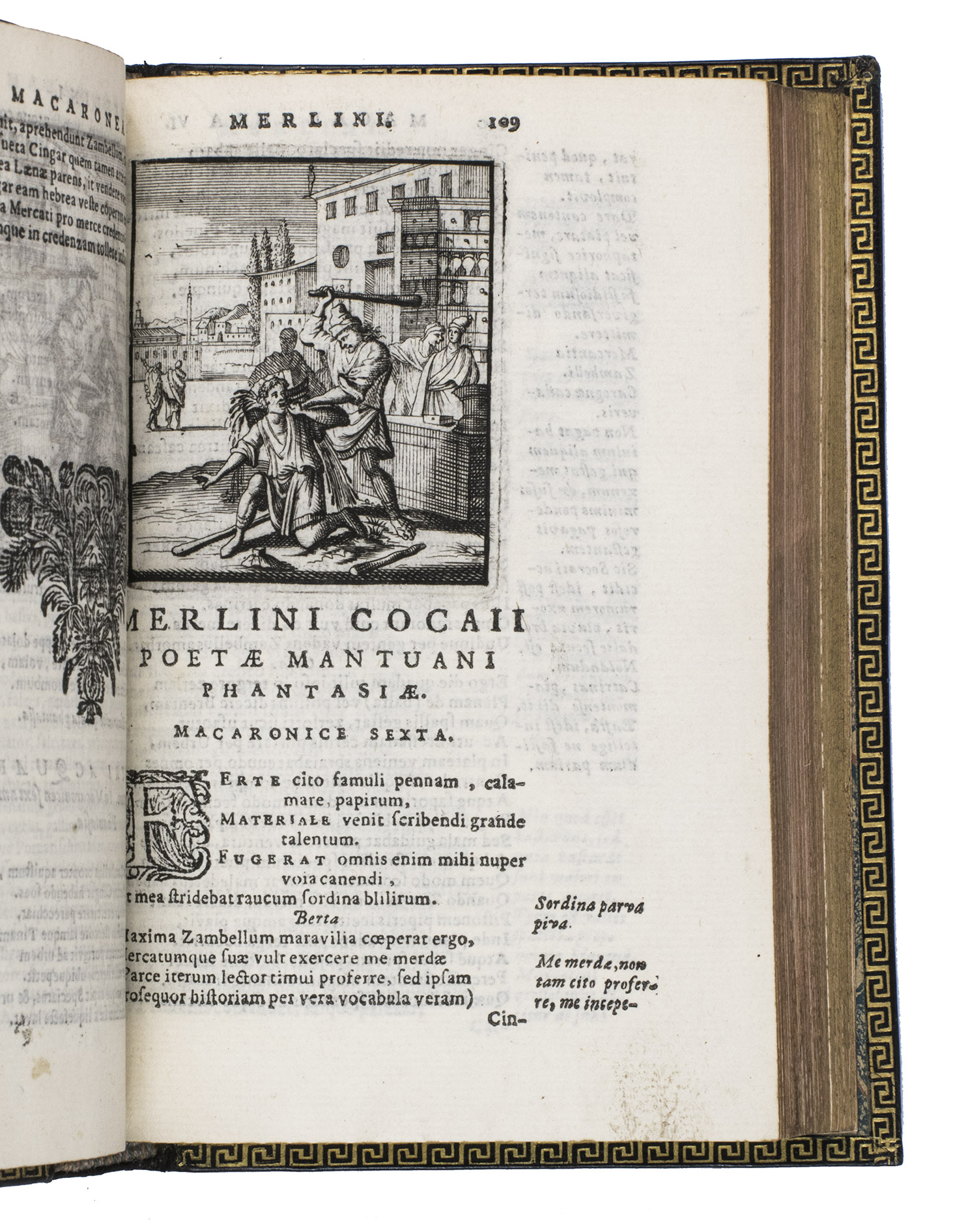 Remarkable work by one of the principal practitioners of Italian Macaronic verse, sumptuously bound by a renowned French binder. It relates the adventures of Baldo, a fictitious hero, in 25 macaroni or cantos. Together they tell of Baldo's encounters with witches, pirates, and demons, his imprisonment, battles with the authorities, and journey to the underworld. Each macarone is adorned by a beautiful engraving with a scene from that part of the poem. These engravings were likely made for the present edition as it is the only one in which they appear. The work itself became very popular after it was written and was even cited by authors as François Rabelais (1483/94-1553).