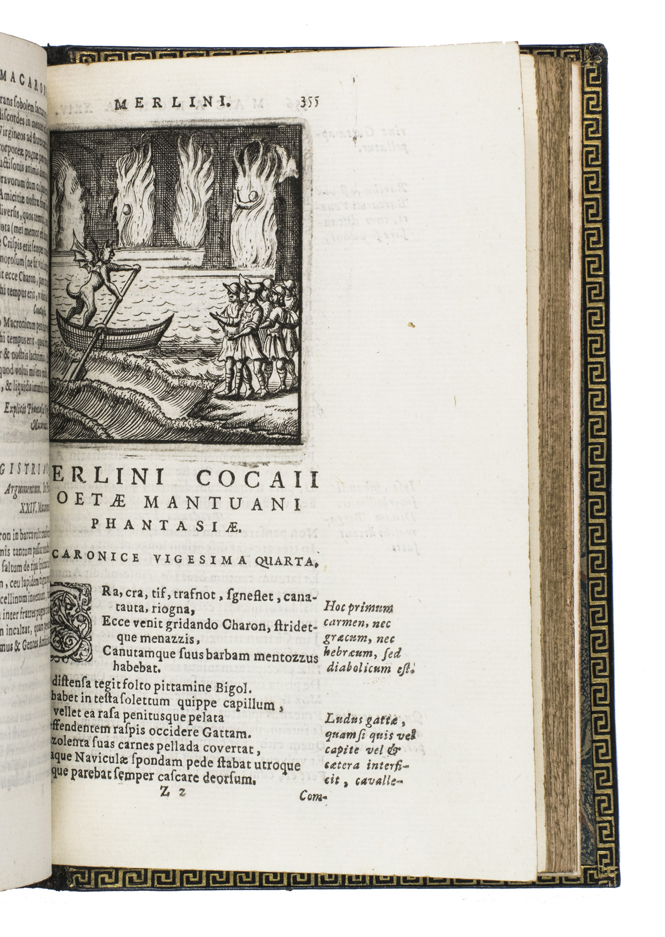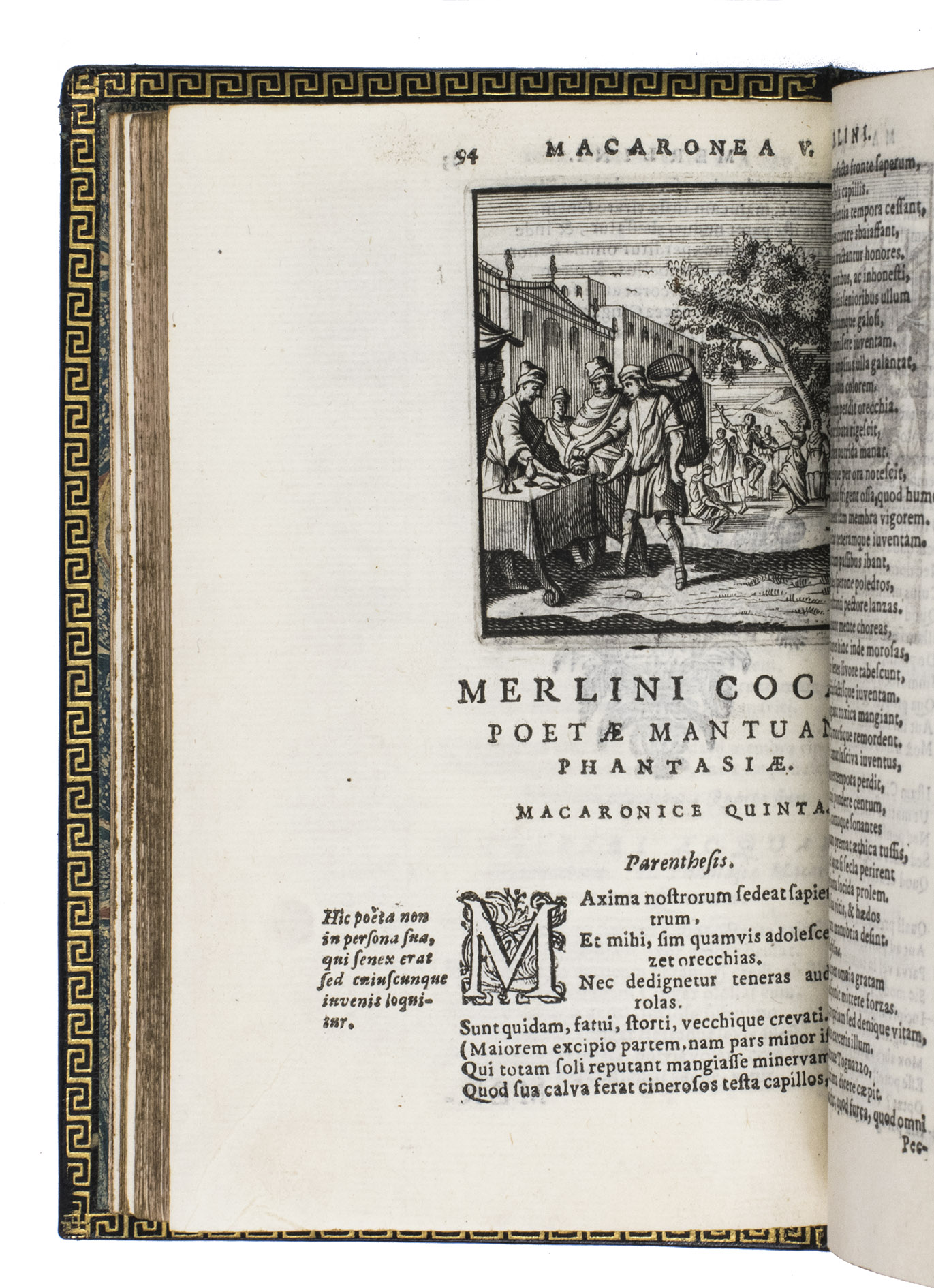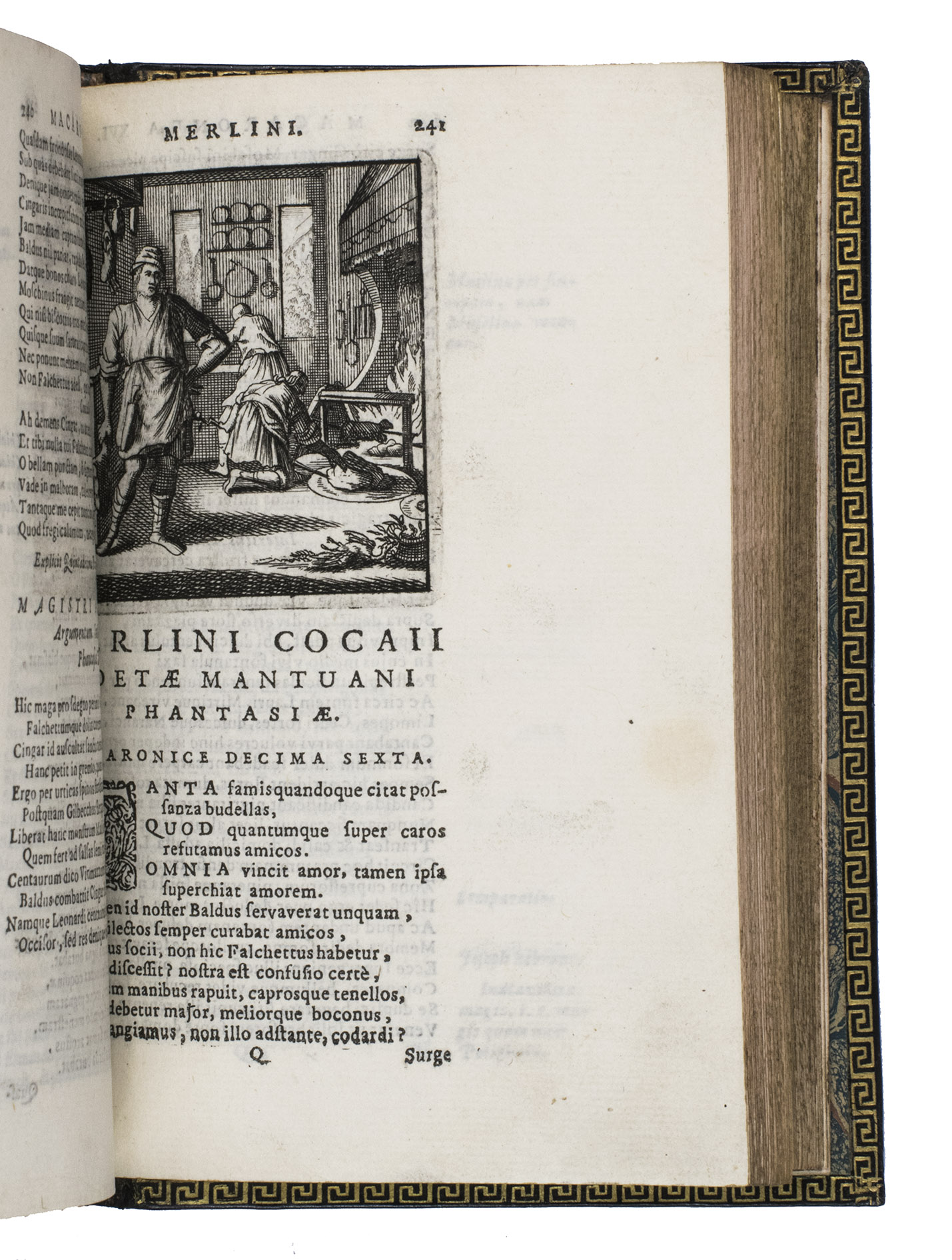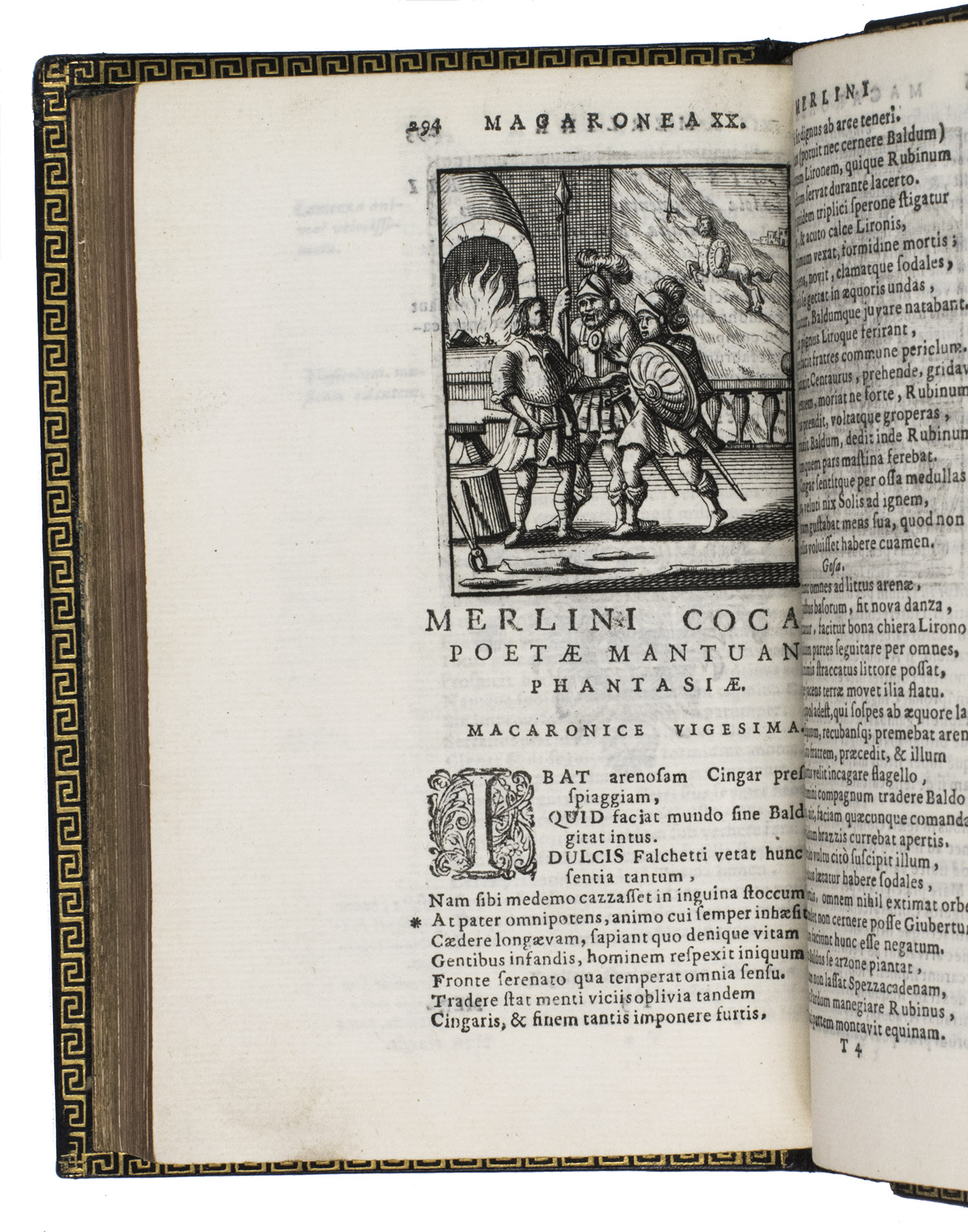 Remarkable work by one of the principal practitioners of Italian Macaronic verse, sumptuously bound by a renowned French binder. It relates the adventures of Baldo, a fictitious hero, in 25 macaroni or cantos. Together they tell of Baldo's encounters with witches, pirates, and demons, his imprisonment, battles with the authorities, and journey to the underworld. Each macarone is adorned by a beautiful engraving with a scene from that part of the poem. These engravings were likely made for the present edition as it is the only one in which they appear. The work itself became very popular after it was written and was even cited by authors as François Rabelais (1483/94-1553).