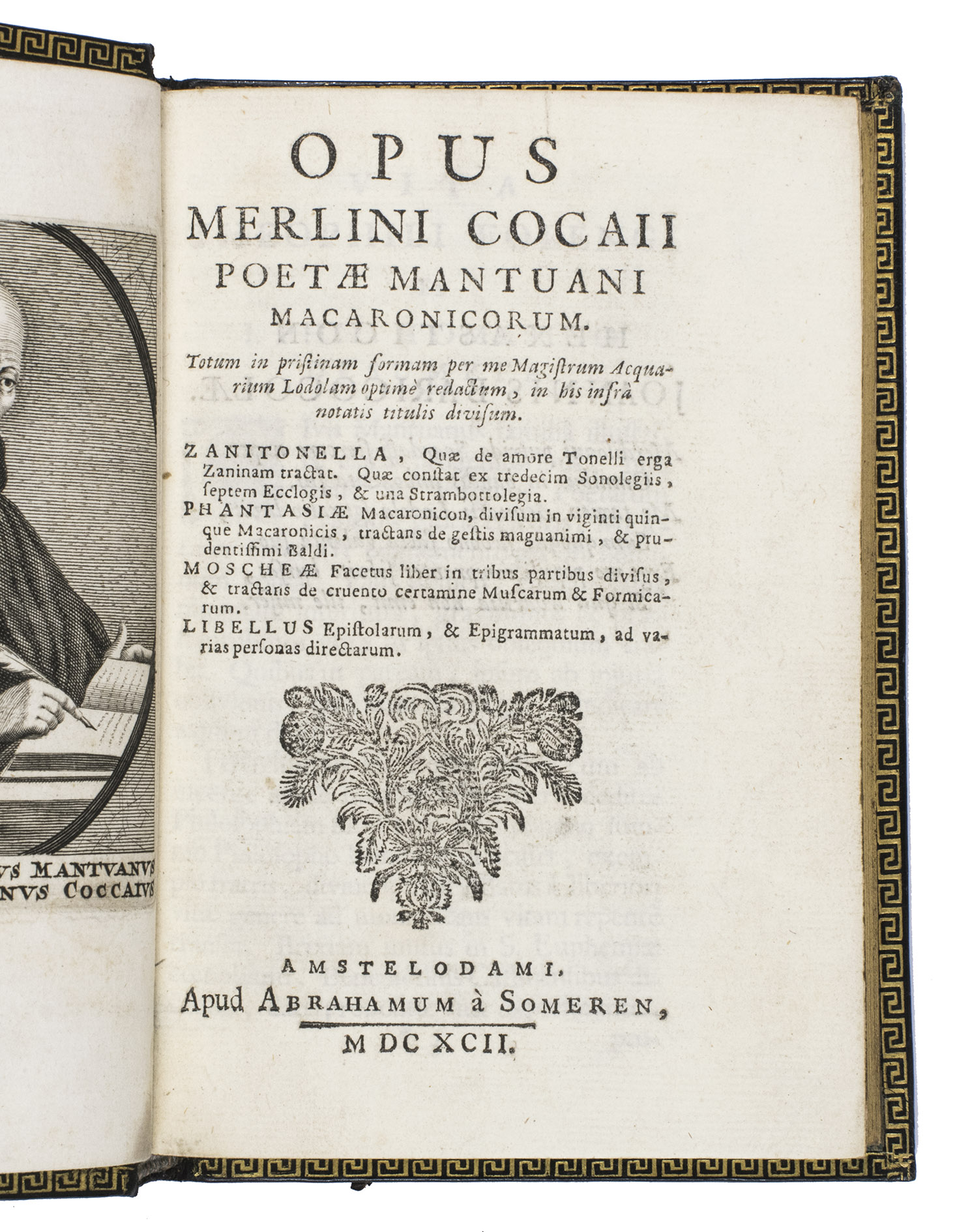 Teofilo Folengo (1491-1544), also known under his pseudonym Merlinus Cocaius, was born near Mantua and entered the Benedictine Order when he was 17 or 18 years old. However, he abandoned monastic life for the company of a woman in 1516 and then supported himself through his writing. Baldo, first printed in 1517, was his first work. It was meant as a parody of chivalric poetry and Virgilian epics. Folengo's use of language significantly aided with that as Macaronic verse, which combines Italian vernacular with Latin, is intended to be comical. Although the work was initially censored due to Folengo's mockery of the clergy, it was quite popular throughout the 16th- and 17th centuries. The present edition, which dates from the end of this time period, is a little bit of a mystery. It is said to have been printed in Naples (Brunet and Weller (via STCN)), but Rahir disputes this on the basis of the typographical material, which, according to him, points to Amsterdam. If he is correct, the present edition is the only early modern edition of the work printed outside of Italy.