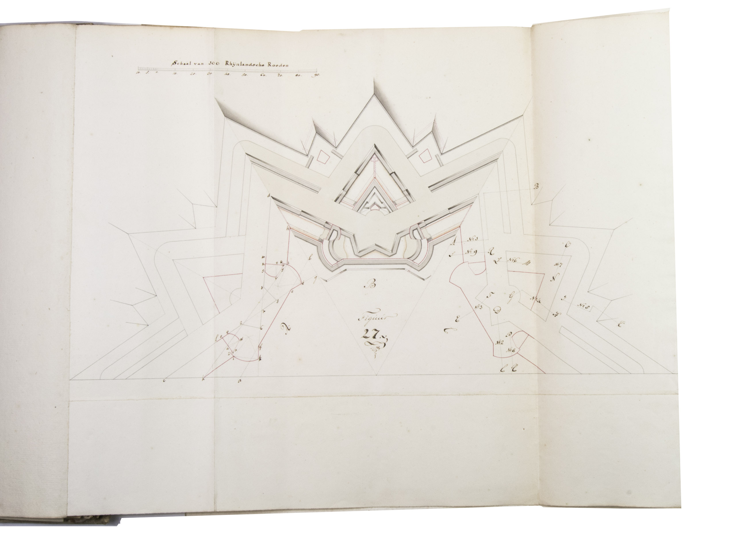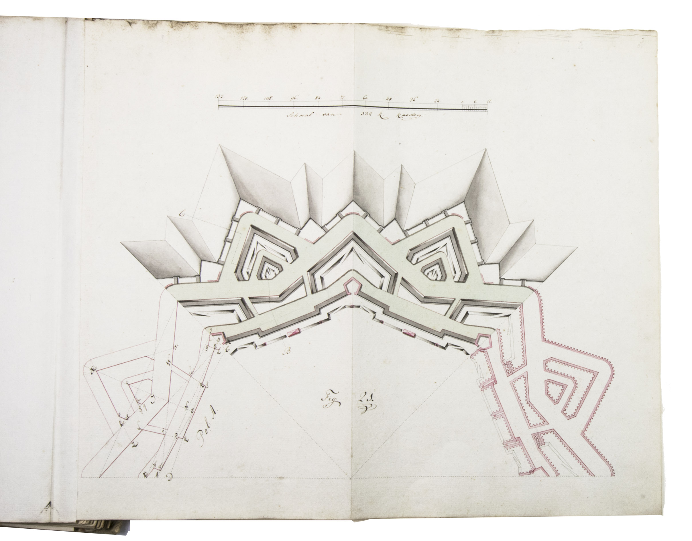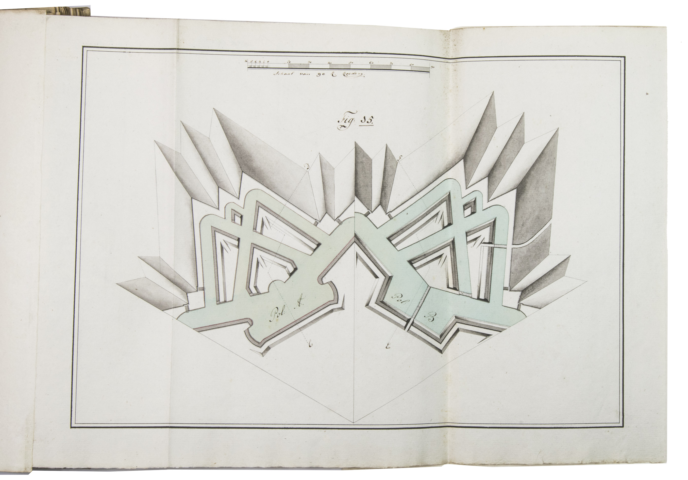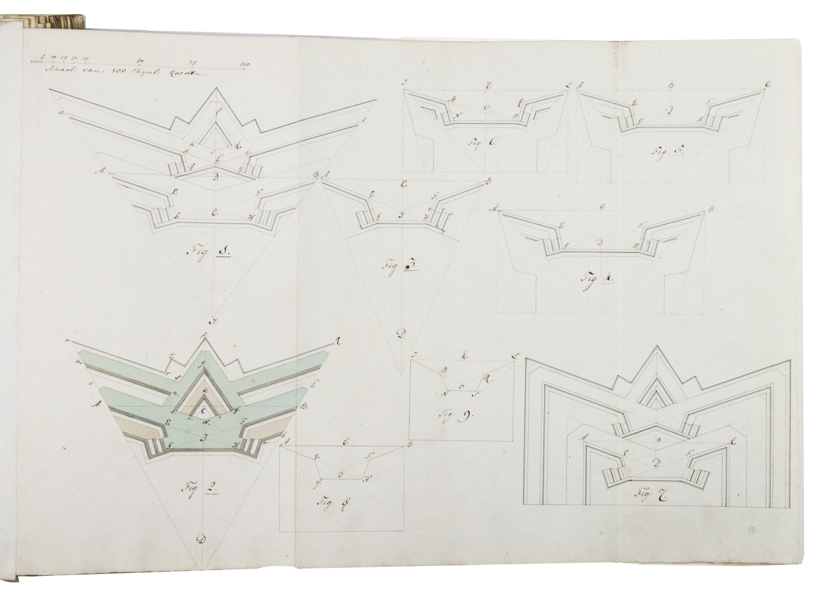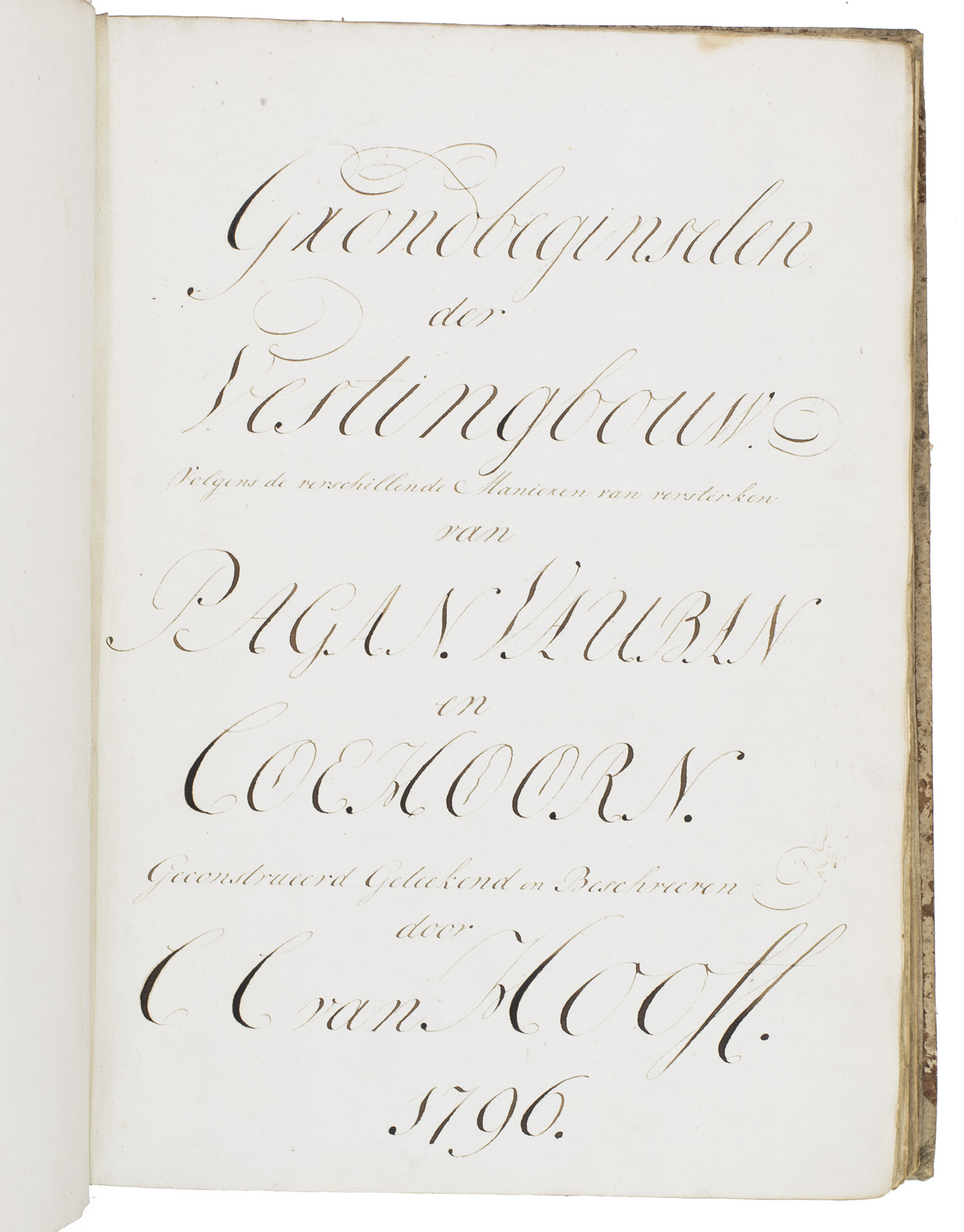 Unpublished manuscript for a complete introductory course in the design and construction of fortifications, with 19 large folding leaves with meticulously drawn fortification plans and sections in colour. It was compiled, drawn and written by Cornelis Christiaan van Hooff (1778-1812), then an 18-year-old Lieutenant in the Dutch Napoleonic corps of military engineers. The title notes that it follows the methods of Blaise François, Comte de Pagan (1604-1665), Sébastien Le Prestre de Vauban (1633-1707) and Menno van Coehoorn (1634-1704), the greatest 17th-century French and Dutch masters of the art of fortification. Van Hooff began to study law but switched to engineering. The French Revolutionary army invaded the Netherlands in 1794/95 and the Batavian Republic was proclaimed on 19 January 1795. Van Hooff became a Lieutenant in the corps of engineers on 28 October 1795. He produced the present manuscript in the following year. He was to rise to the rank of Lieuitenant-Colonel in 1809, but requested and received an honorary discharge in 1810, apparently due to poor health, and died in 1812 at age 33.