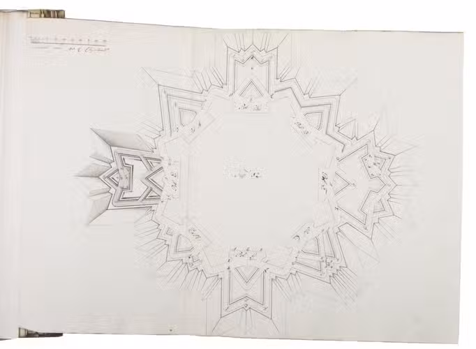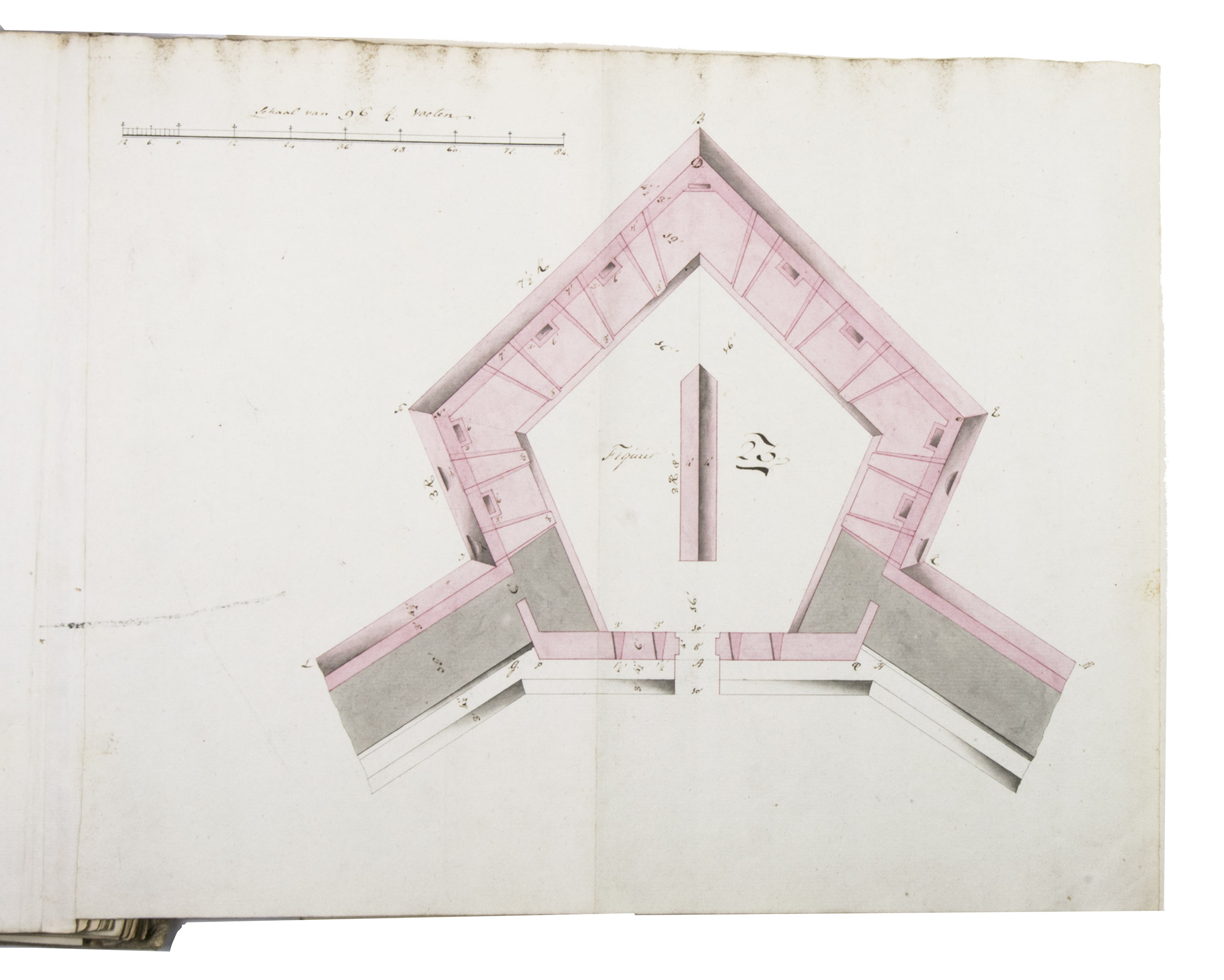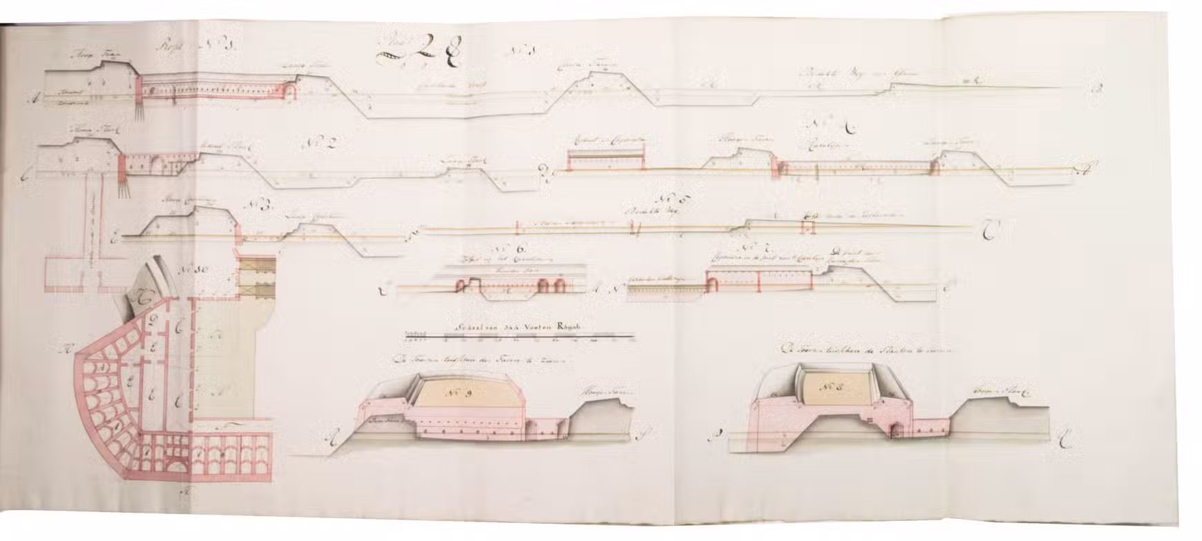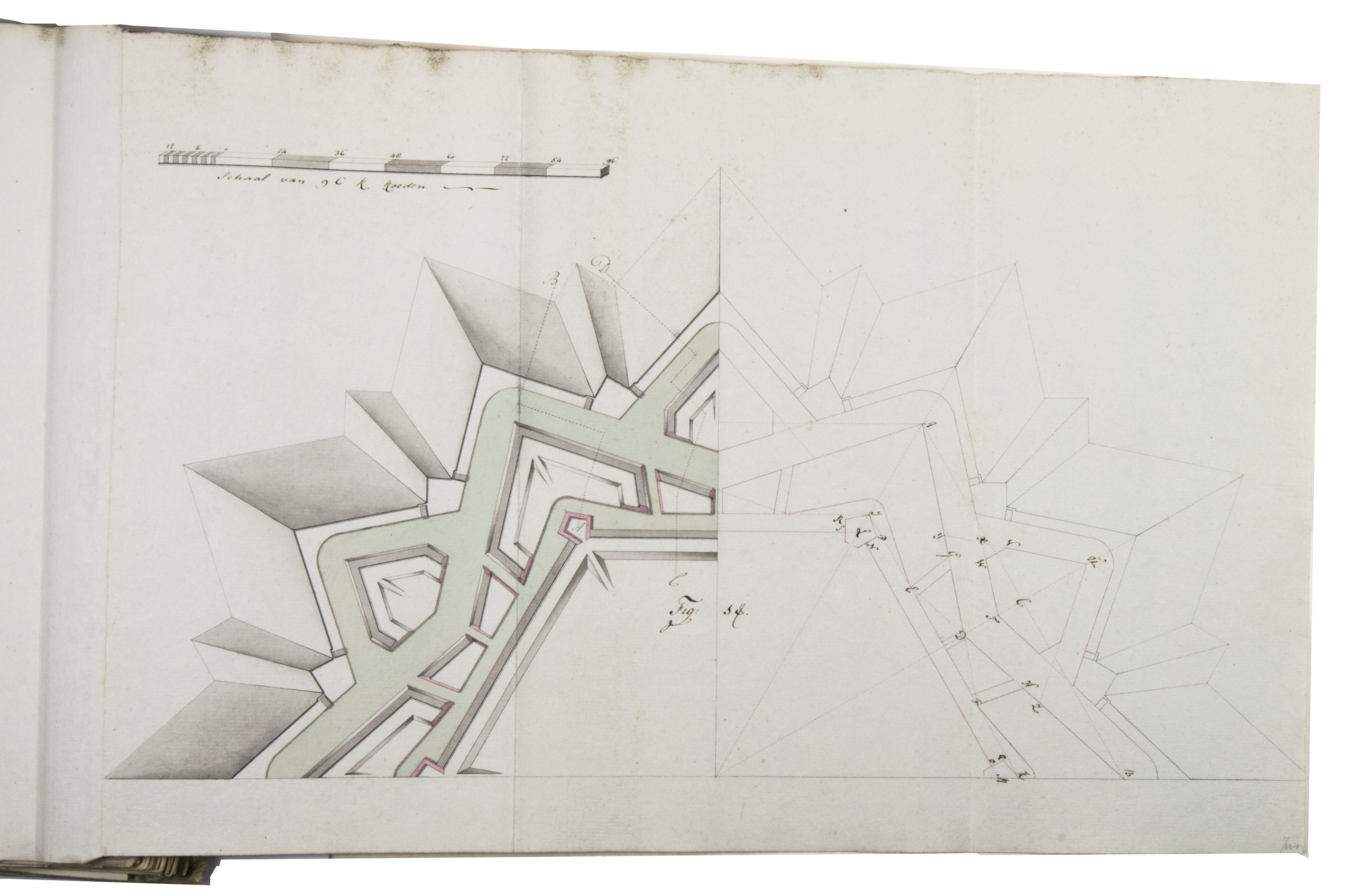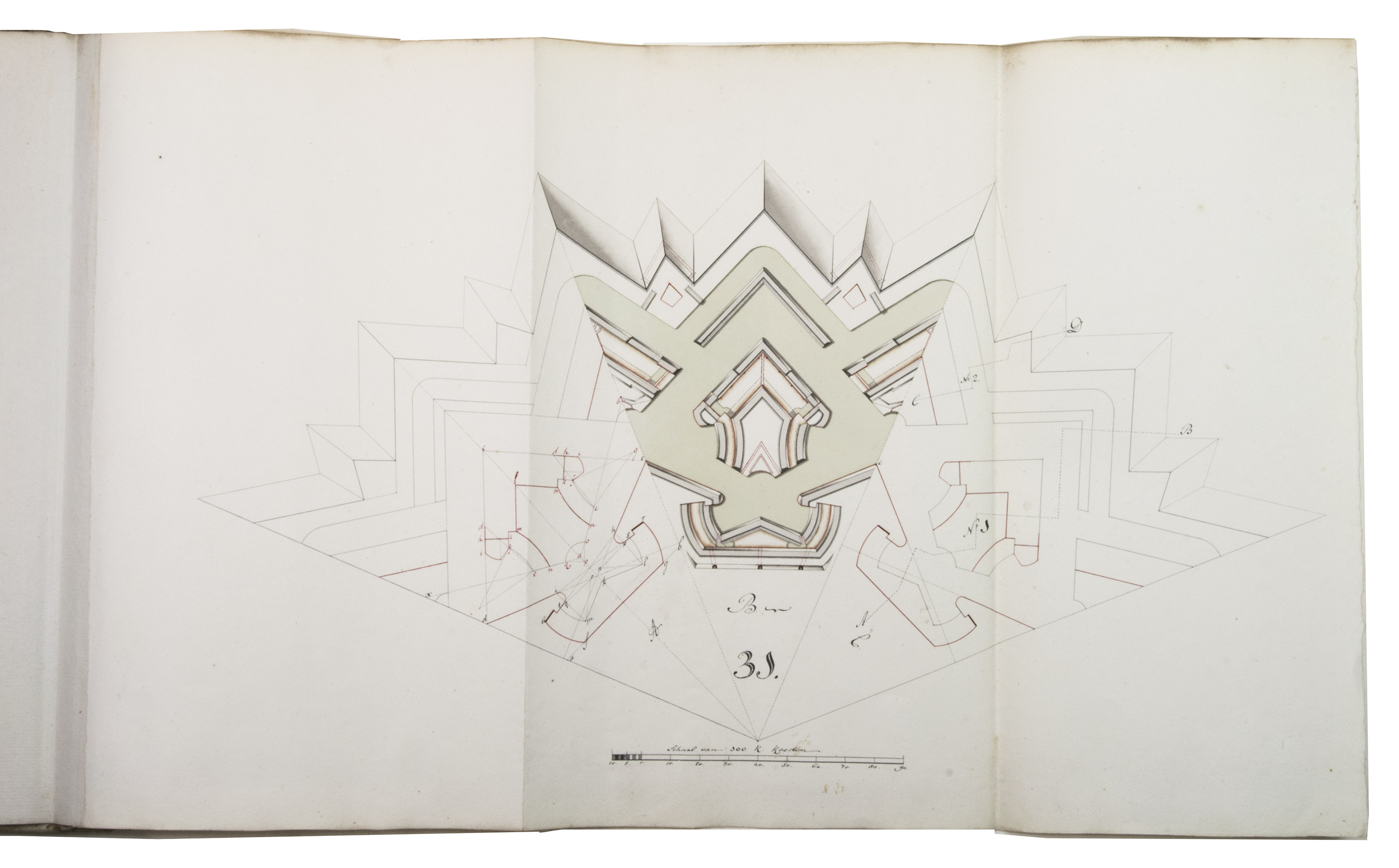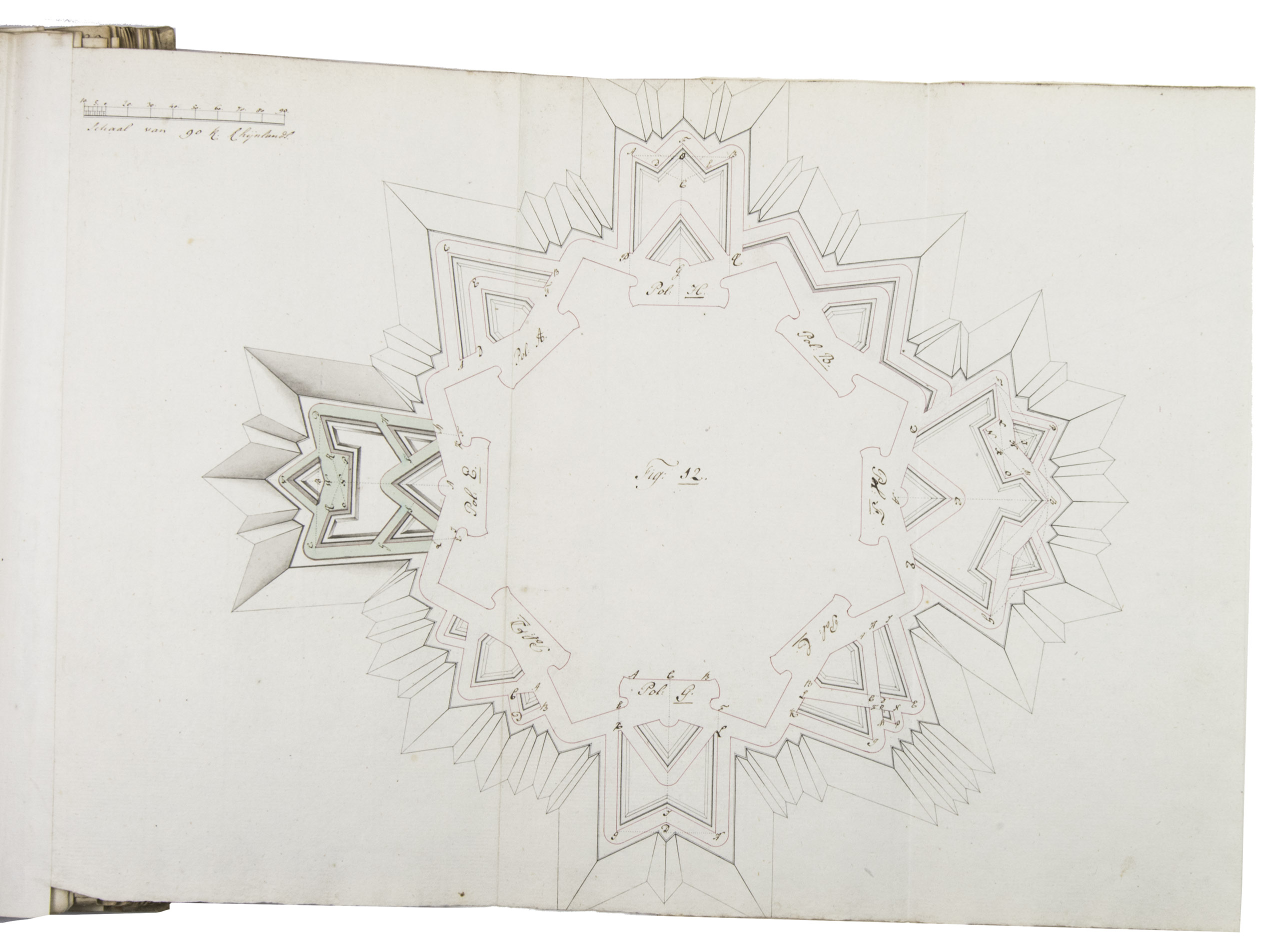 Unpublished manuscript for a complete introductory course in the design and construction of fortifications, with 19 large folding leaves with meticulously drawn fortification plans and sections in colour. It was compiled, drawn and written by Cornelis Christiaan van Hooff (1778-1812), then an 18-year-old Lieutenant in the Dutch Napoleonic corps of military engineers. The title notes that it follows the methods of Blaise François, Comte de Pagan (1604-1665), Sébastien Le Prestre de Vauban (1633-1707) and Menno van Coehoorn (1634-1704), the greatest 17th-century French and Dutch masters of the art of fortification. Van Hooff began to study law but switched to engineering. The French Revolutionary army invaded the Netherlands in 1794/95 and the Batavian Republic was proclaimed on 19 January 1795. Van Hooff became a Lieutenant in the corps of engineers on 28 October 1795. He produced the present manuscript in the following year. He was to rise to the rank of Lieuitenant-Colonel in 1809, but requested and received an honorary discharge in 1810, apparently due to poor health, and died in 1812 at age 33.