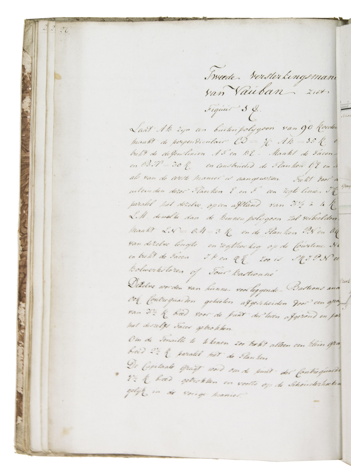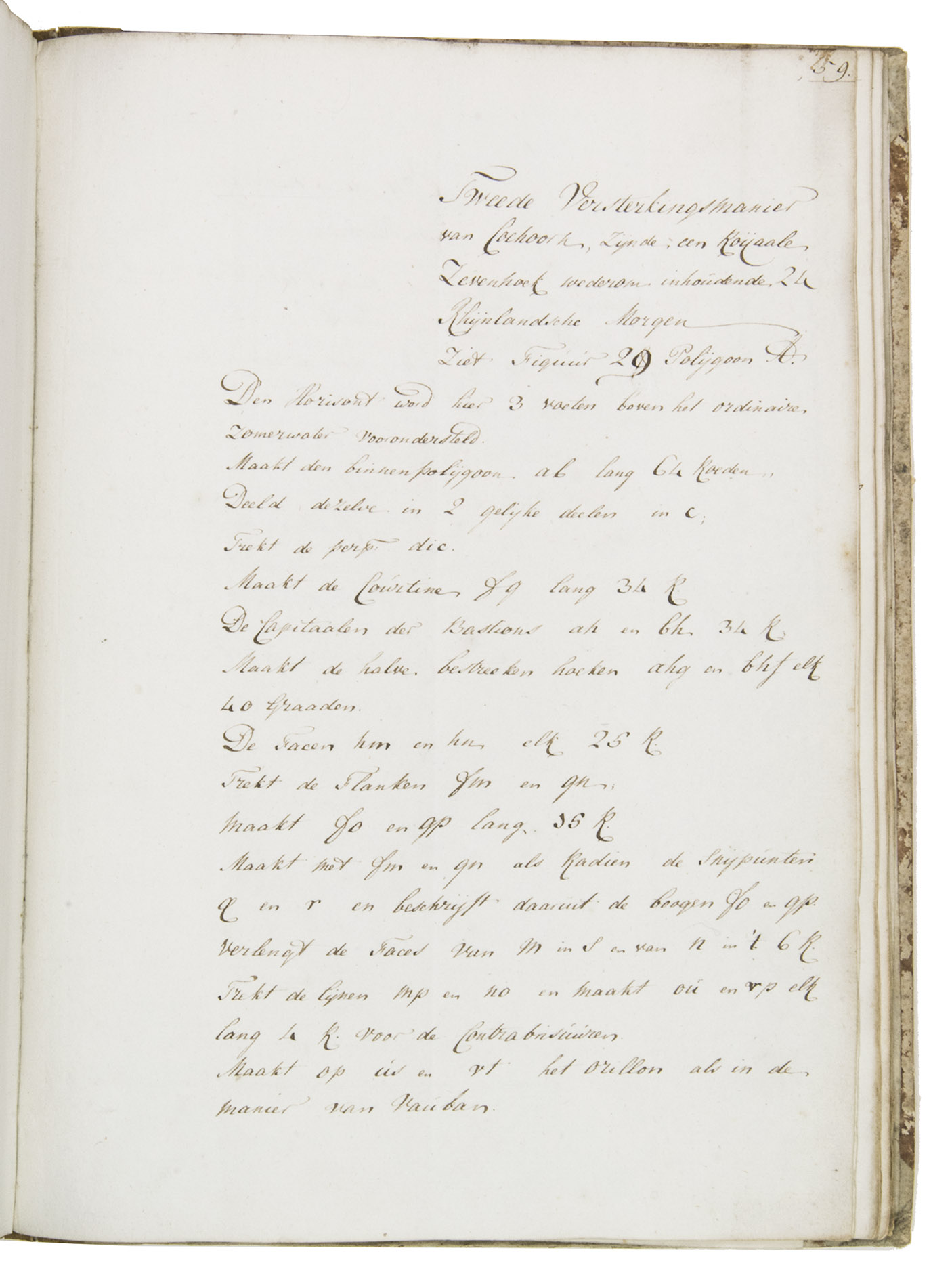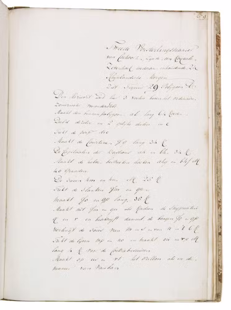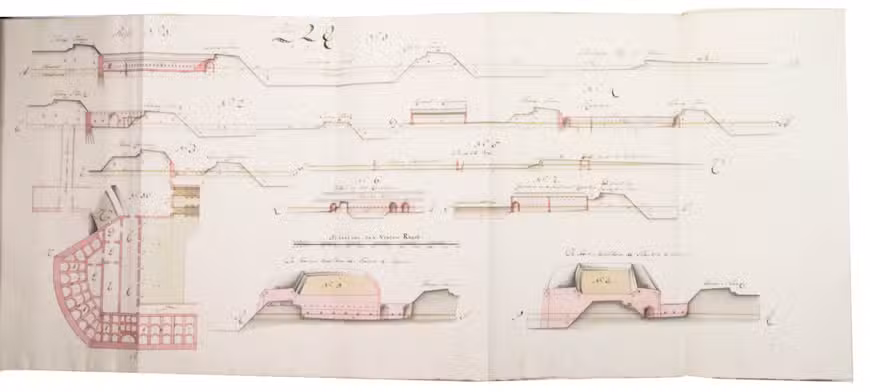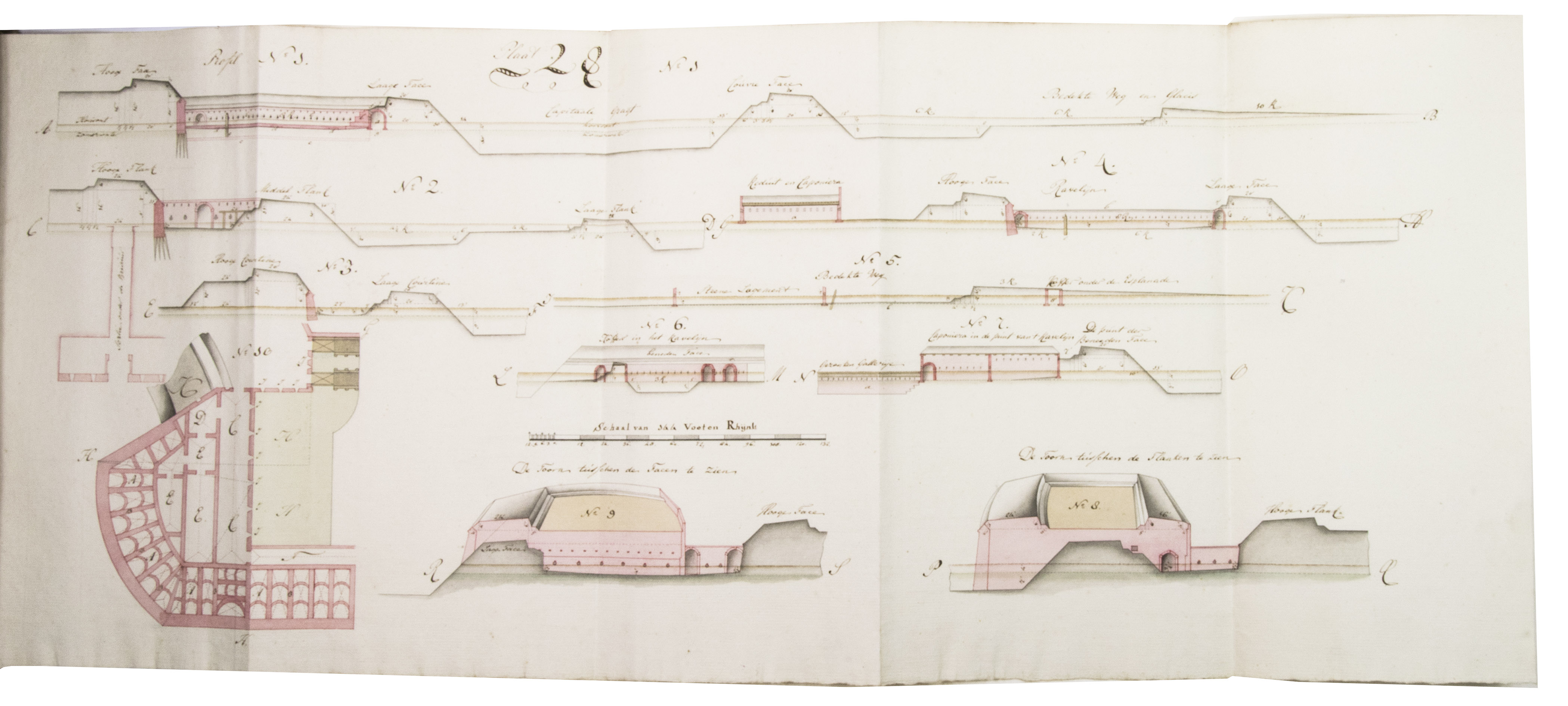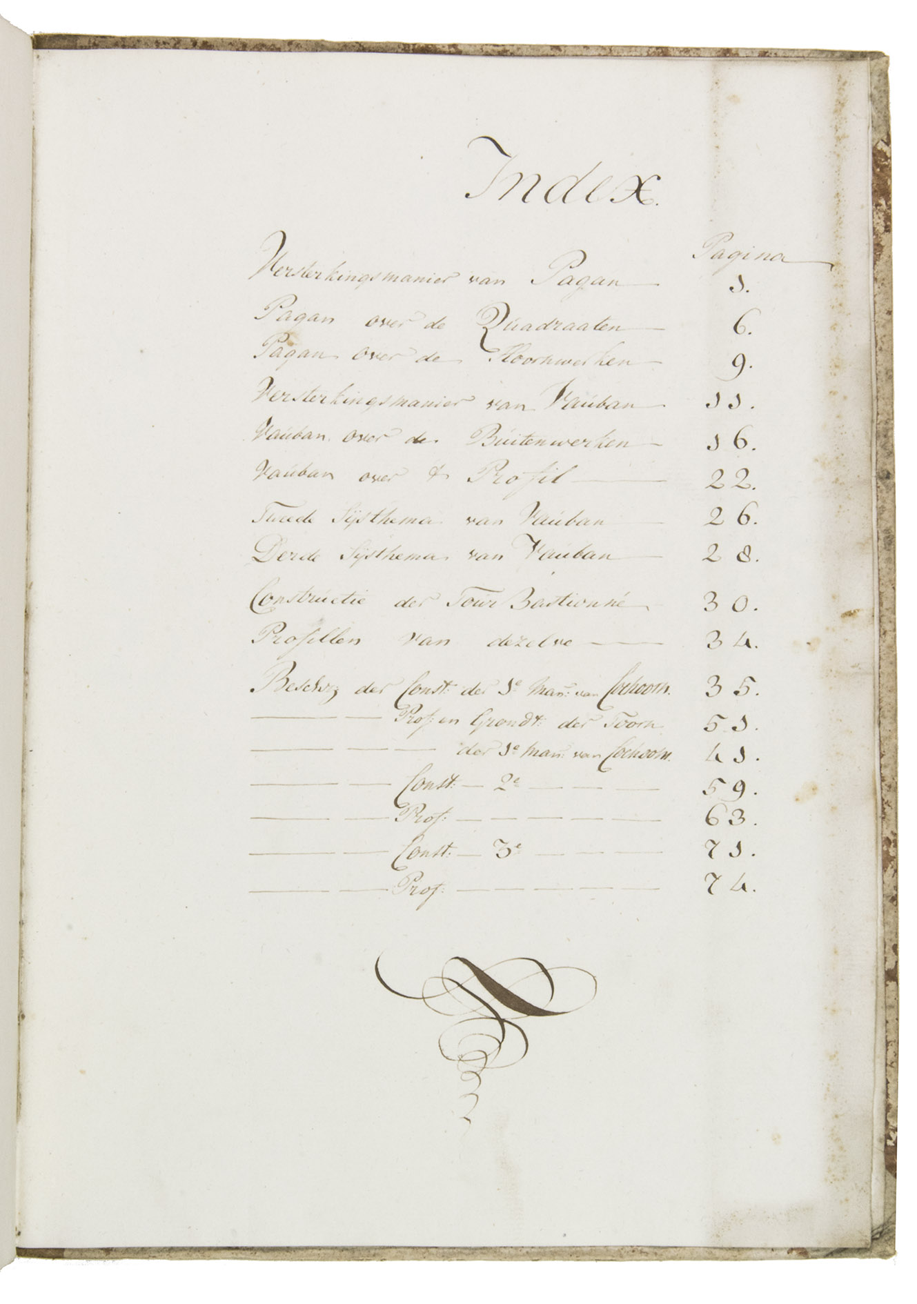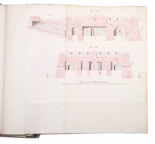 [The Hague], 1796. Folio. With a calligraphic title-page and 19 folding drawings (mostly about 32.5 x 51 cm, 6 longer: 78 to 138 cm, the longest assembled from 2 pieces before drawing) with 45 numbered figures, showing fortification plans and sections in black and red ink with coloured washes. With an 1857(?) photograph of a (ca. 1795?) miniature oval portrait of the author and 4 documents concerning the manuscript and the author's family (1933-1965), all loosely inserted. Contemporary half, tanned sheepskin, gold-tooled spine. [1], [1 blank], 81, [1 blank], [1], [3 blank] pp. plus 19 integral blank ll. with drawings tipped onto them.