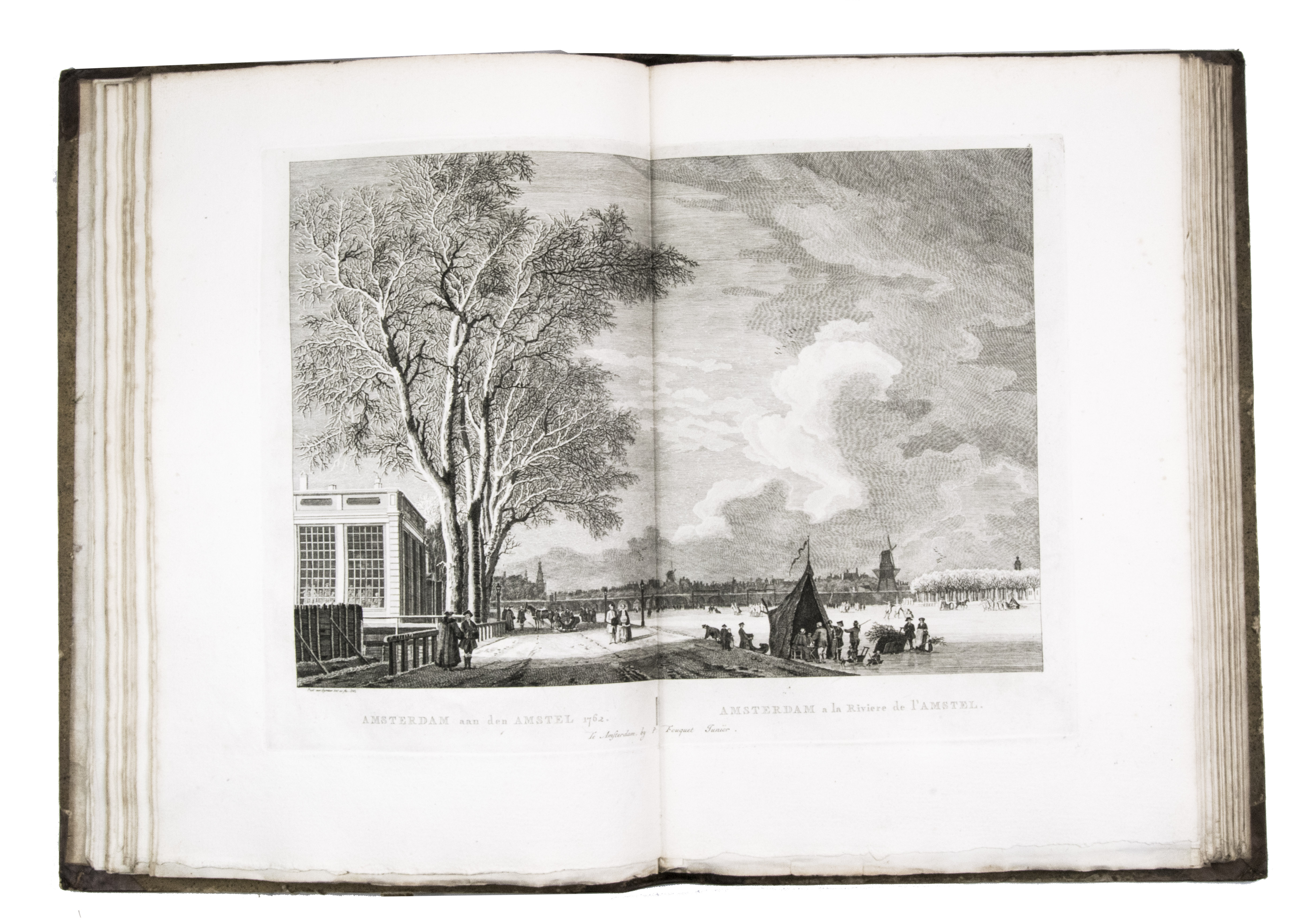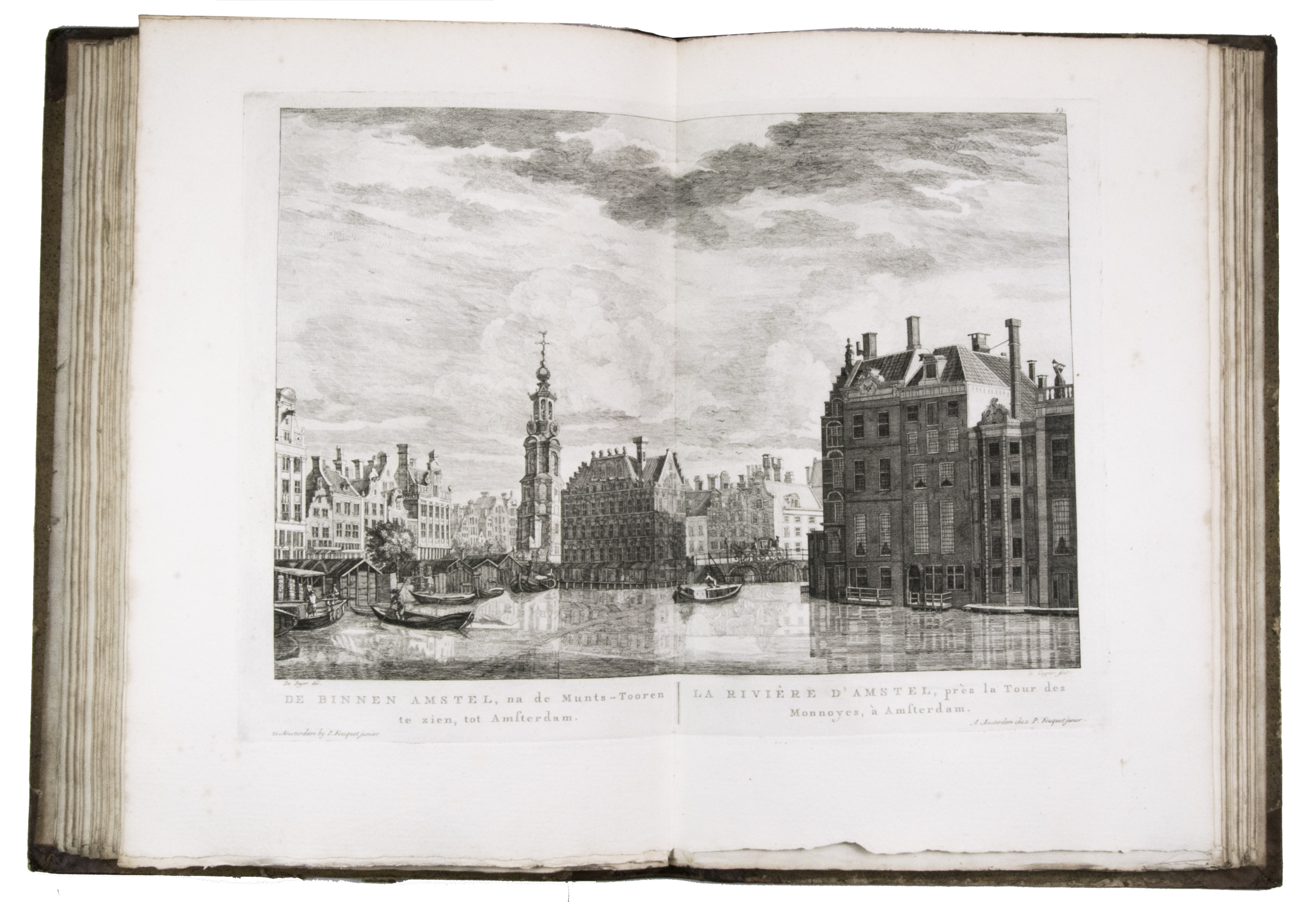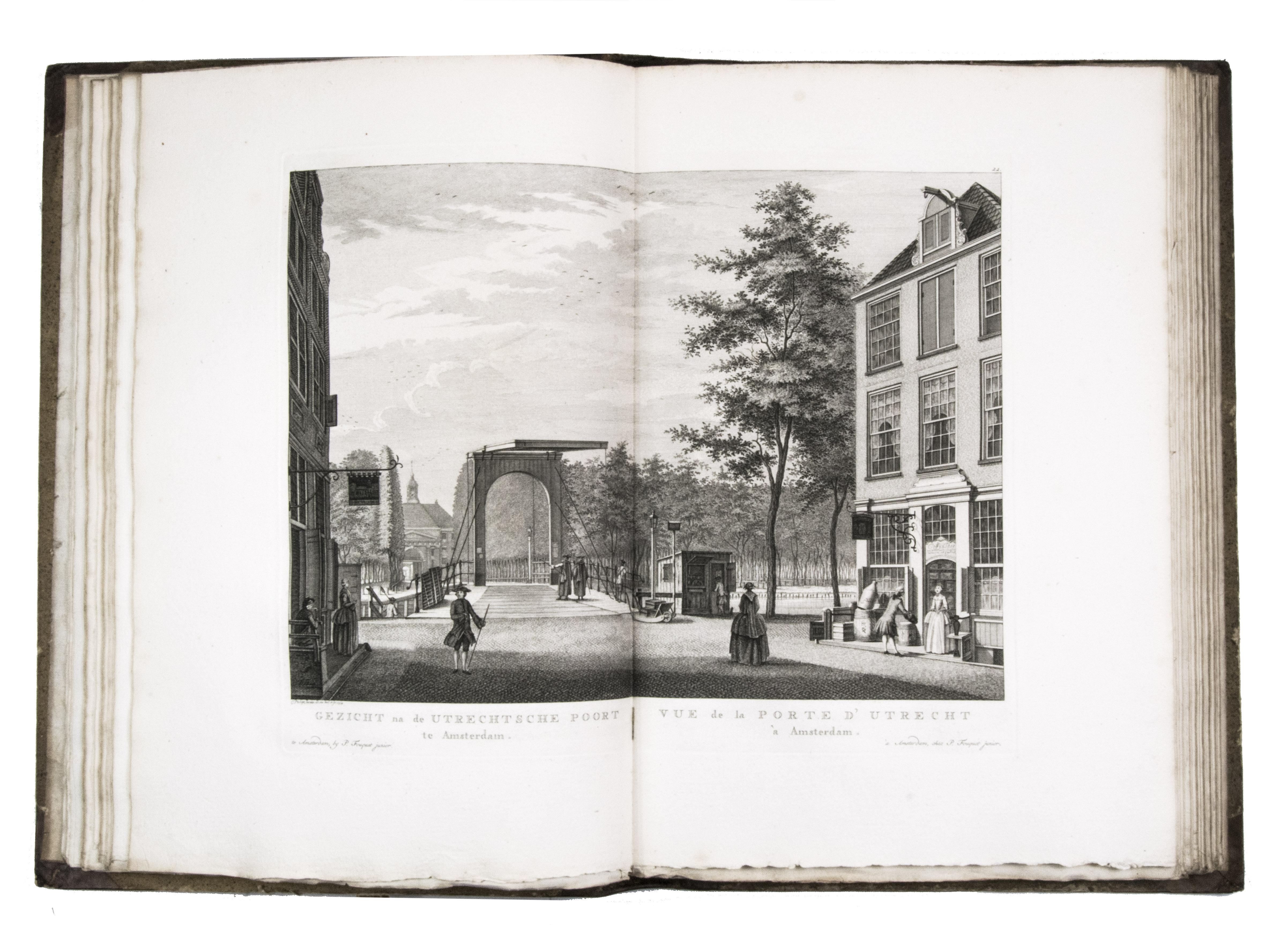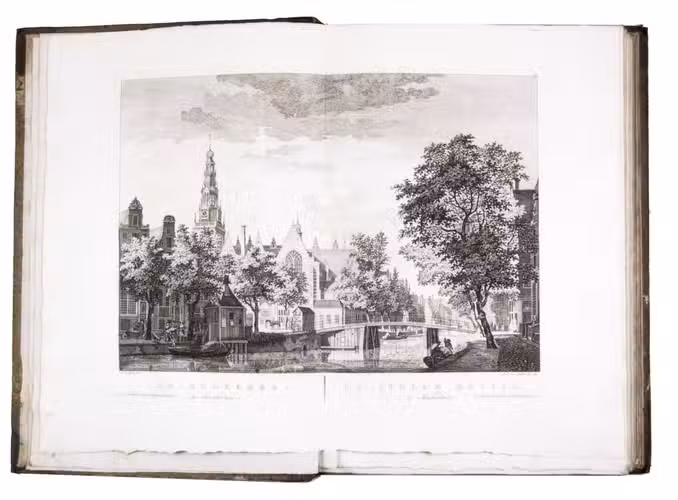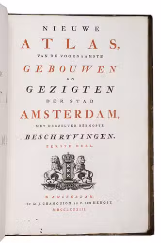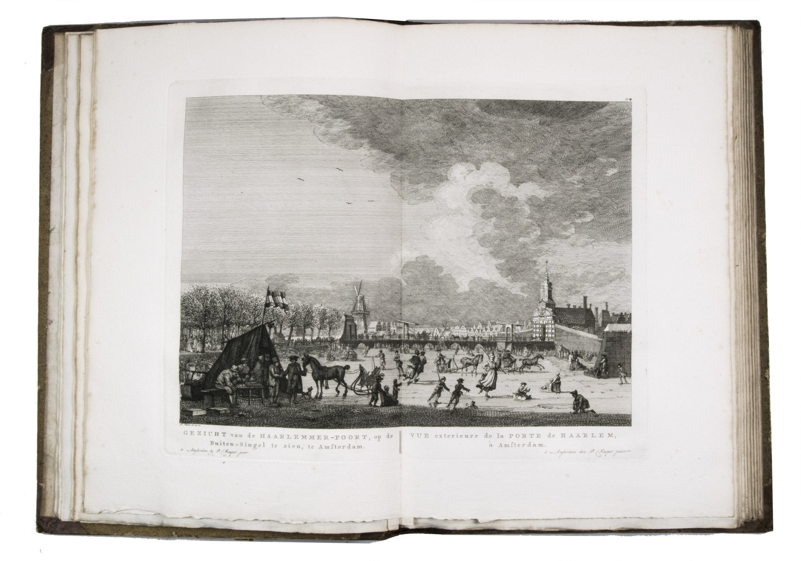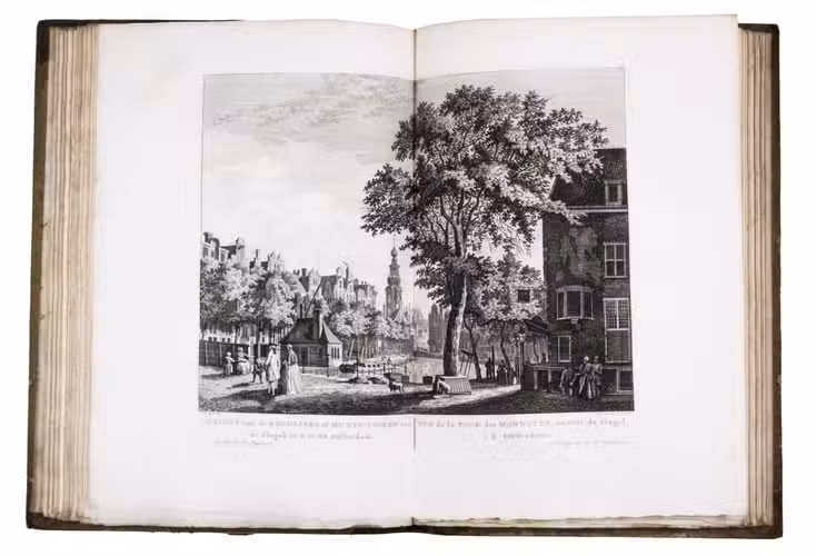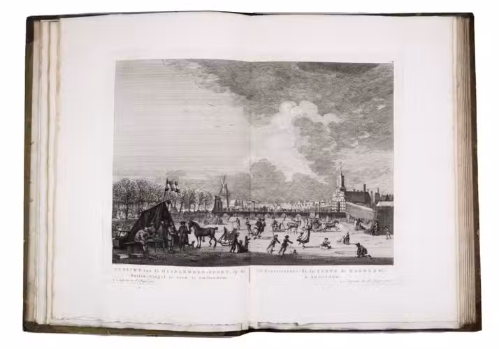 Rare complete first edition with 102 beautiful engraved views of Amsterdam by the artist and art dealer Pierre Fouquet Jr. (1729-1800). The work has been bound in two volumes, as usual, with two newly added unnumbered plates and the descriptions on 27 respectively 36 leaves based on the text of Wagenaar's Geschiedenis van Amsterdam, with interesting additions concerning the years 1765-1783. Originally the plates were published separately, with the first series of 10 townscapes issued in 1760-61 engraved by Paul van Liender and Simon Fokke after drawings by the well-known engraver of town- and landscapes Jan de Beyer (plates nr. 4, 10, 12, 15, 45, 50, 61, 72, 52-3), followed in 1764-68 by a series of 12 townscapes by Caspar Philips Jacobsz. (plates nr. 20, 22, 17-9, 21, 9, 23-4, 8, 73, 75), who also engraved the plates after J. de Vlaaming in 1768-69 (plates 27,14). The latest dated plate is from 1771 by C. Philips Jacobsz. (plate 25). Seventy-three of the plates are undated, 59 of which are by H. Schoute who never dated his engravings and seldom signed them. Other artists who contributed to the Atlas are C. Bogerts (after H. (not N.) Keun; plate 4*), J. van der Schley after P.R. van Dijk (plate 69-70), and Coppier and Simon Fokke after six more drawings by Jan de Beyer.