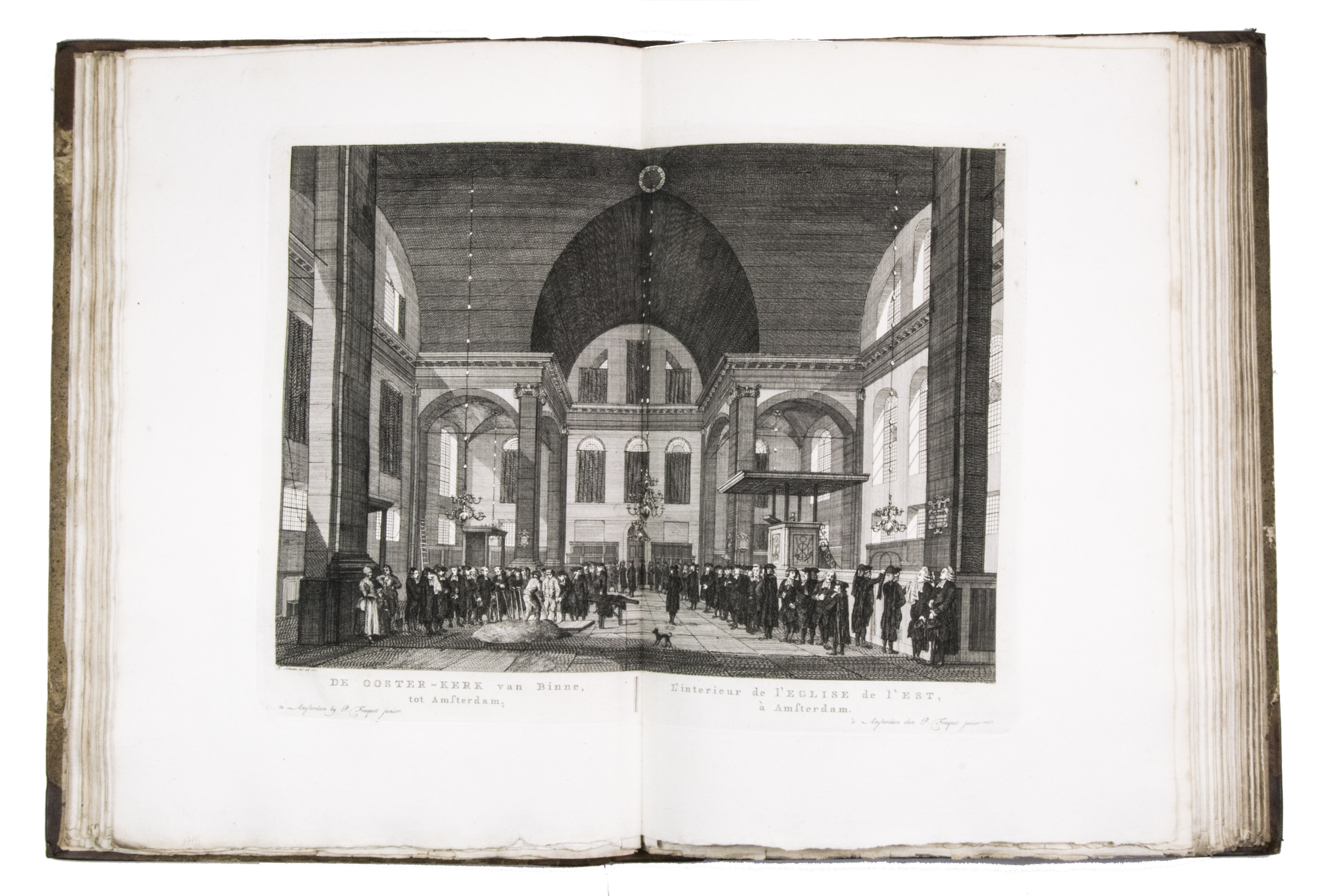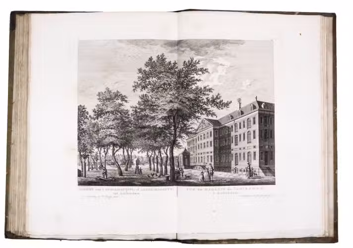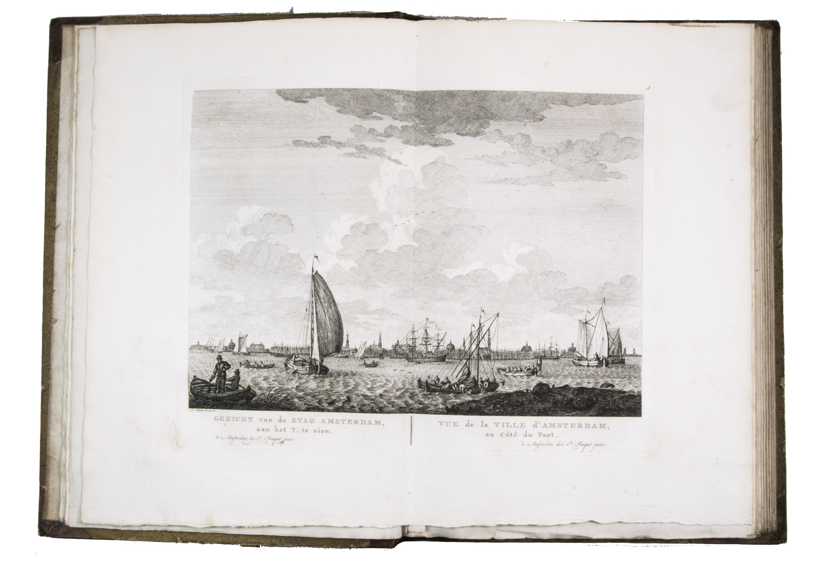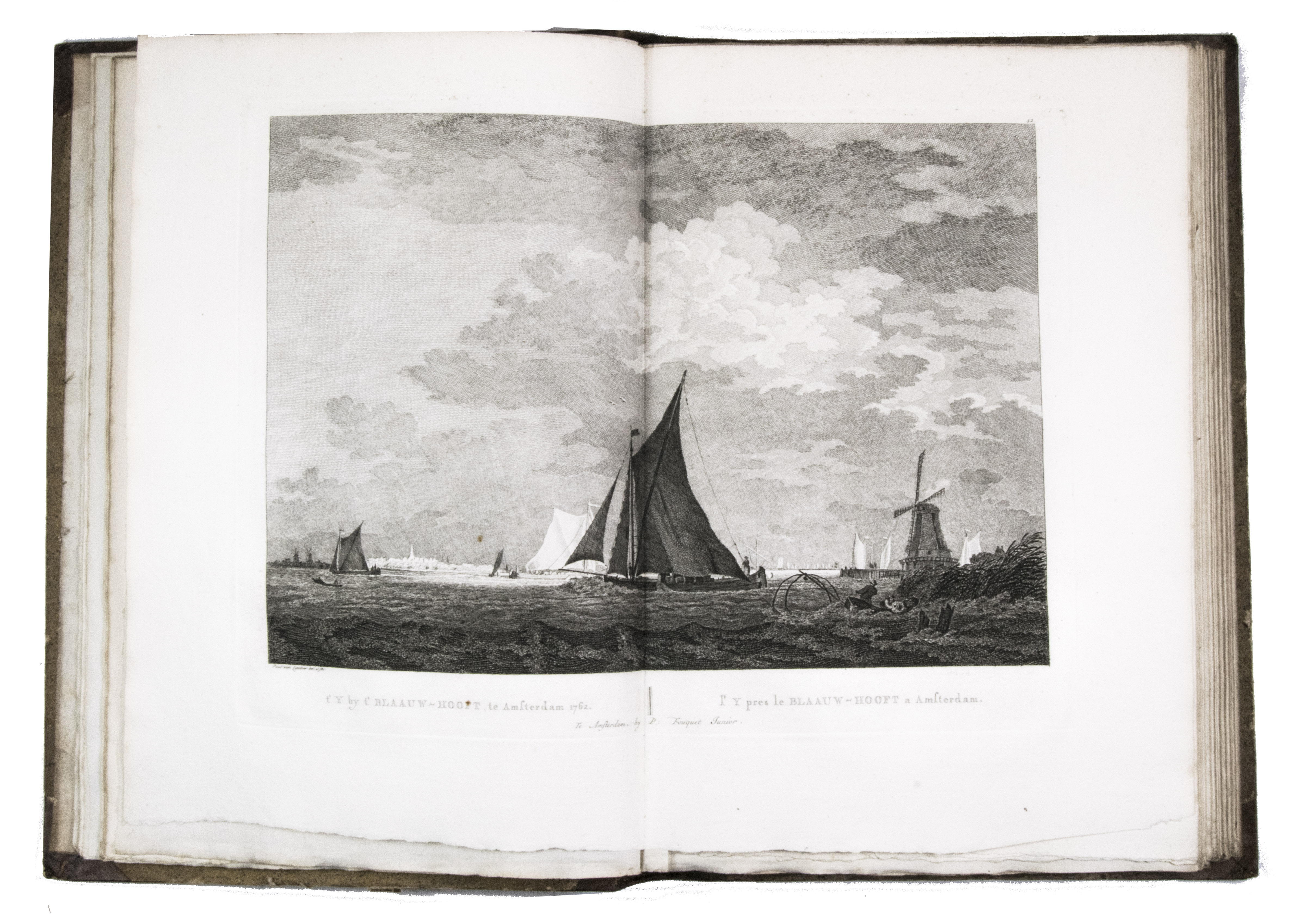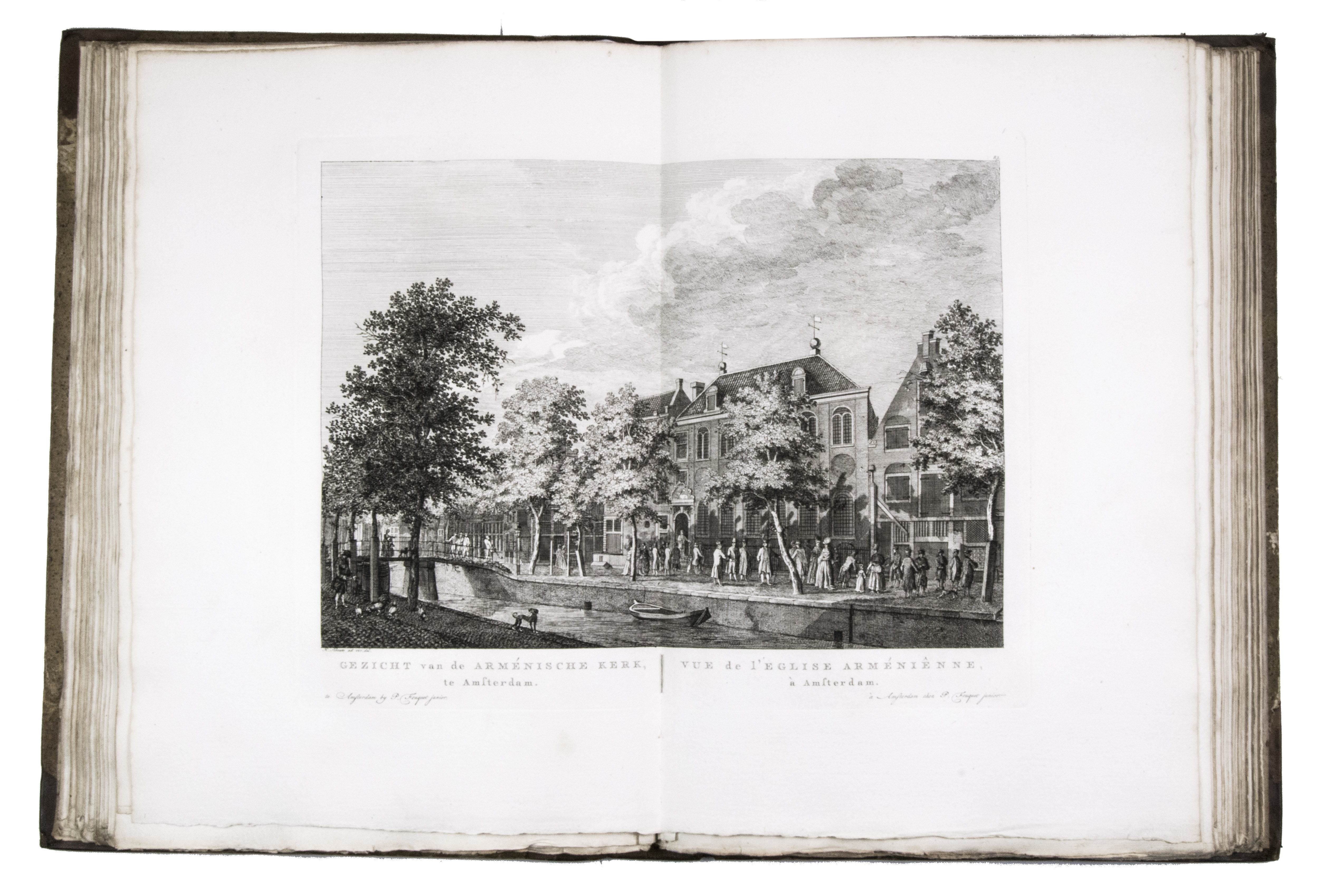 Rare complete first edition with 102 beautiful engraved views of Amsterdam by the artist and art dealer Pierre Fouquet Jr. (1729-1800). The work has been bound in two volumes, as usual, with two newly added unnumbered plates and the descriptions on 27 respectively 36 leaves based on the text of Wagenaar's Geschiedenis van Amsterdam, with interesting additions concerning the years 1765-1783. Originally the plates were published separately, with the first series of 10 townscapes issued in 1760-61 engraved by Paul van Liender and Simon Fokke after drawings by the well-known engraver of town- and landscapes Jan de Beyer (plates nr. 4, 10, 12, 15, 45, 50, 61, 72, 52-3), followed in 1764-68 by a series of 12 townscapes by Caspar Philips Jacobsz. (plates nr. 20, 22, 17-9, 21, 9, 23-4, 8, 73, 75), who also engraved the plates after J. de Vlaaming in 1768-69 (plates 27,14). The latest dated plate is from 1771 by C. Philips Jacobsz. (plate 25). Seventy-three of the plates are undated, 59 of which are by H. Schoute who never dated his engravings and seldom signed them. Other artists who contributed to the Atlas are C. Bogerts (after H. (not N.) Keun; plate 4*), J. van der Schley after P.R. van Dijk (plate 69-70), and Coppier and Simon Fokke after six more drawings by Jan de Beyer.