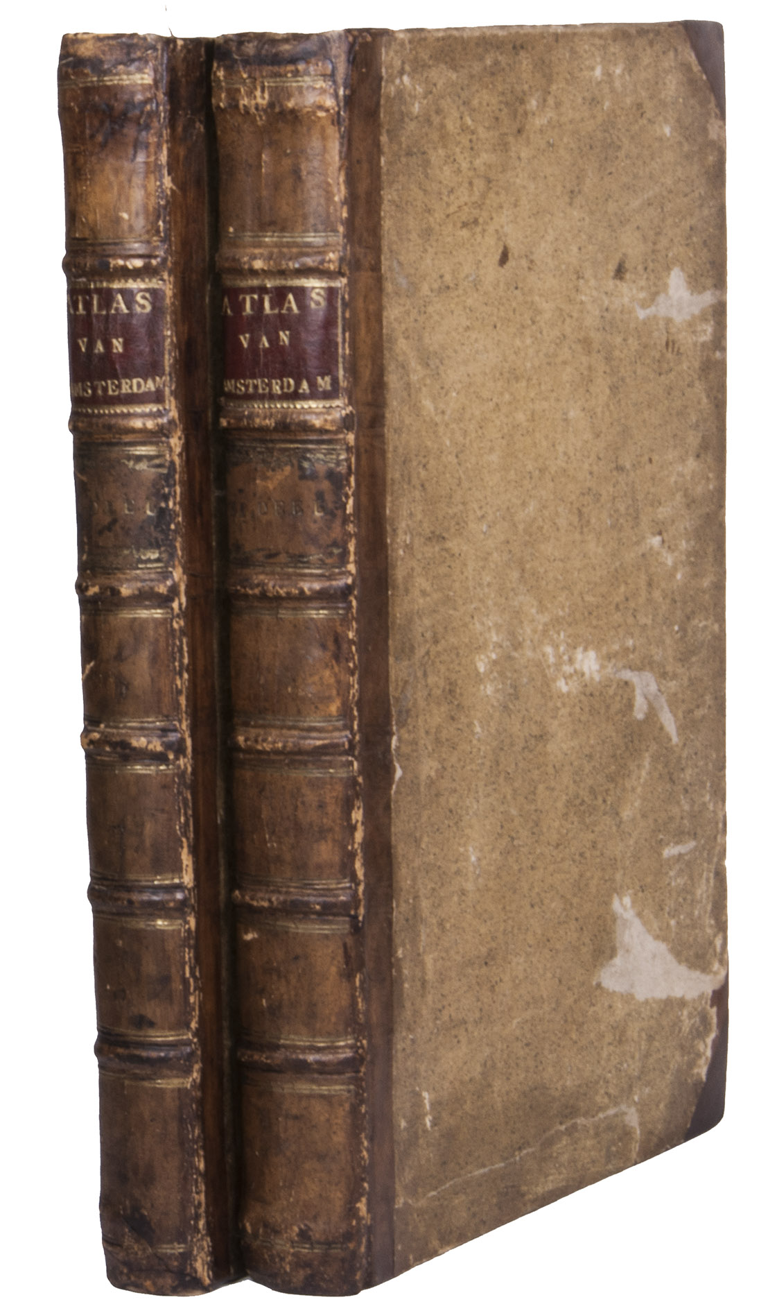 The edges and corners of the boards are scuffed, the boards and spine have been rubbed, with some loss of material. The foot edge of the leaves is uncut, some of the plates are somewhat foxed, but the work is otherwise internally very clean, with the plates in beautiful fresh impressions. Nijhoff & V. Hattum 11; ''Met Fouquet door Amsterdam", in: Nieuwe Atlas van Fouquet; STCN 167743317 (8 copies).
