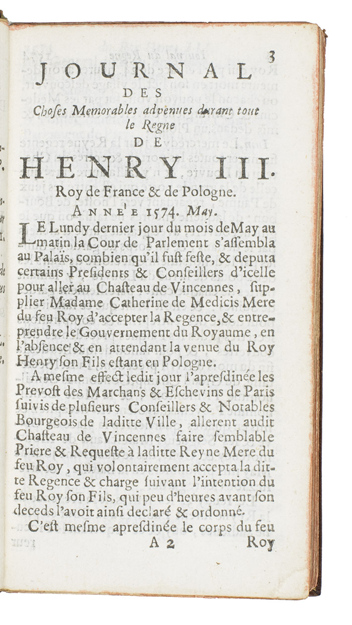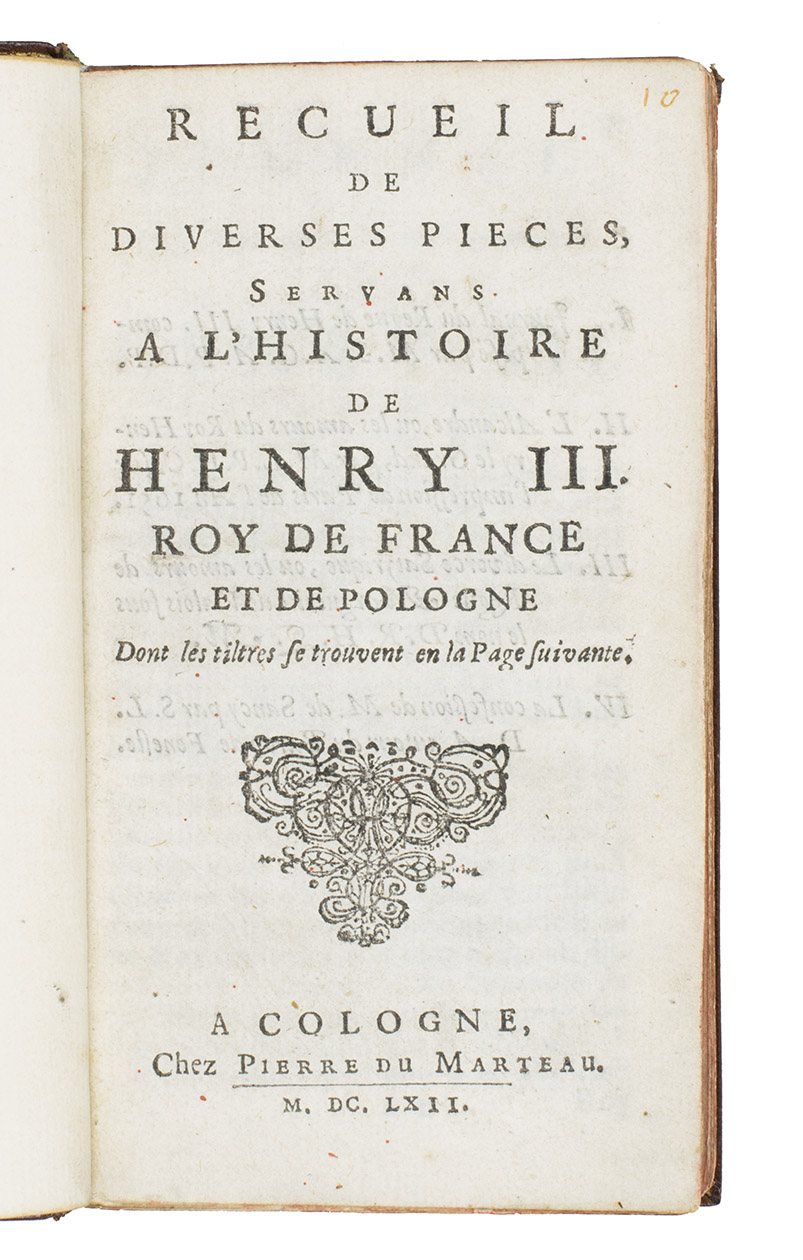 One of the earliest (fourth?) and rarest editions, with a false imprint (but probably the second edition by the original publisher), of an infamous collection of memoires or reputed memoires from the reign of King Henri III of France, and an uncommonly ferocious satire of the manners and mores of the court and especially of Henri III and his mother Catherine de Medici, including rather sordid details.