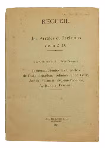 Recueil des Arrêtés et Décisions de la Z. O. (24 Octobre 1918 - 31 Août 1920). Interessant toutes les branches de lAdministration: Administration Civils, Justice, Finances, Hygiène Publique, Agriculture, Douanes.