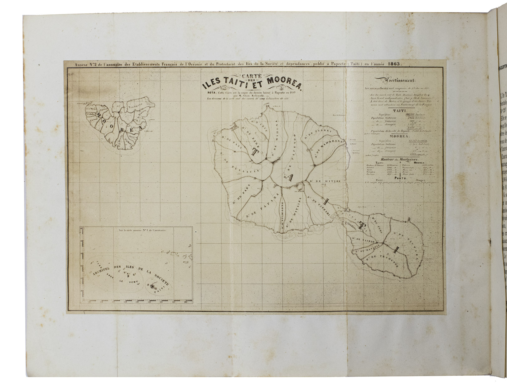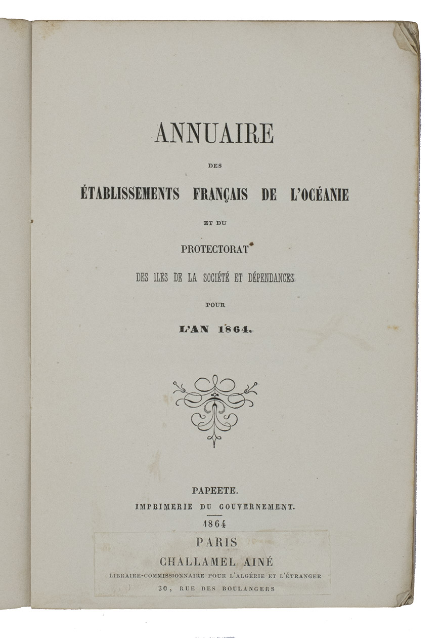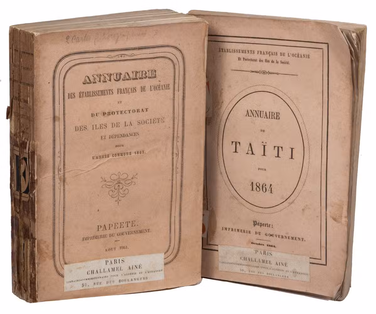 With: (2) [IDEM]. Annuaire des établissements français de l'Océanie et du Protectorat des Iles de la Société et dépendances pour l'an 1864 (title on the front wrapper: Annuaire de Taïti pour 1864).Papeete, Imprimerie du Gouvernement, October 1864. 2 volumes. Small 8vo. With two original photographs in the 1863 edition, both reproducing maps, one showing the islands Tahiti and Moorea and the other showing archipels which were then under French protectorate. Original publisher's printed wrappers. VIII, 372; [4], LX, 126, [2 blank] pp.
