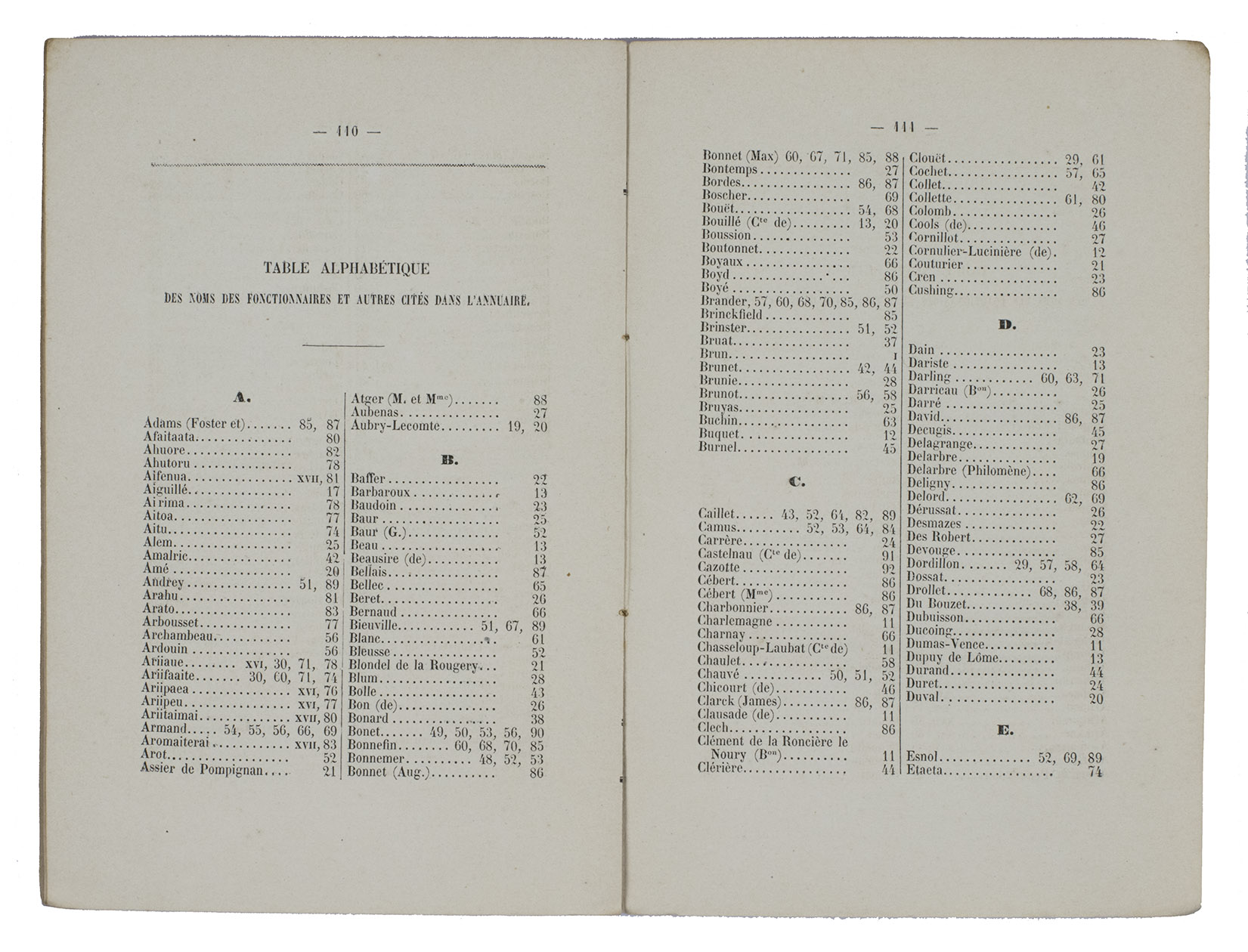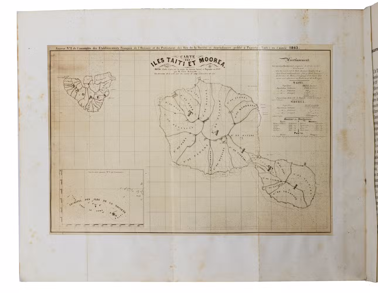 Two very rare issues of an administrative annual periodical (in the form of an almanac) on Tahiti, Moorea and other parts of French Polynesia, printed in Papeete (the capital of French Polynesia and Tahiti). In 1842 the French proclaimed the protectorate over the islands and atolls in the different archipelagos of French Polynesia, including Tahiti, which is the most populous island. Both issues contain a calendar, in addition to the many pages listing various members of the local and colonial government and judiciary. Both issues also contain demographic information about the population and trade, including lists showing who has a patent on what, tables on the import and export in the port of Papeete, but also tables showing the different rates for posting letters from Polynesia through the colonial mail service. Besides this administrative information, the yearbooks also contain geographical information on the Society Islands (both the Windward Islands (or Îles du Vent), including Tahiti and Moorea, and the Leeward Islands (or Îles Sous le Vent), among others Bora-Bora and Raiatea), the Marquesas Islands and the archipelago of Tuamotu, besides some small remarks on others places in Oceania.