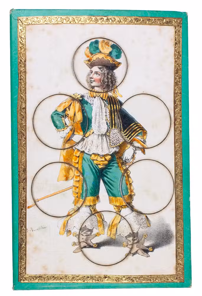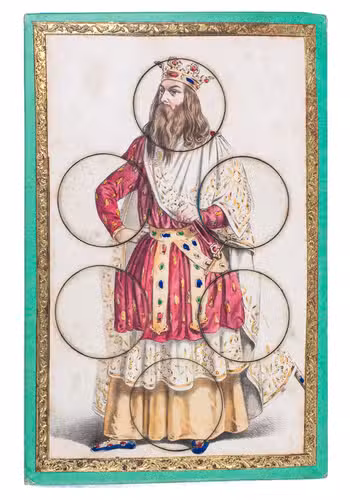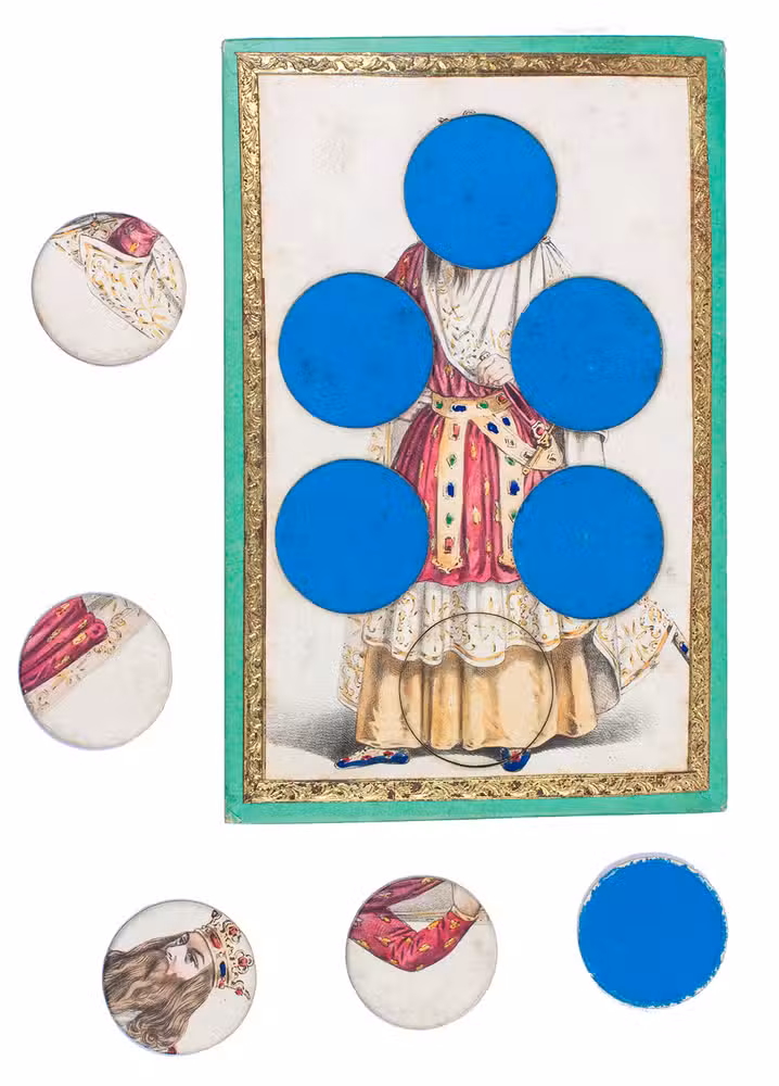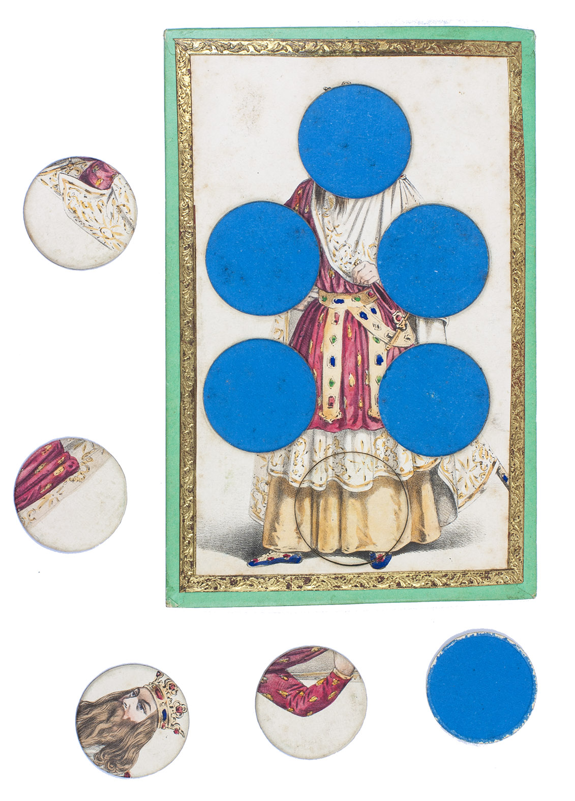 [Paris], R. Lacouchin, [ca. 1840]. 3 puzzles. 19.5 x 13 cm. With 3 finely lithographed plates mounted on 3 thick green paperboard cards. The lithographs are framed with a gold-coloured ornamental border. The images on the cards are all beautifully hand coloured and the 3 cards depict respectively a crowned king in ornate robes, a beautiful young lady in a green dress, and a young man (or possibly a court jester?) in an extravagant yellow and green outfit. Each card has 6 large circular movable pieces to be removed or inserted as the game demands in various circumstances.