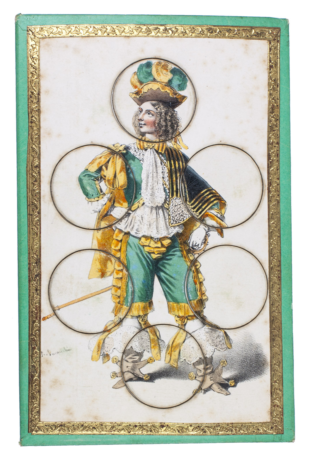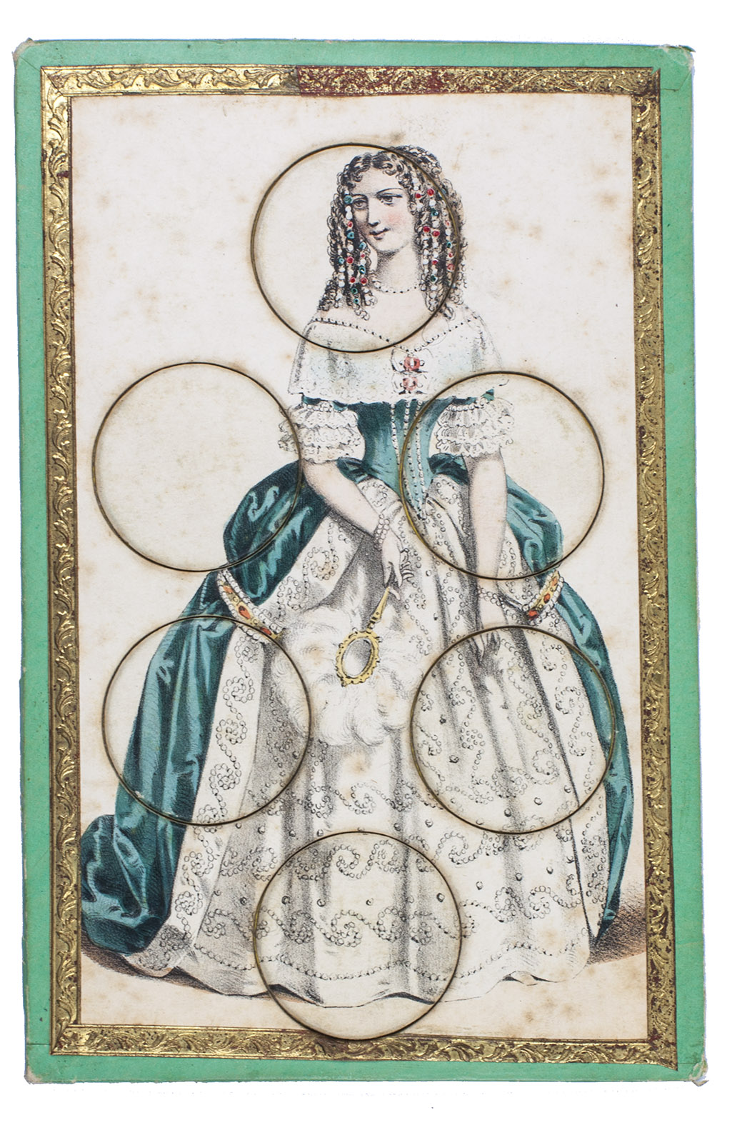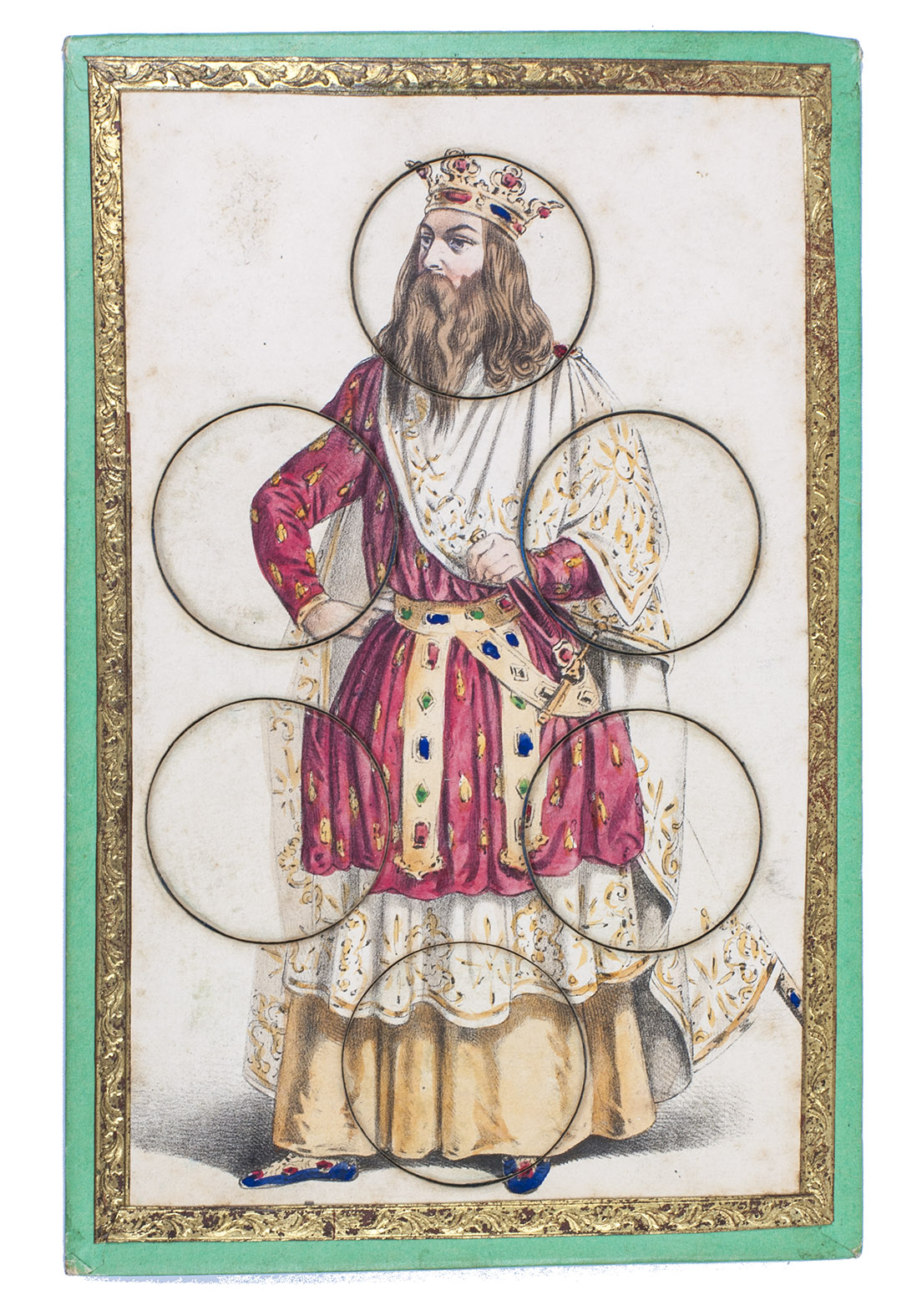 [Paris], R. Lacouchin, [ca. 1840]. 3 puzzles. 19.5 x 13 cm. With 3 finely lithographed plates mounted on 3 thick green paperboard cards. The lithographs are framed with a gold-coloured ornamental border. The images on the cards are all beautifully hand coloured and the 3 cards depict respectively a crowned king in ornate robes, a beautiful young lady in a green dress, and a young man (or possibly a court jester?) in an extravagant yellow and green outfit. Each card has 6 large circular movable pieces to be removed or inserted as the game demands in various circumstances.