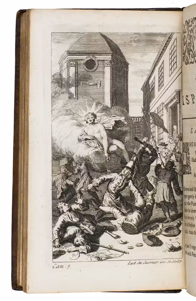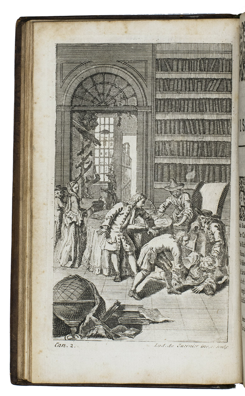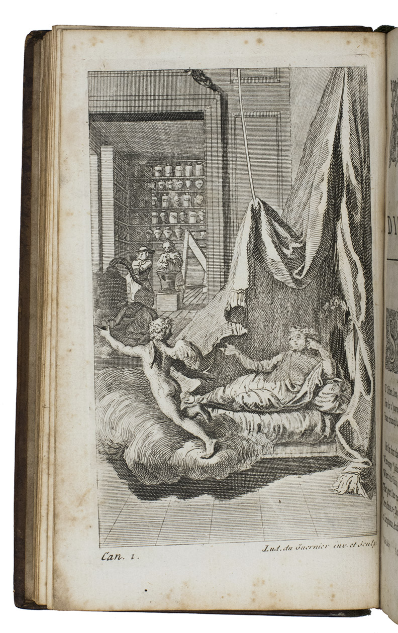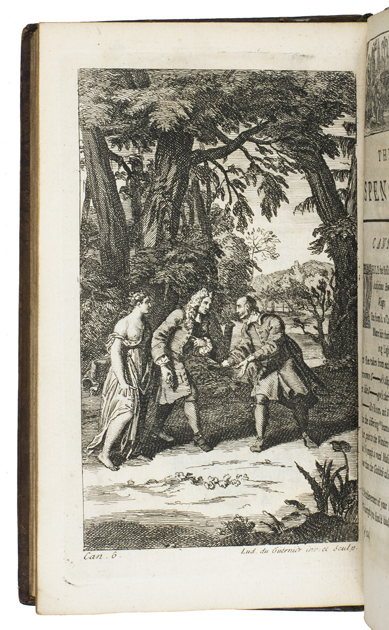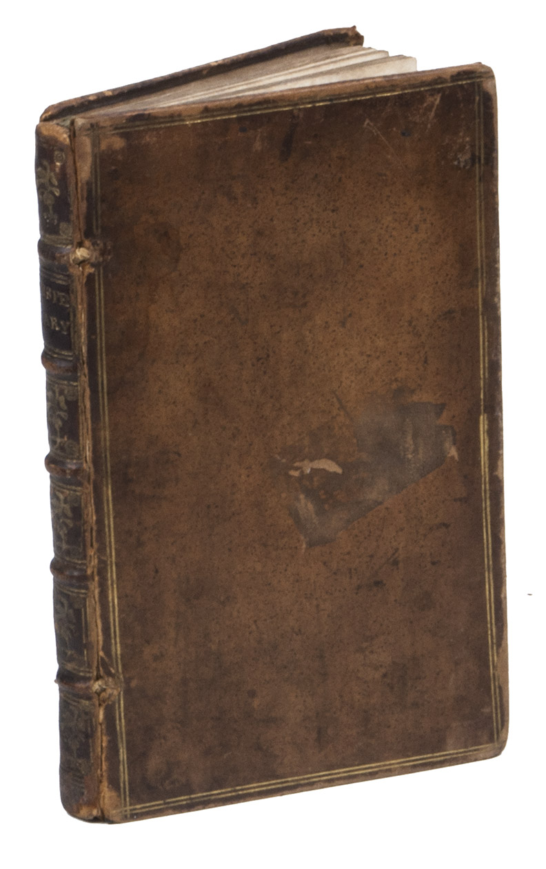 London, printed for J.T. and sold by Tho. Astley, 1726. 12mo. With frontispiece and 6 full-page plates, one for each of the cantos engraved by Lud. Du Guernier (included in the collation), many woodcut head- and tailpieces. Calf over boards, gold-tooled spine. [24], 84, 36 pp.