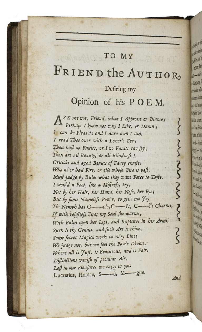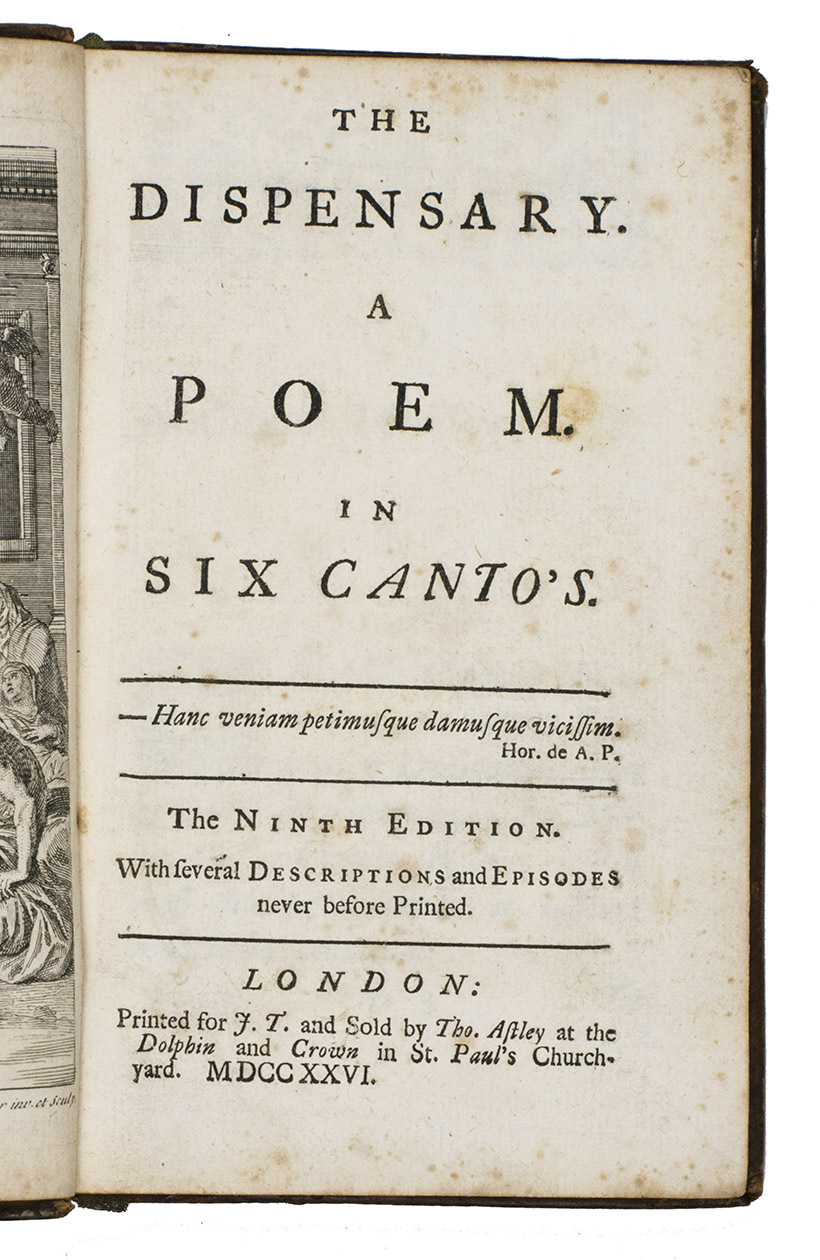 Ninth edition (the first after the dead of the author) of this satirical mock-heroic poem in six cantos which had been first published anonymously by Garth in 1699. Although the satire on the building of a medicines dispensary for the poor at Royal College of Physicians, has now been largely forgotten, at the time of its publication the poem was an instant success, making the writer the talk of the London coffee houses and the fashionable literary scene. The poem went through three editions within a year and eight editions appeared within Garths lifetime and the text was reprinted regularly throughout the 18th century.