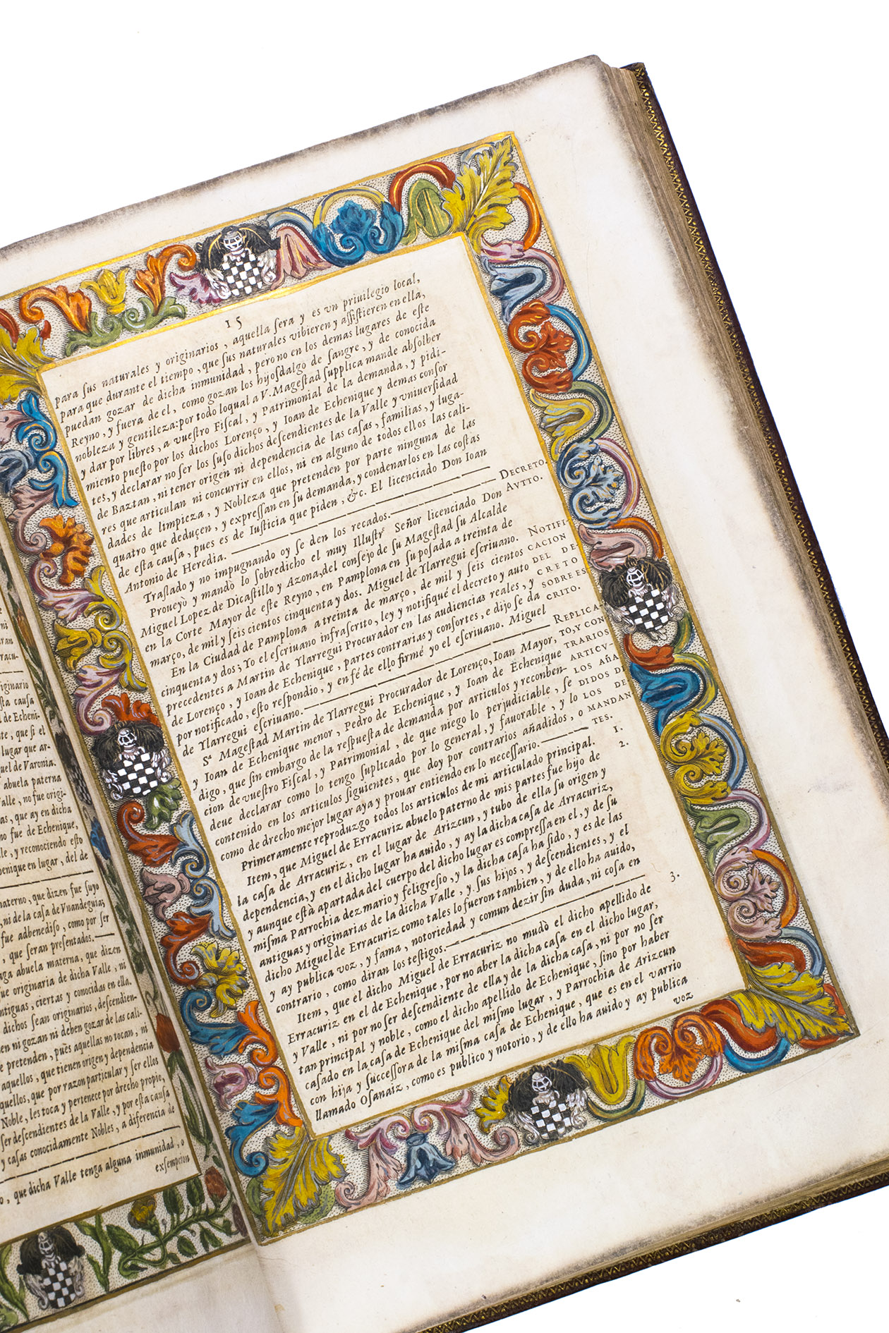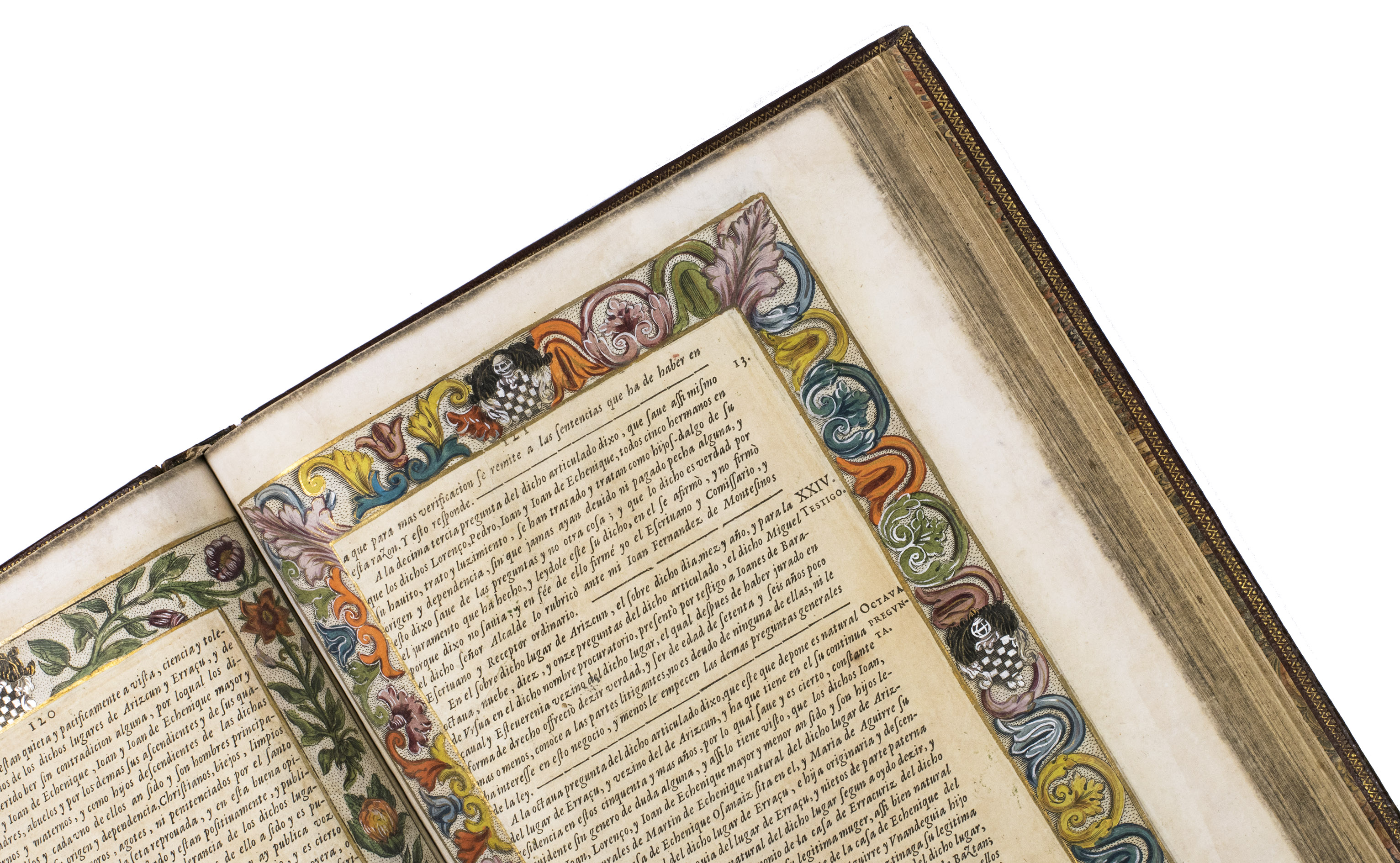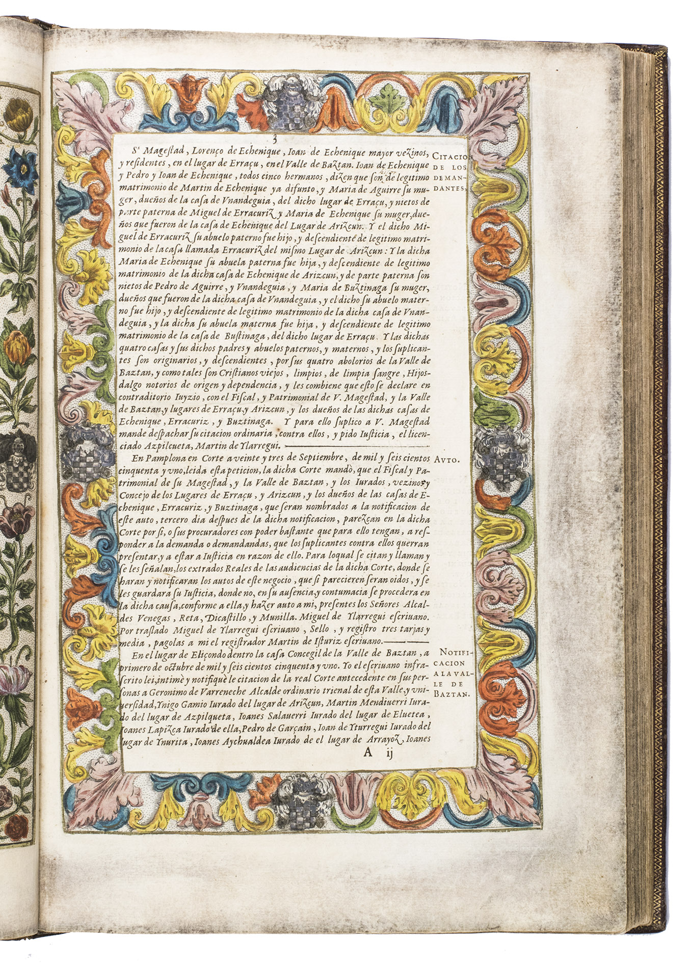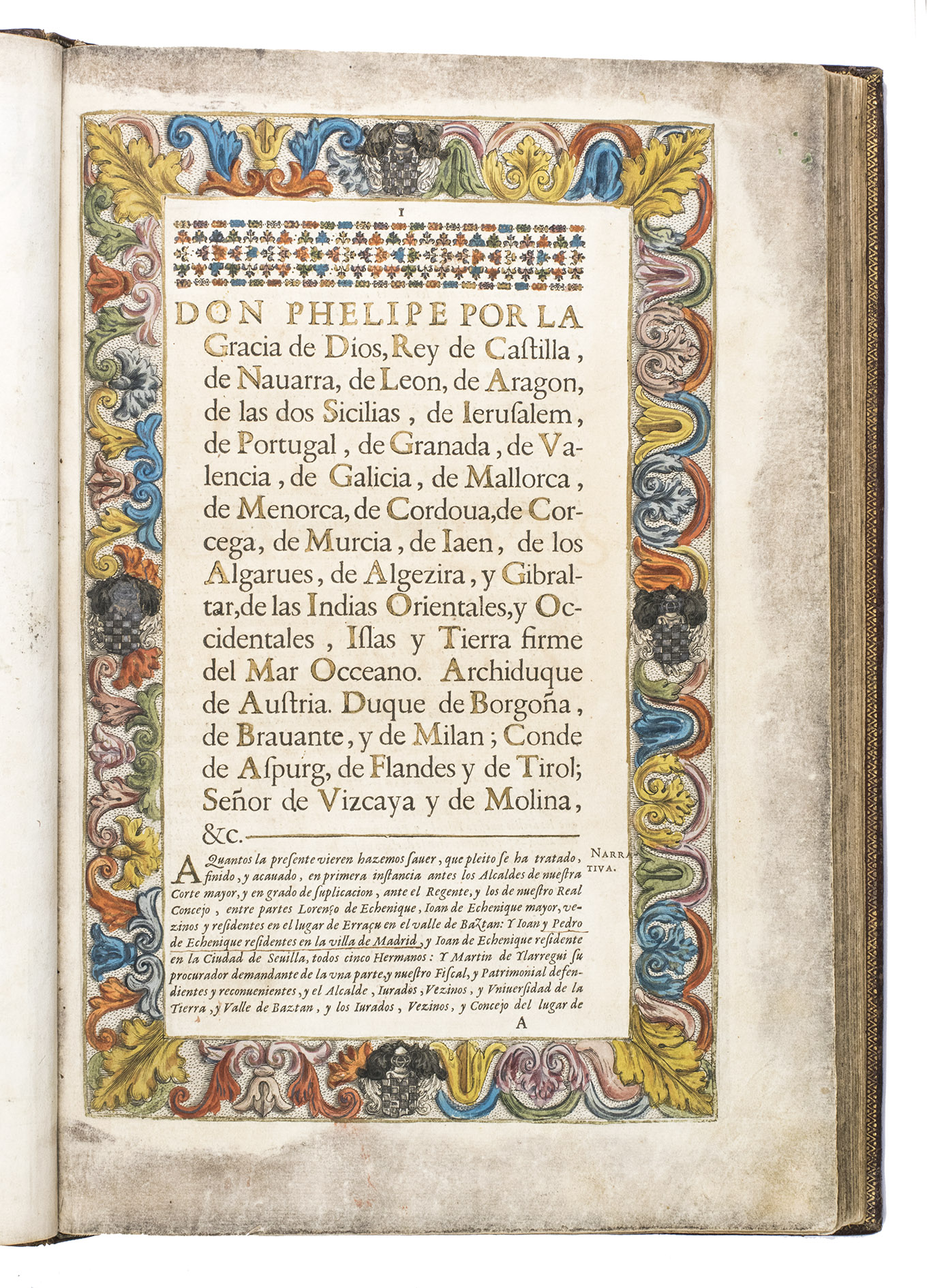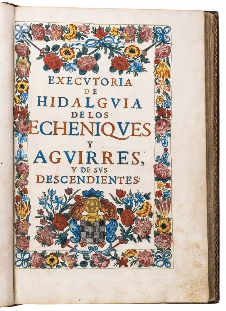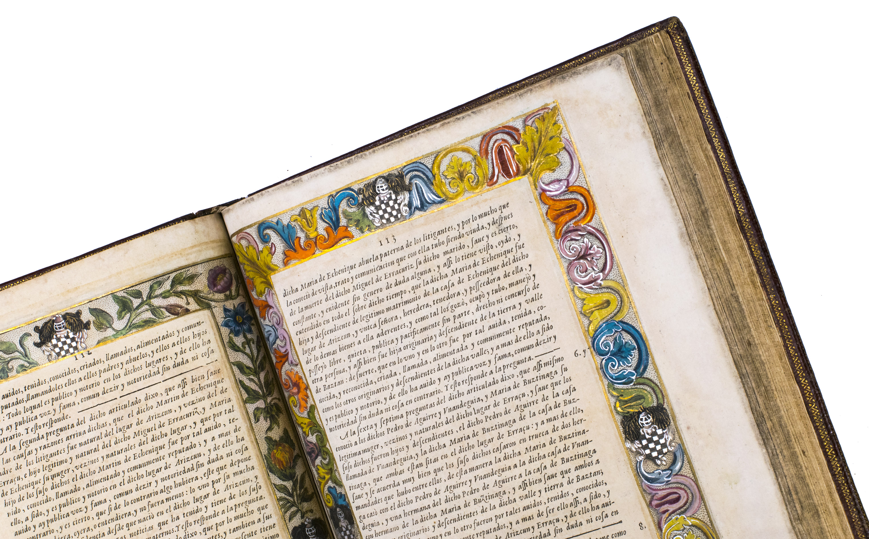 Rare ejecutorias de hidalguía of the Echeniques y Aguirres family. The work is beautifully bound in contemporary richly gold-tooled morocco and it is handsomely decorated throughout with contemporary hand-coloured borders, which are highlighted in gold and silver. Among the most impressive legal artefacts produced in early modern Spain are the ejecutorias de hidalguía, royal documents issued when a family had successfully proven its noble status before the highest courts of the kingdom. These richly ornamented works are far more than dry legal records: they preserve genealogies, heraldic descriptions, testimonies of "limpieza de sangre" (purity of blood), and the voices of neighbours and officials who vouched for a familys lineage. They were the final seal that converted a favourable verdict into a binding, hereditary right. The present work is dated 24 July 1664 and comprising 233 pages. It opens with a hand-painted title page bearing the family arms, and every leaf is bordered with coloured decoration.