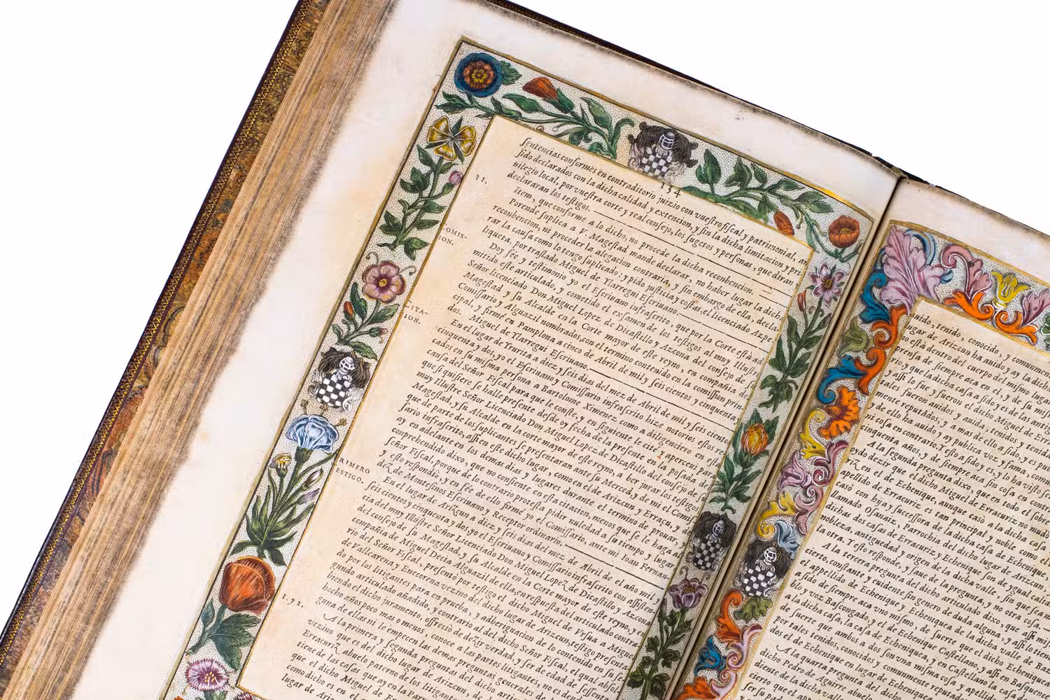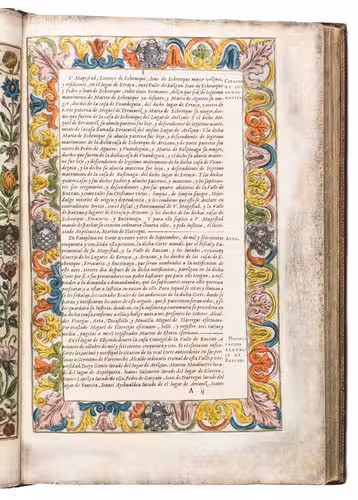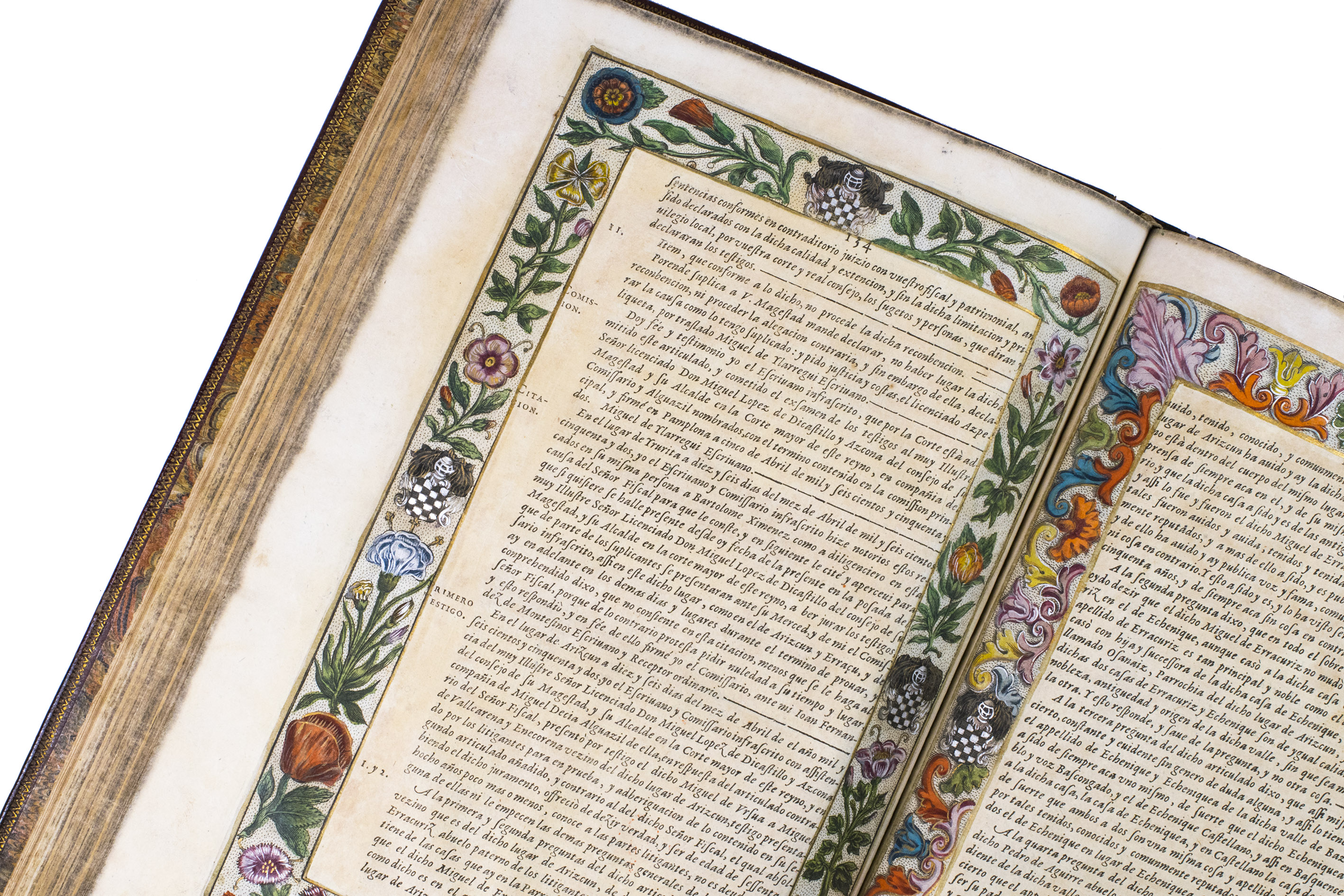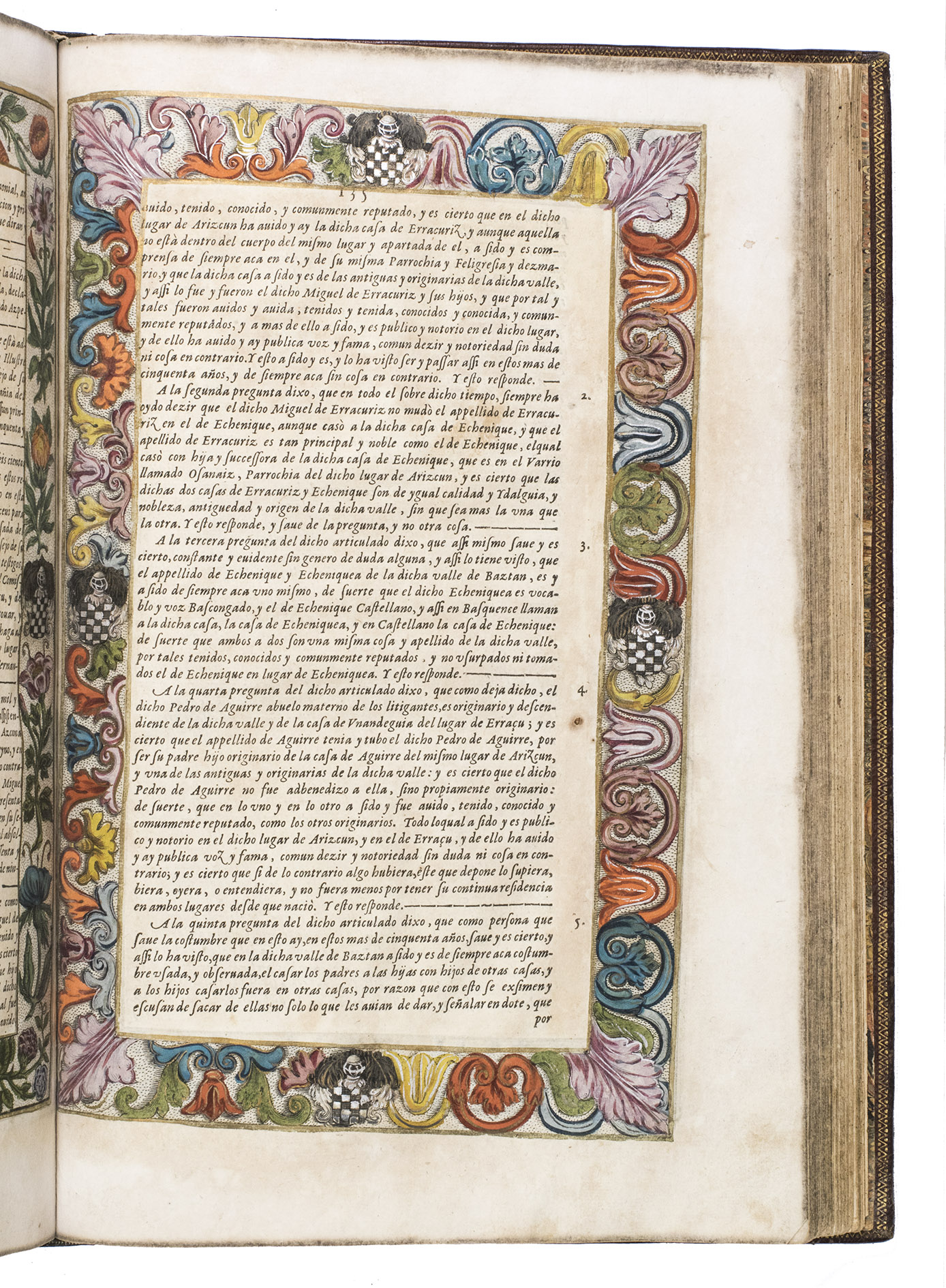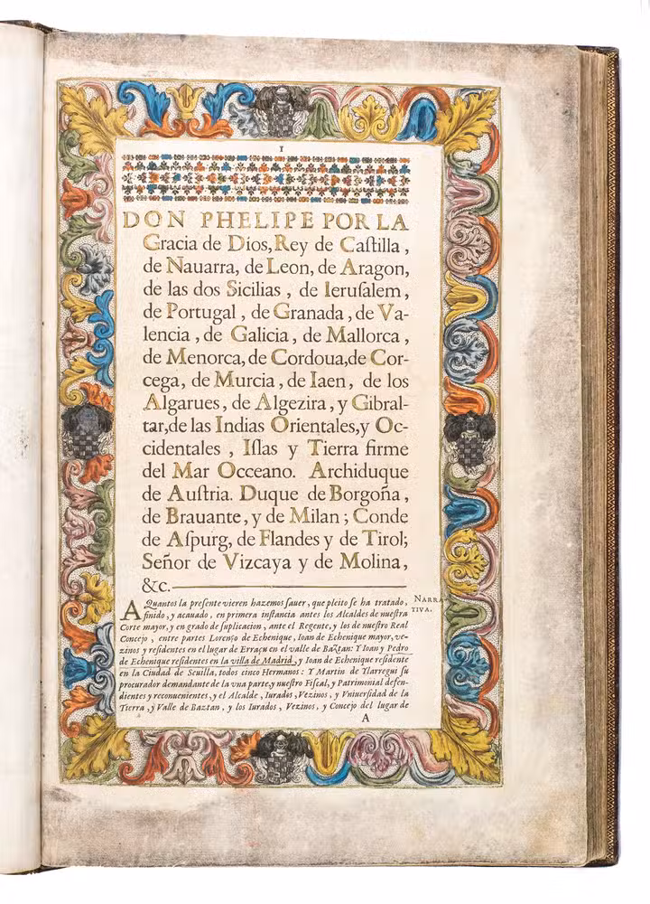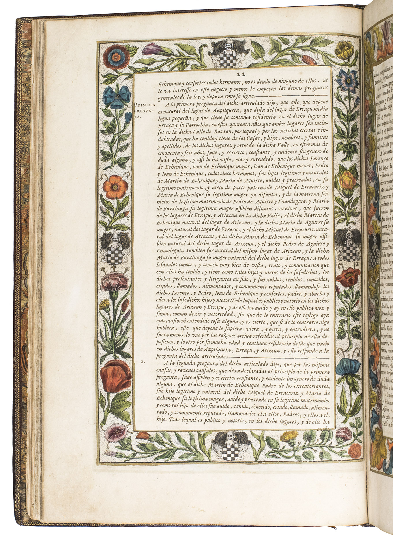 Rare ejecutorias de hidalguía of the Echeniques y Aguirres family. The work is beautifully bound in contemporary richly gold-tooled morocco and it is handsomely decorated throughout with contemporary hand-coloured borders, which are highlighted in gold and silver. Among the most impressive legal artefacts produced in early modern Spain are the ejecutorias de hidalguía, royal documents issued when a family had successfully proven its noble status before the highest courts of the kingdom. These richly ornamented works are far more than dry legal records: they preserve genealogies, heraldic descriptions, testimonies of "limpieza de sangre" (purity of blood), and the voices of neighbours and officials who vouched for a familys lineage. They were the final seal that converted a favourable verdict into a binding, hereditary right. The present work is dated 24 July 1664 and comprising 233 pages. It opens with a hand-painted title page bearing the family arms, and every leaf is bordered with coloured decoration.
