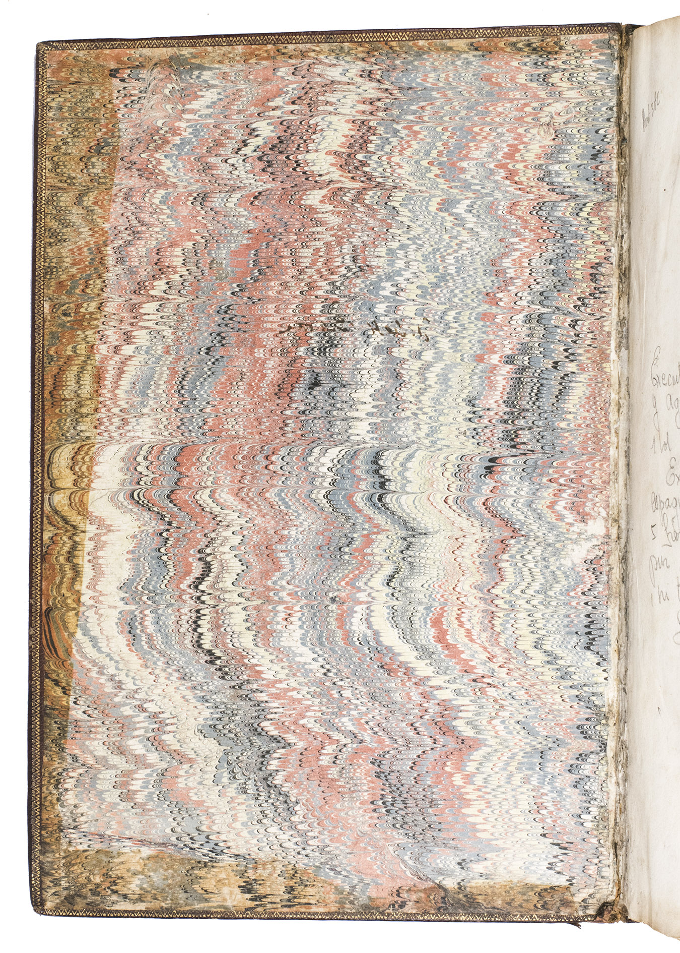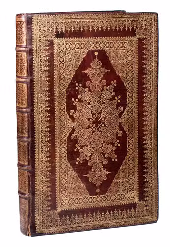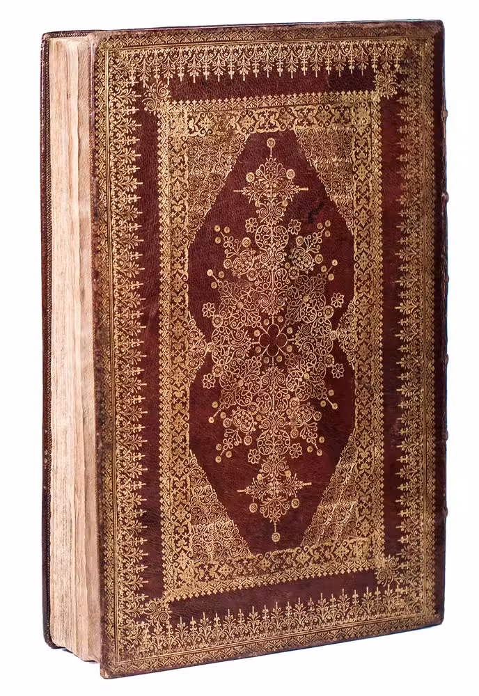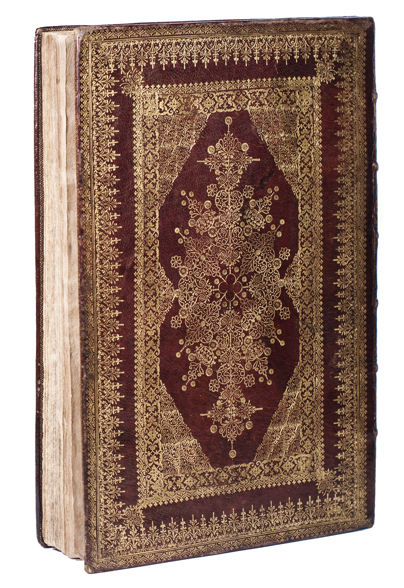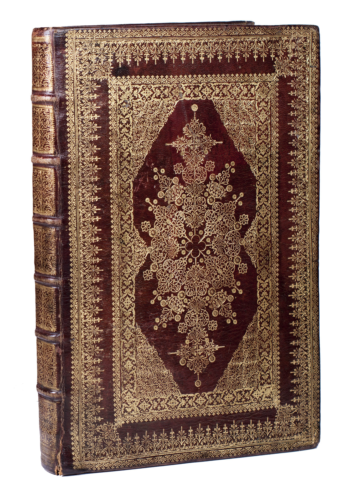The present work is bound in sumptuous contemporary red morocco, its boards covered with intricate gold tooling arranged in the refined pointillé and "a petit fers" French-inspired style of the second half of the 17th-century. The tooling is reminiscent of the work of celebrated French and Dutch binders like le Gascon (only known by this nickname), Florimond Badier, and Albert Magnus.